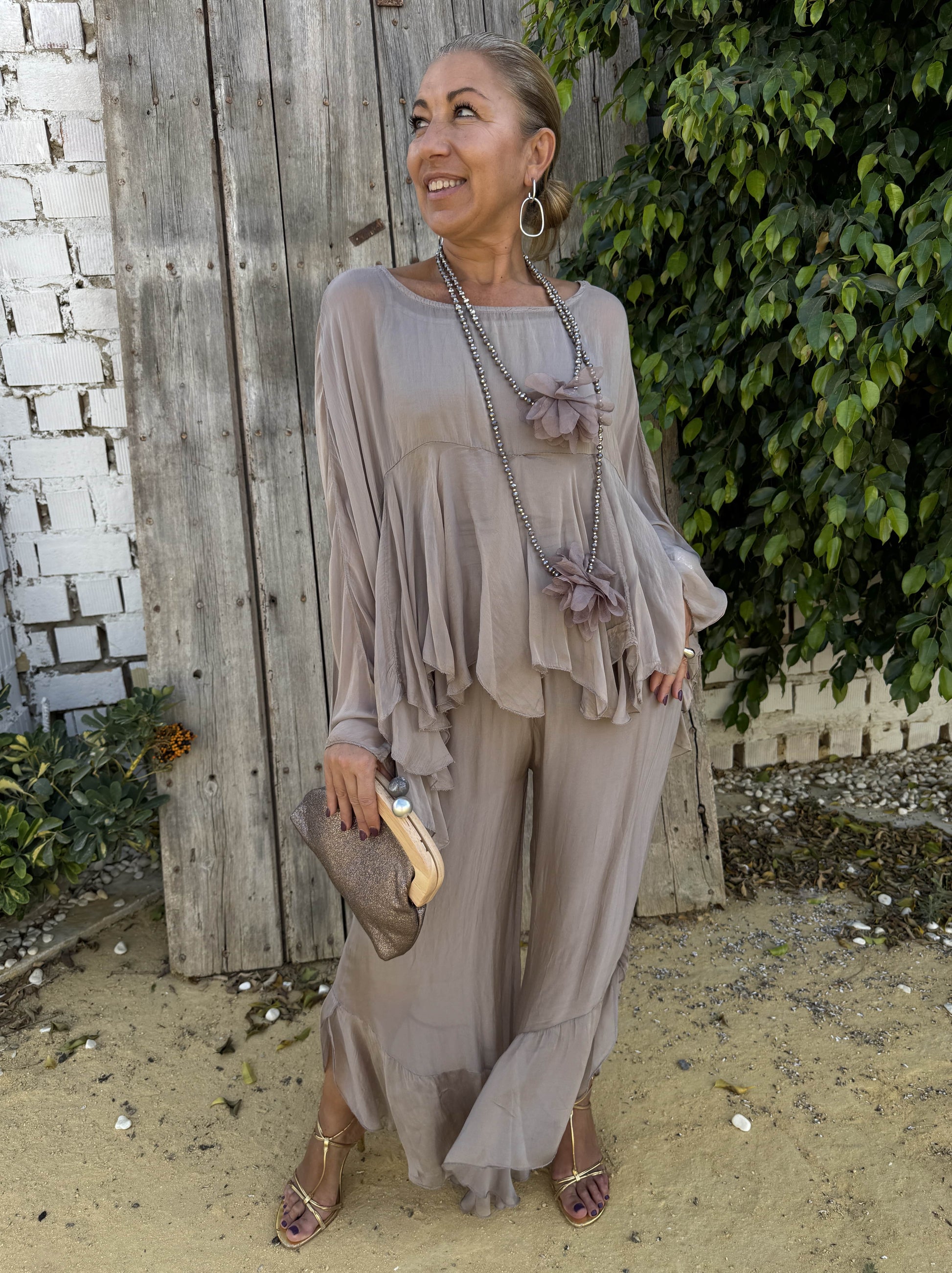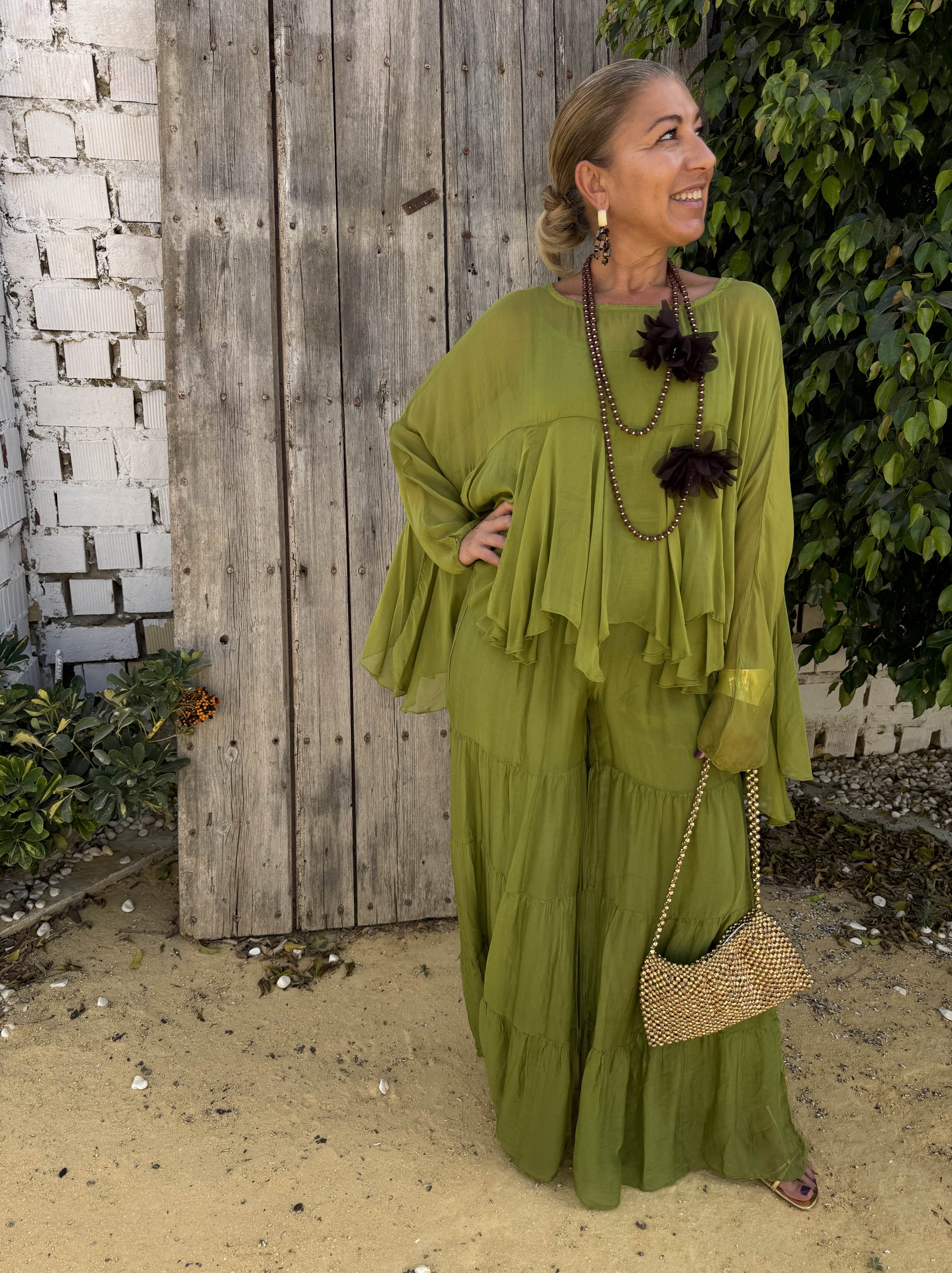 Conjunto de blusa y pantalón fluido fabricado con viscosa y seda.