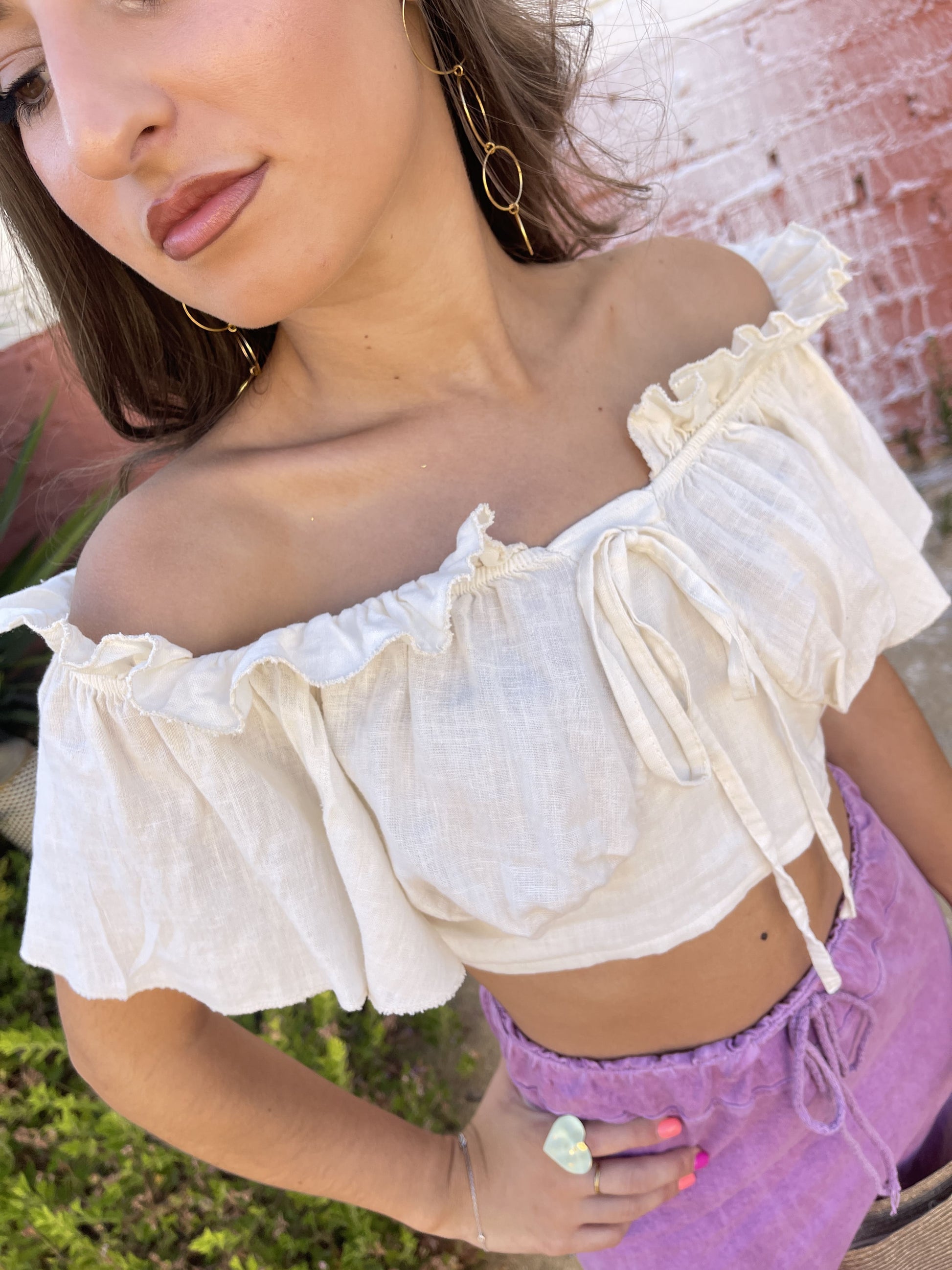 Crop top beige de manga corta con volante en la zona superior y en las mangas.