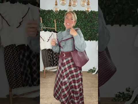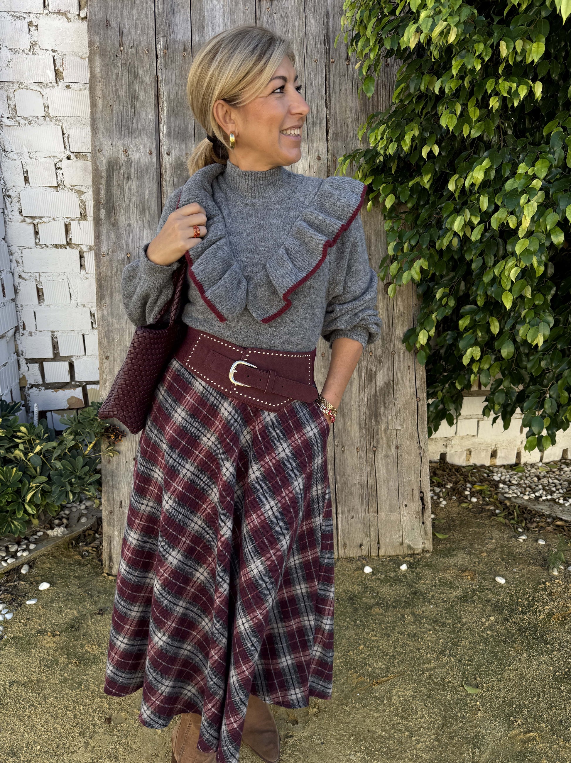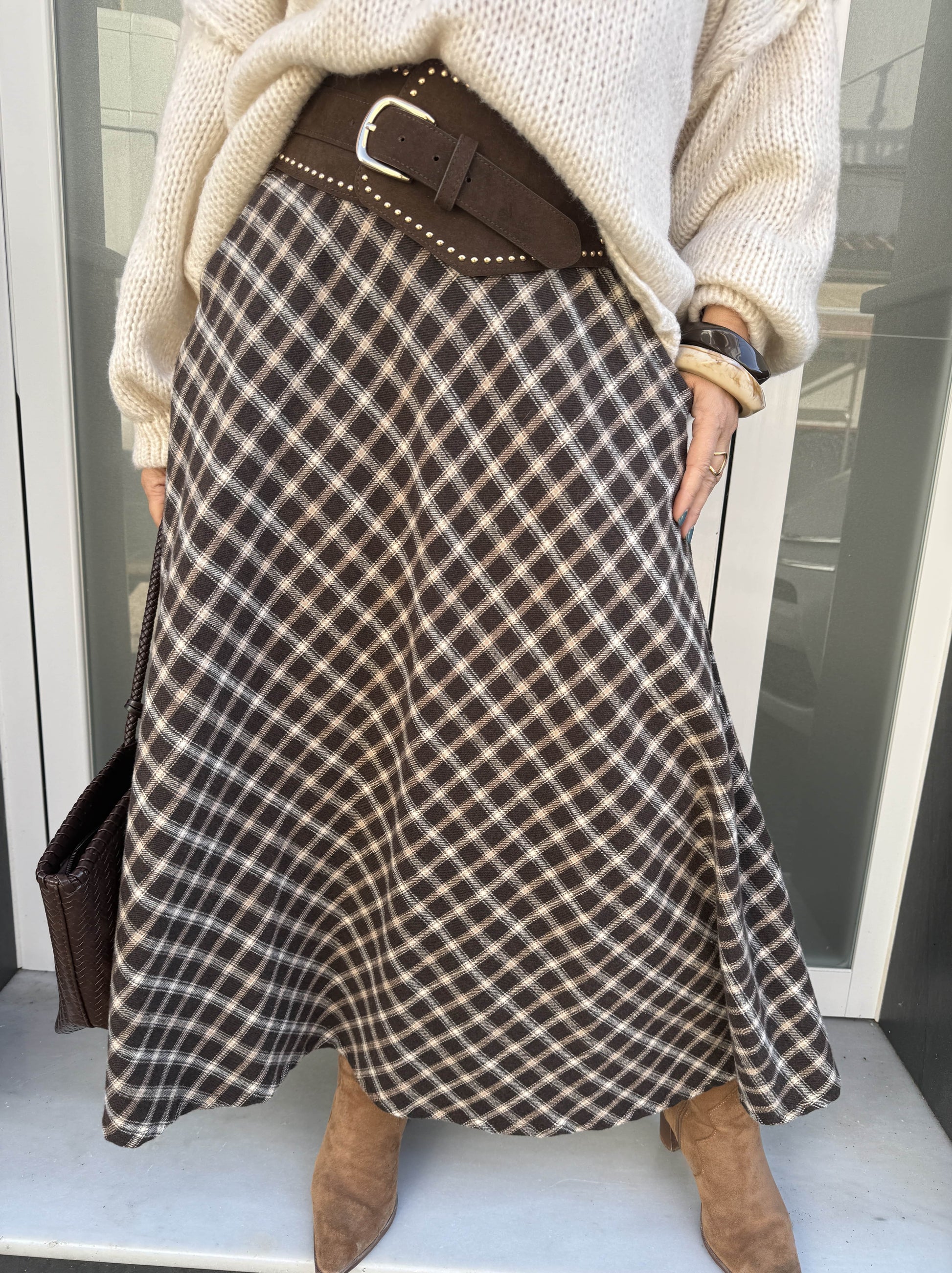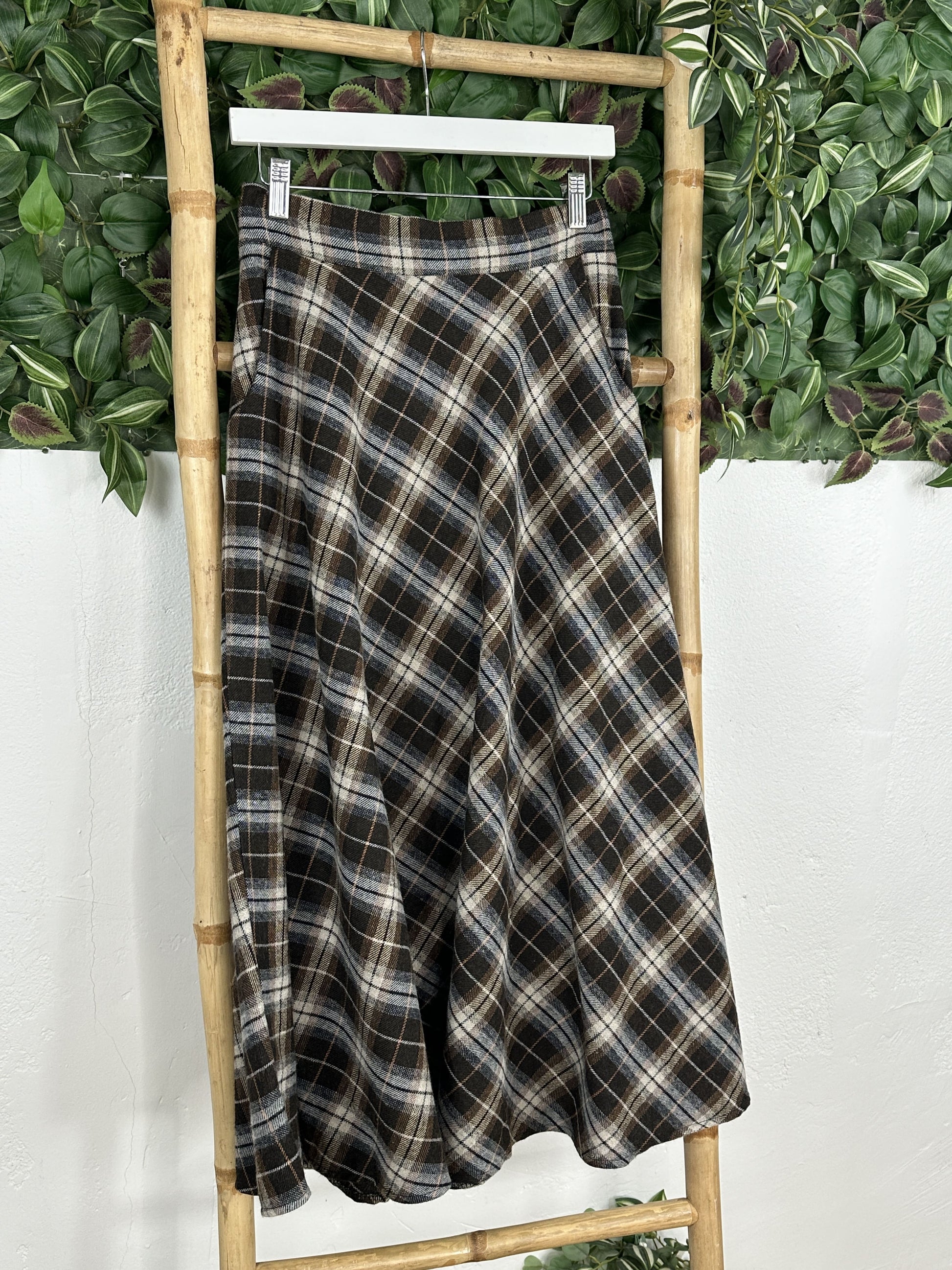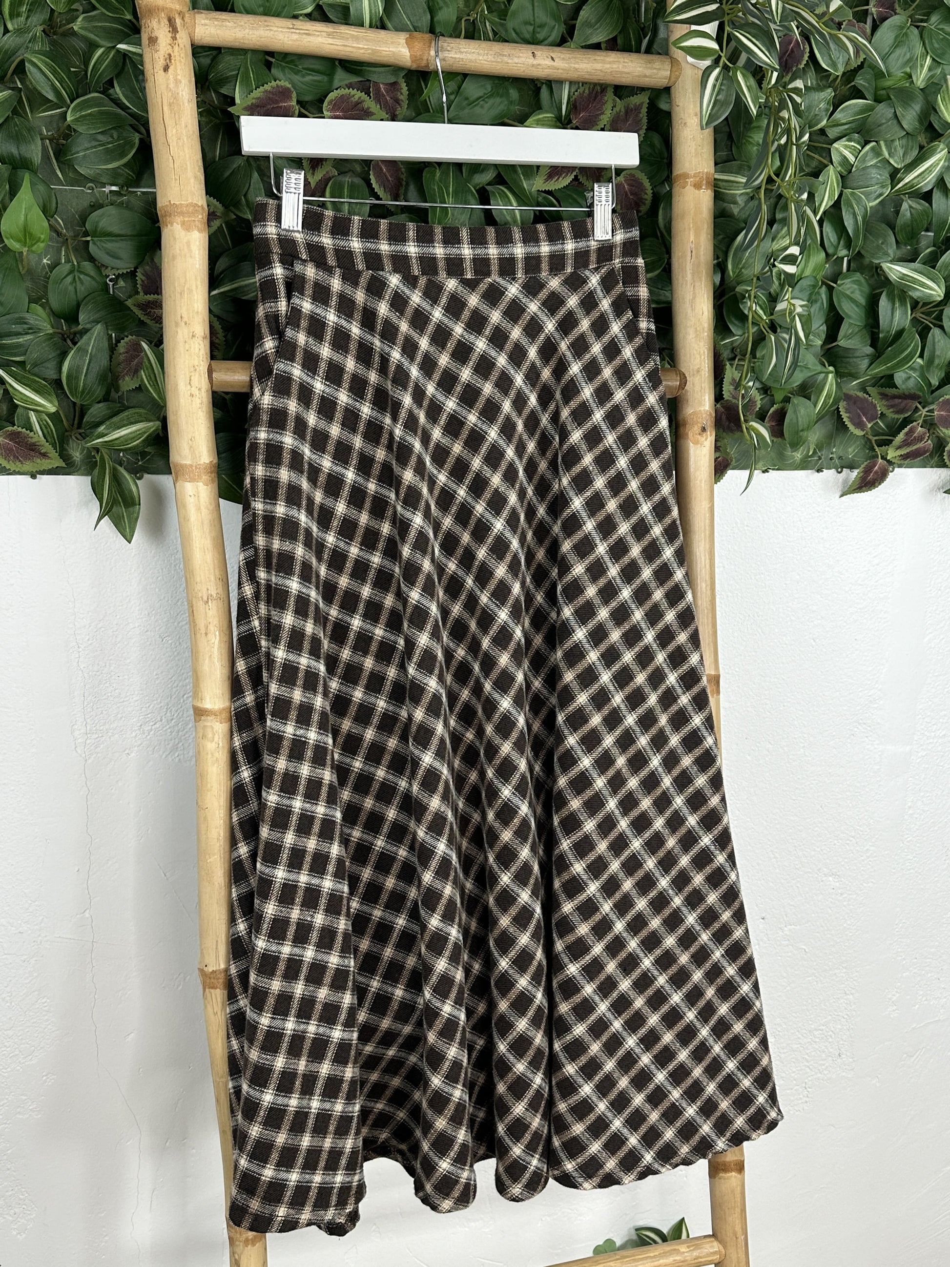 Falda de corte evasé estampada de cuadros y bolsillos a ambos lados de la falda.