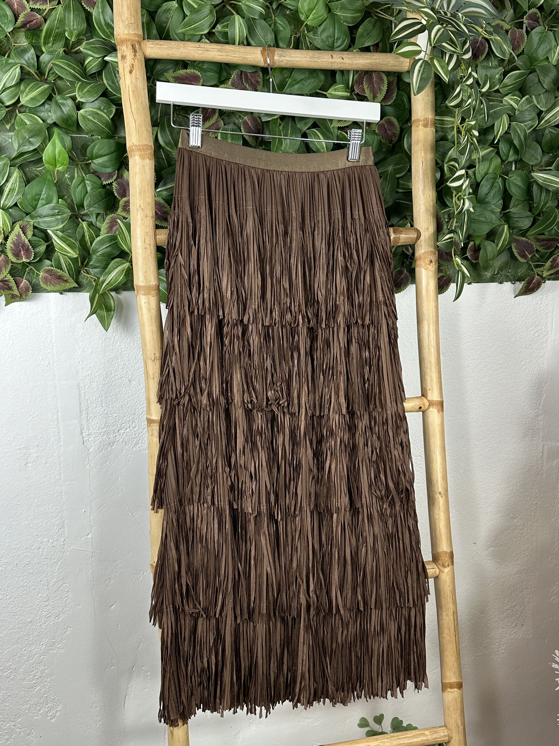 Falda larga de flecos con cinturilla elástica con efecto satinado.