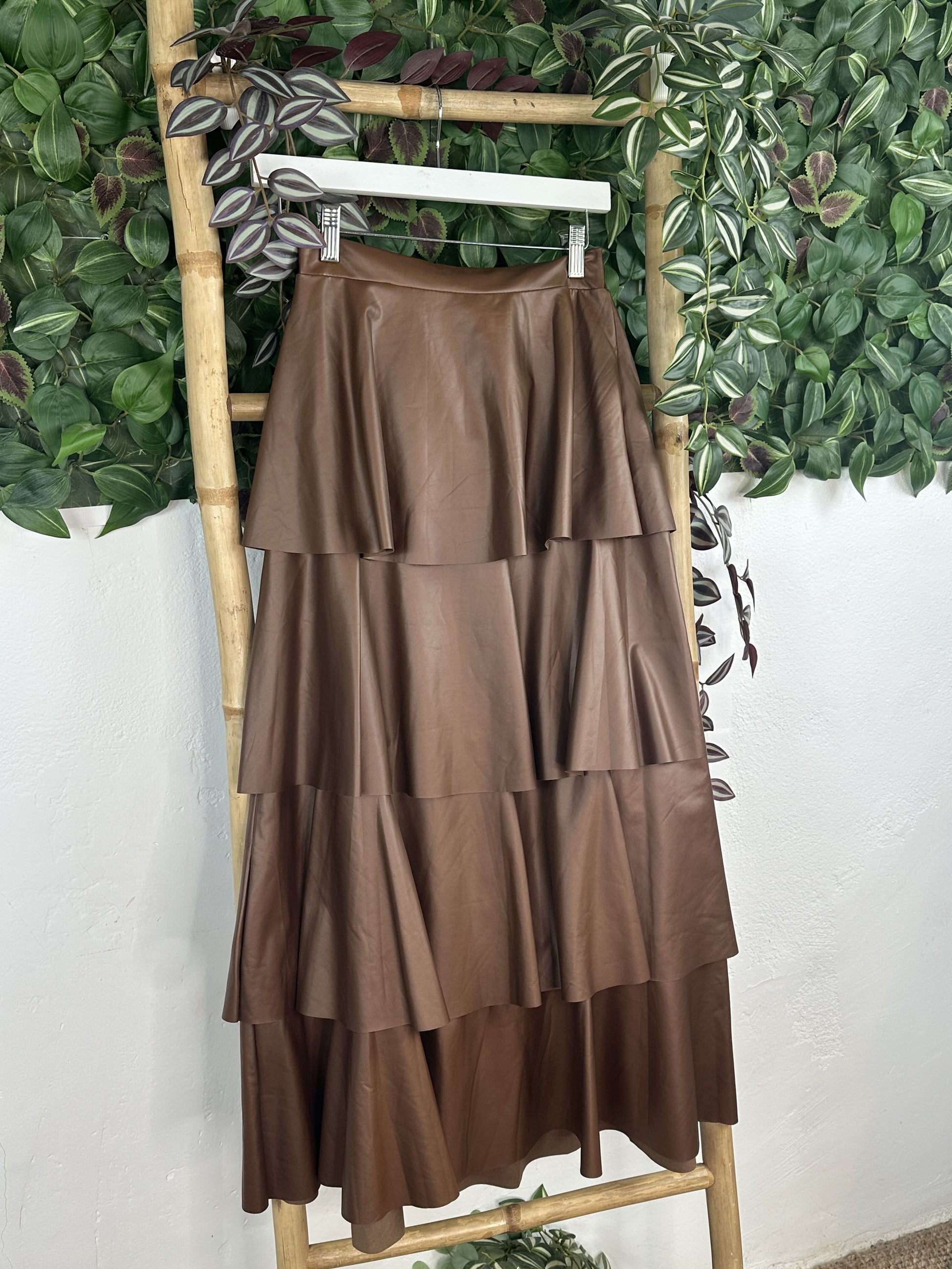 Falda larga de polipiel con volantes tanto en la zona delantera como en la trasera.