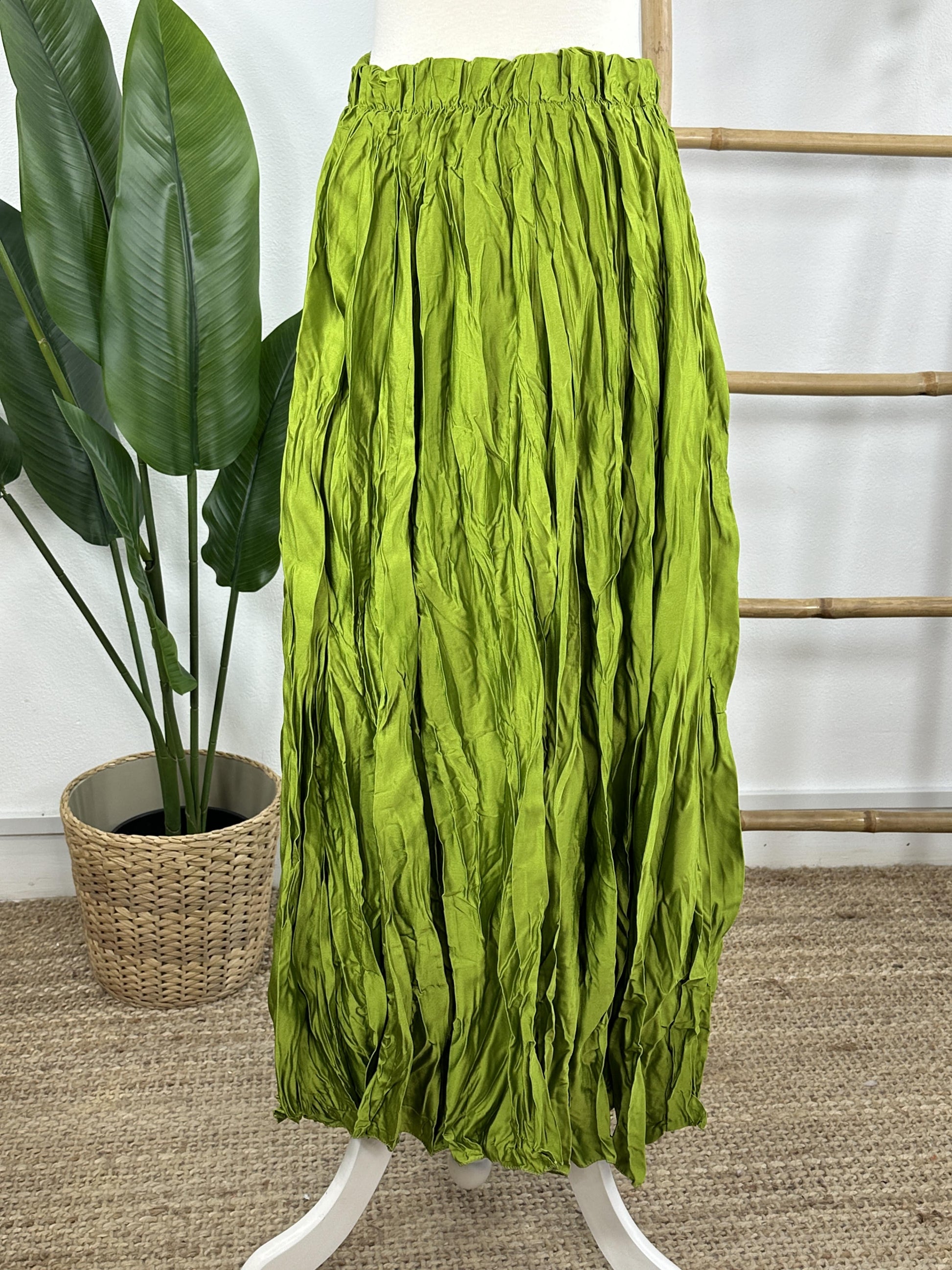 Falda larga satinada con efecto arrugado.
