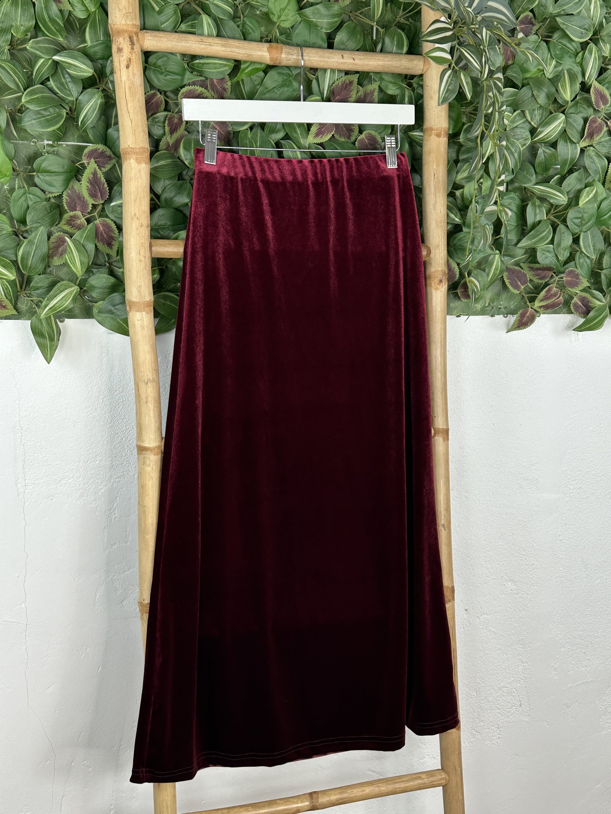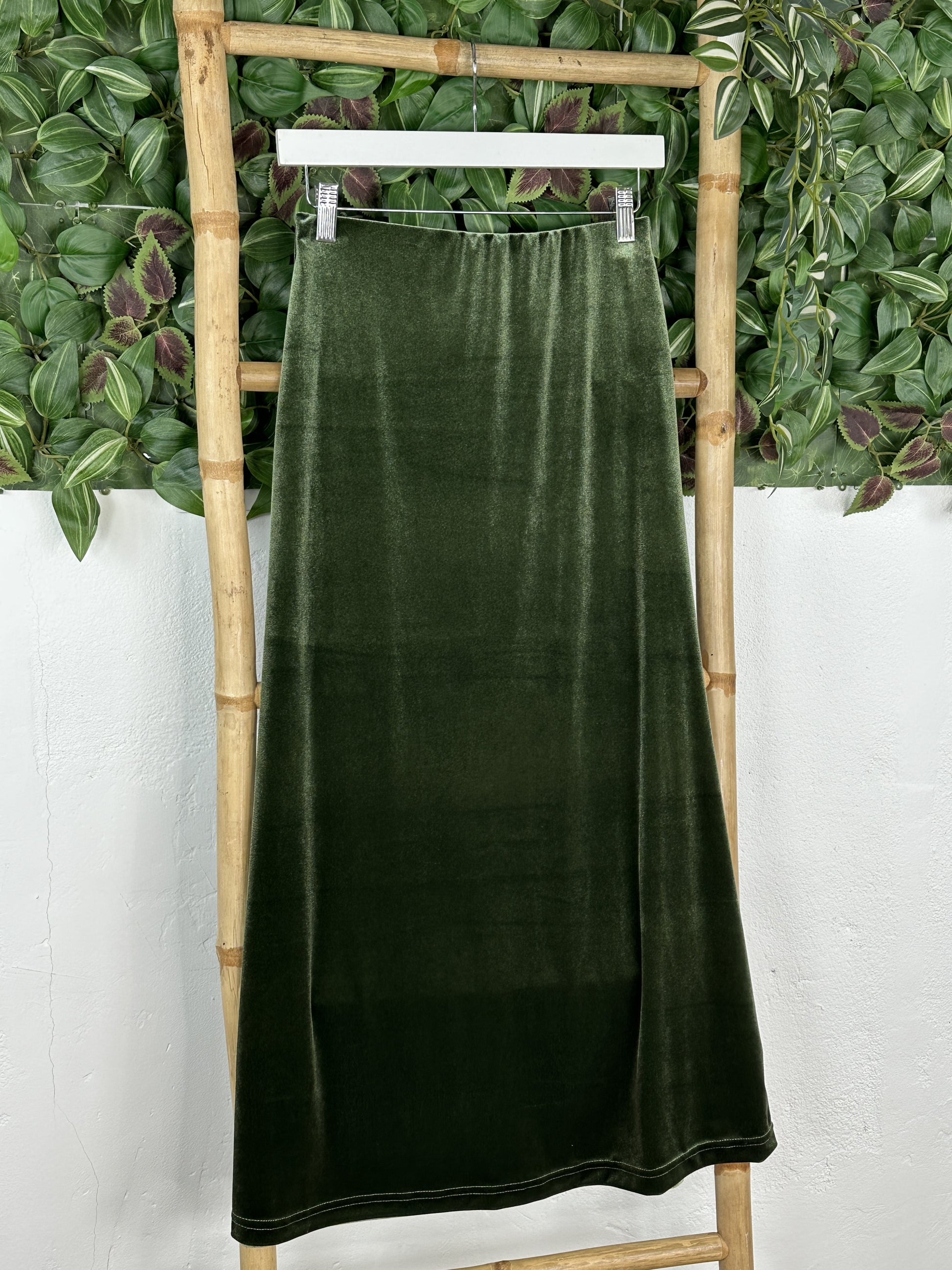 Esta falda velvet está disponible en color verde, negro, gris y burdeos.