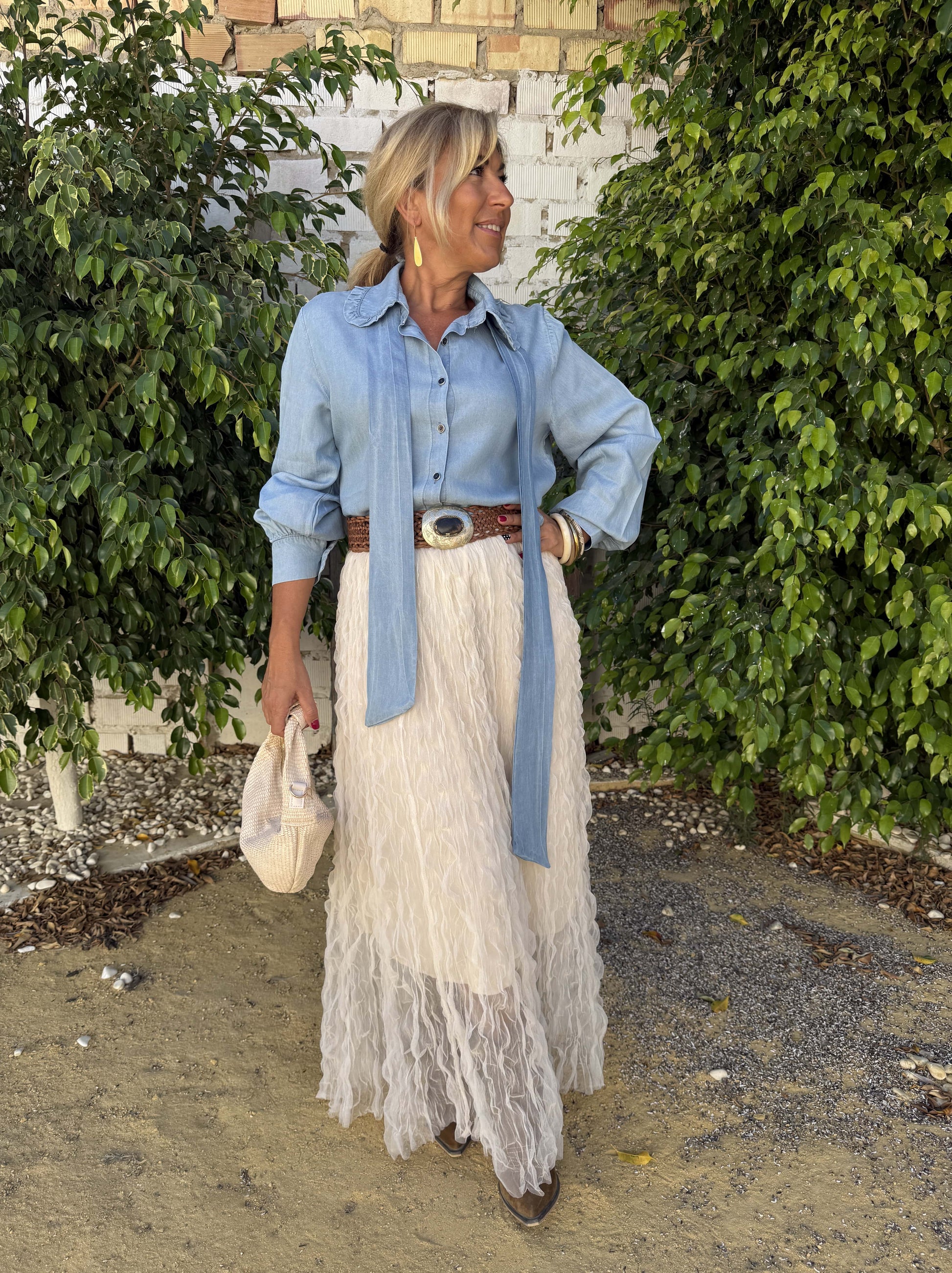 Falda larga de tul en forma de ondas.
