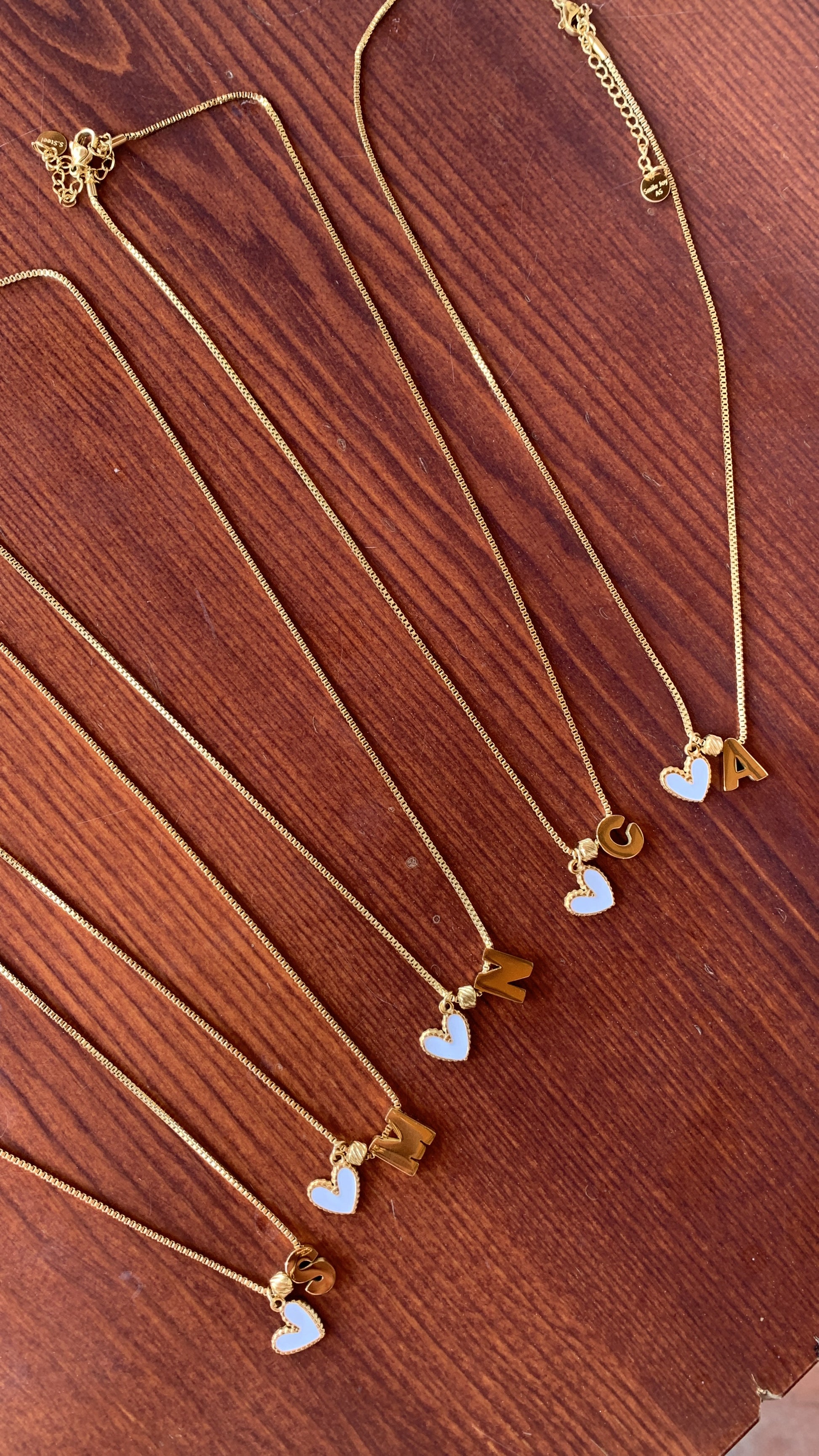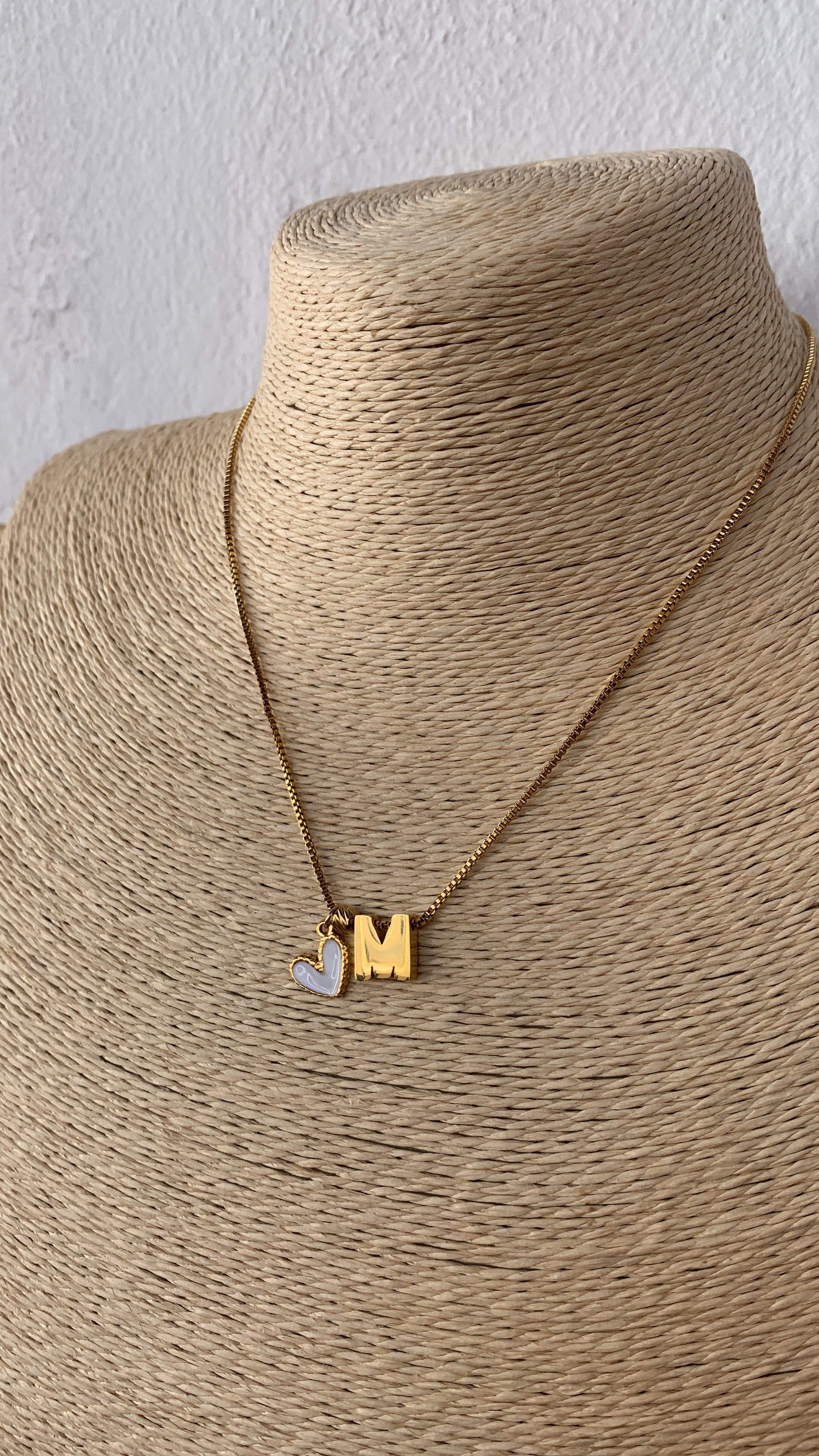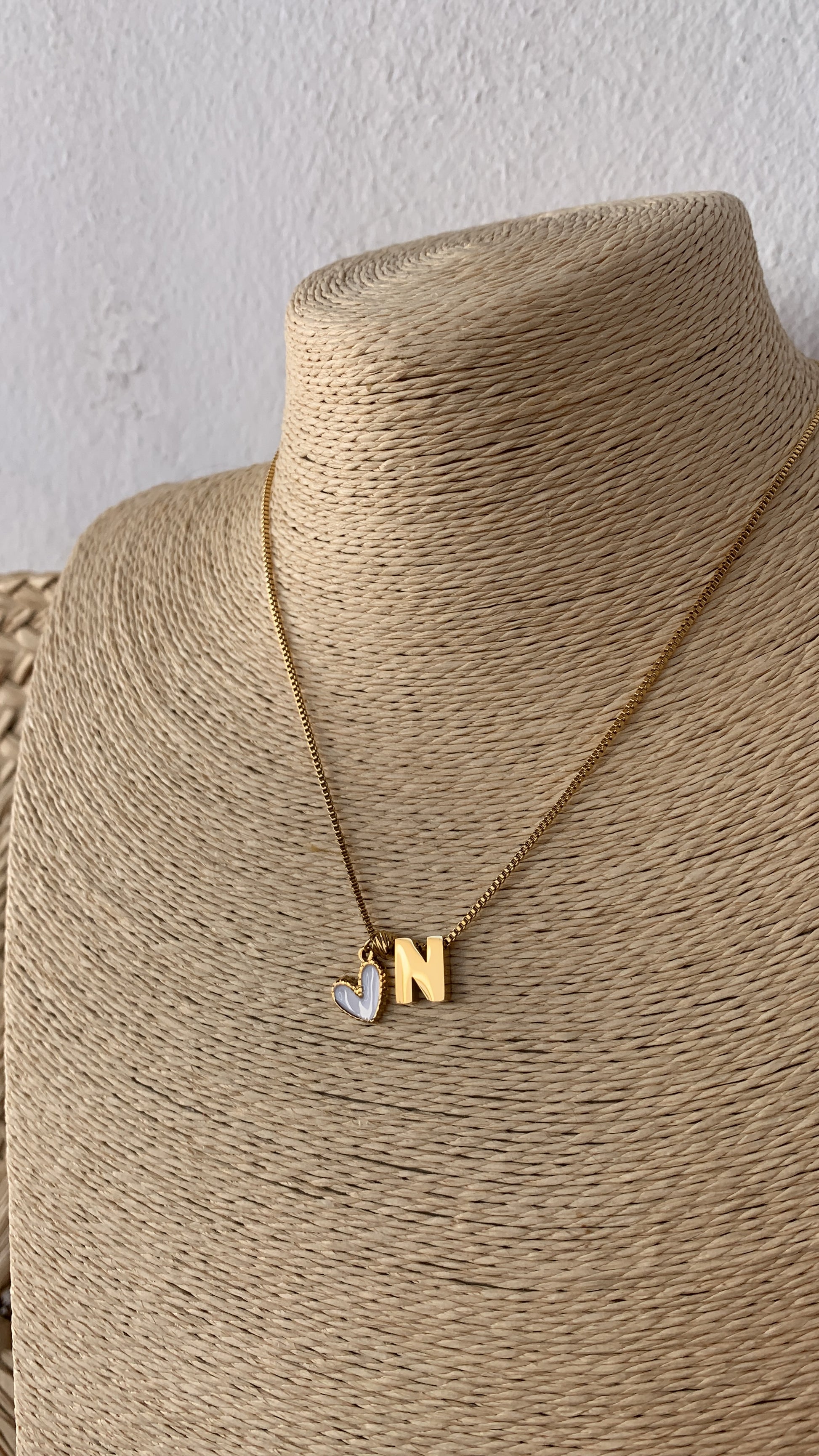 Colgante de corazón blanco al lado de la letra.