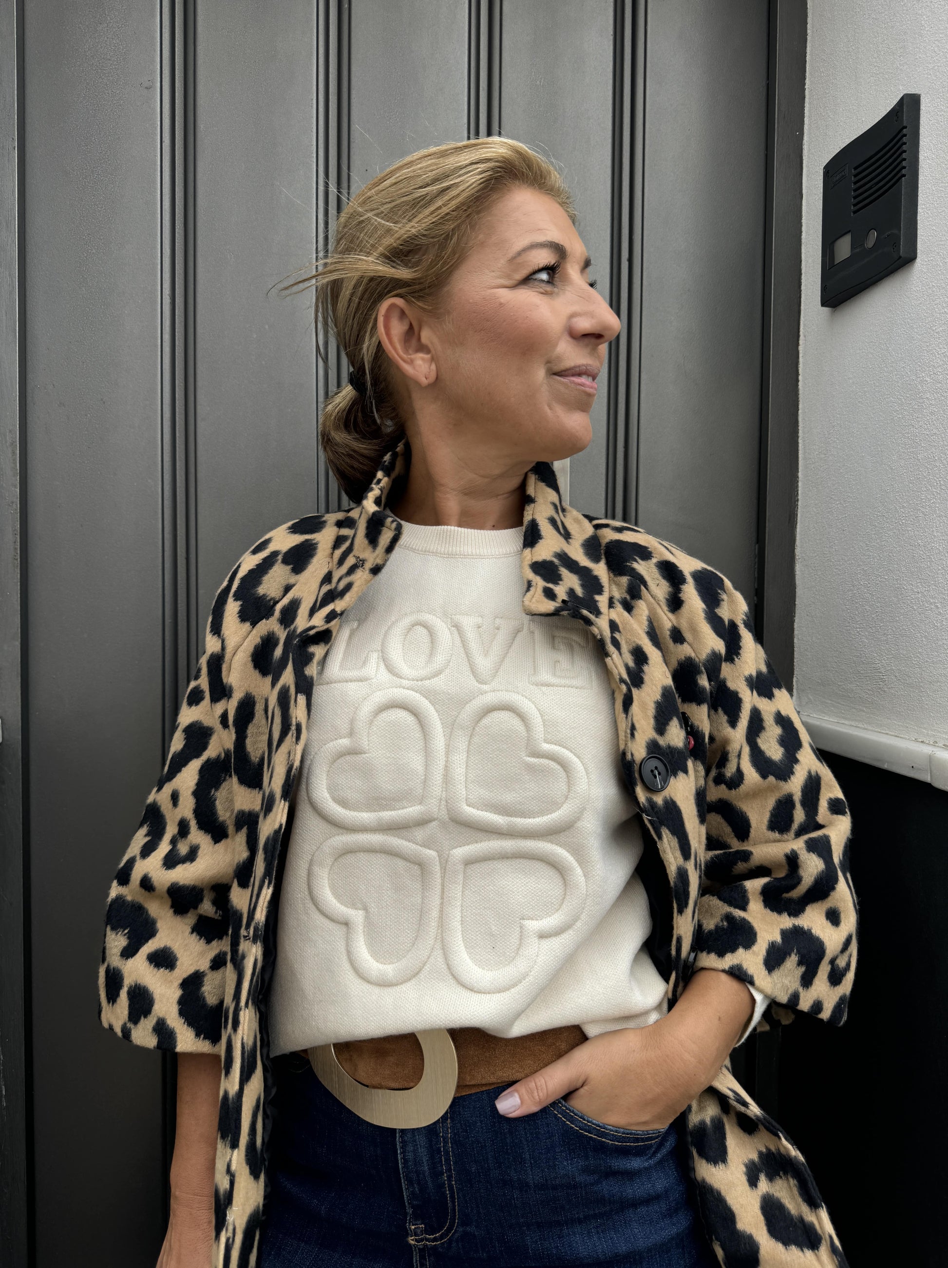 En la parte frontal se puede ver la palabra love y la forma de un trébol en relieve.
