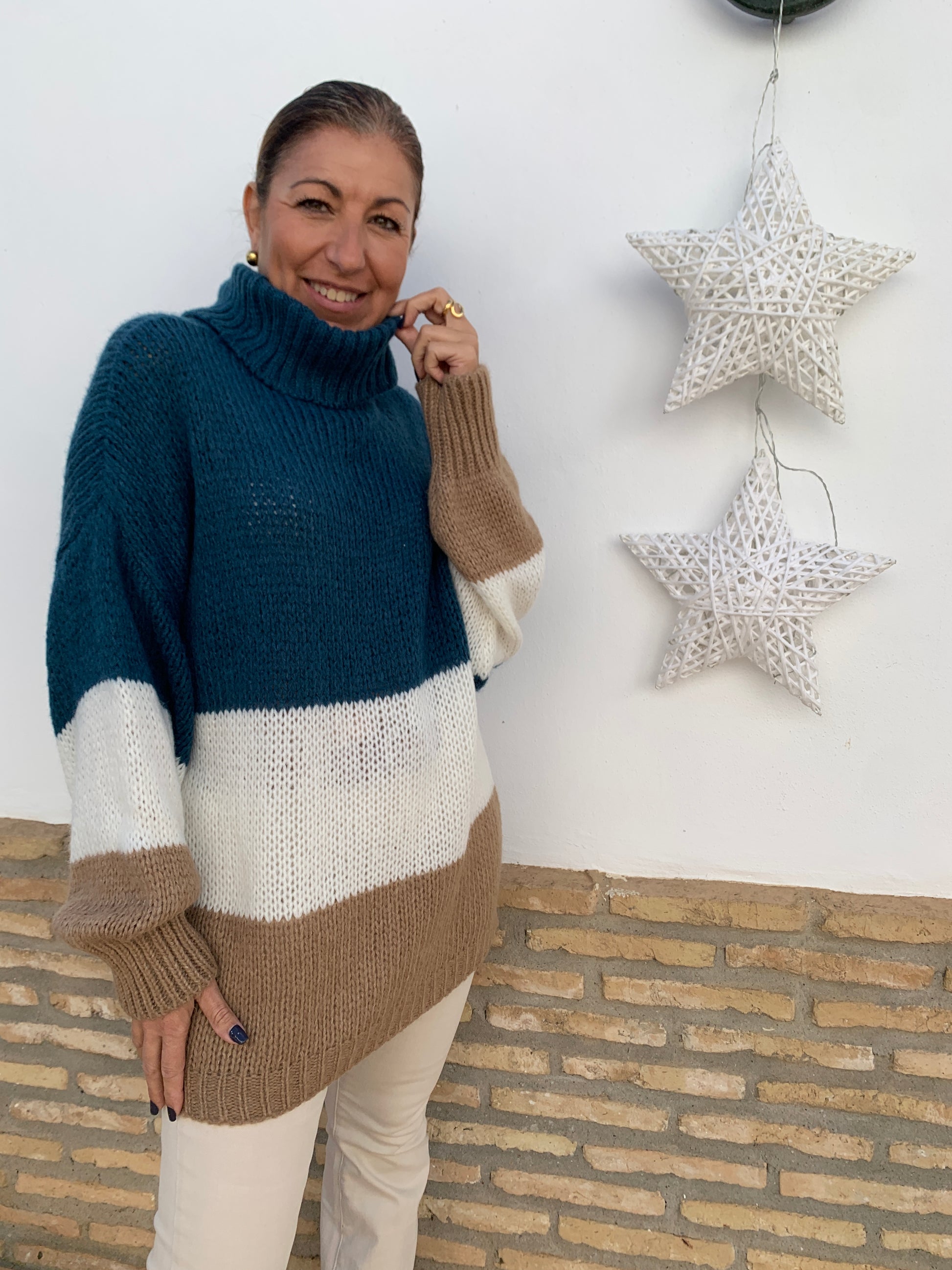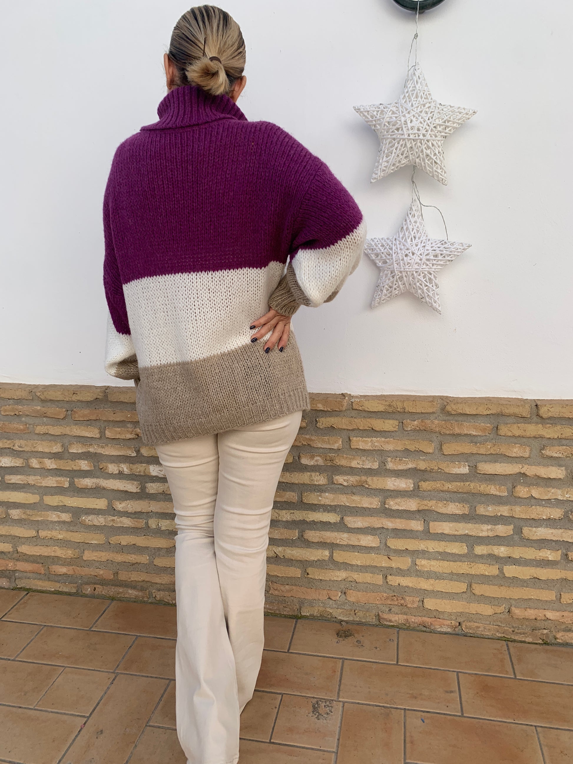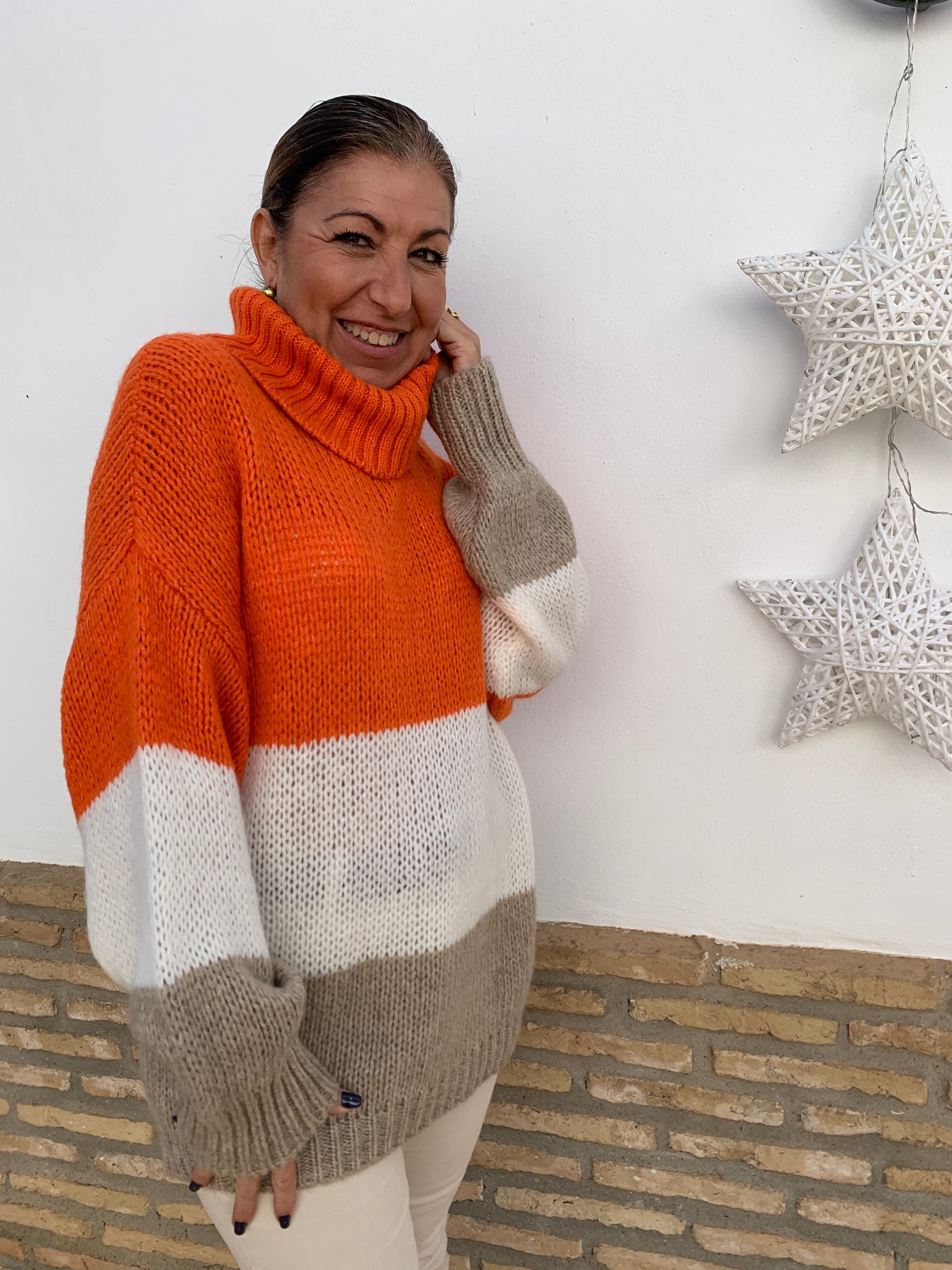 Jersey de punto de punto de rayas con cuello vuelto, manga larga y puño ajustado. Este jersey de mujer está disponible en naranja, morado, azul pavo y verde cacería.