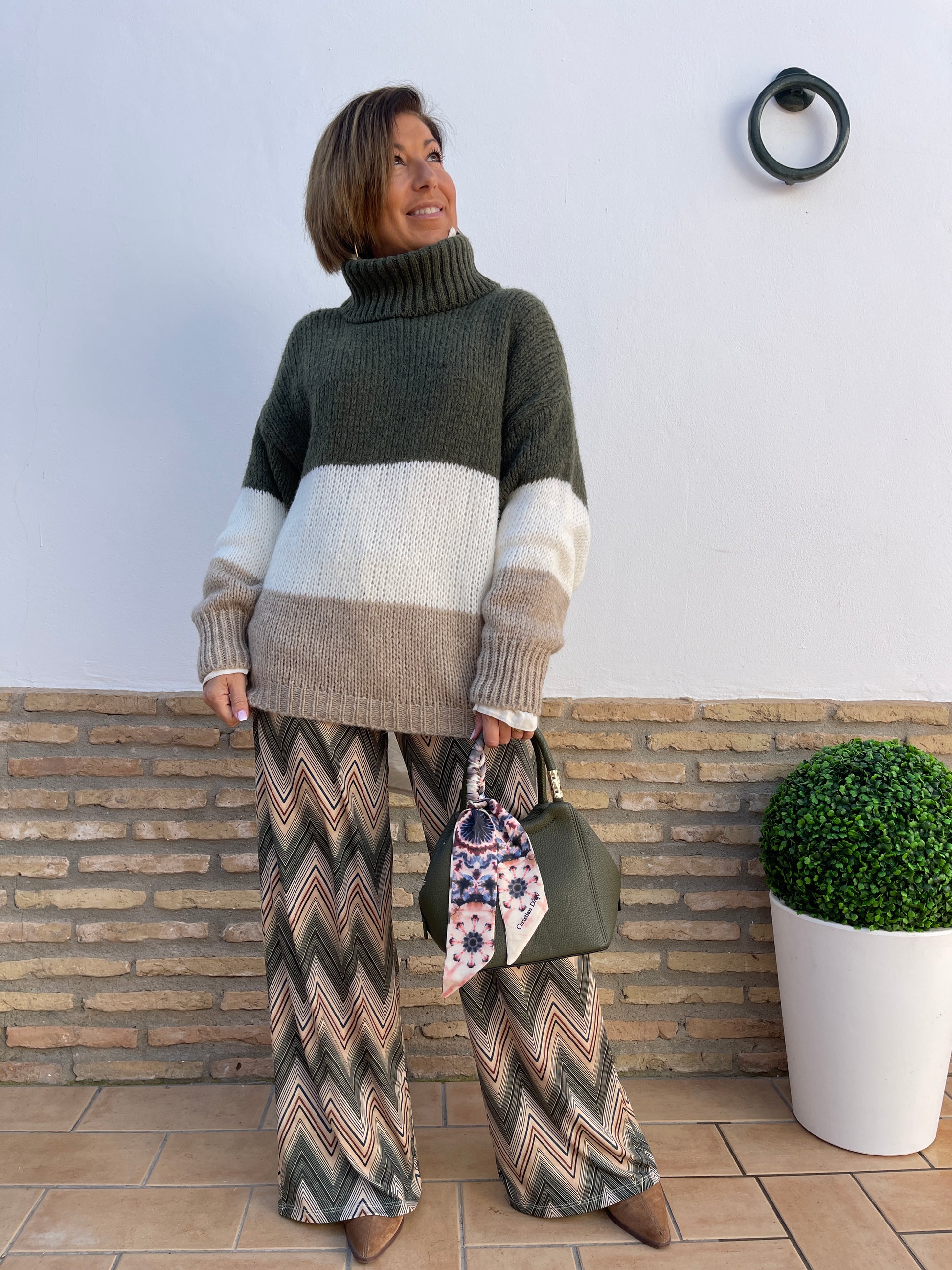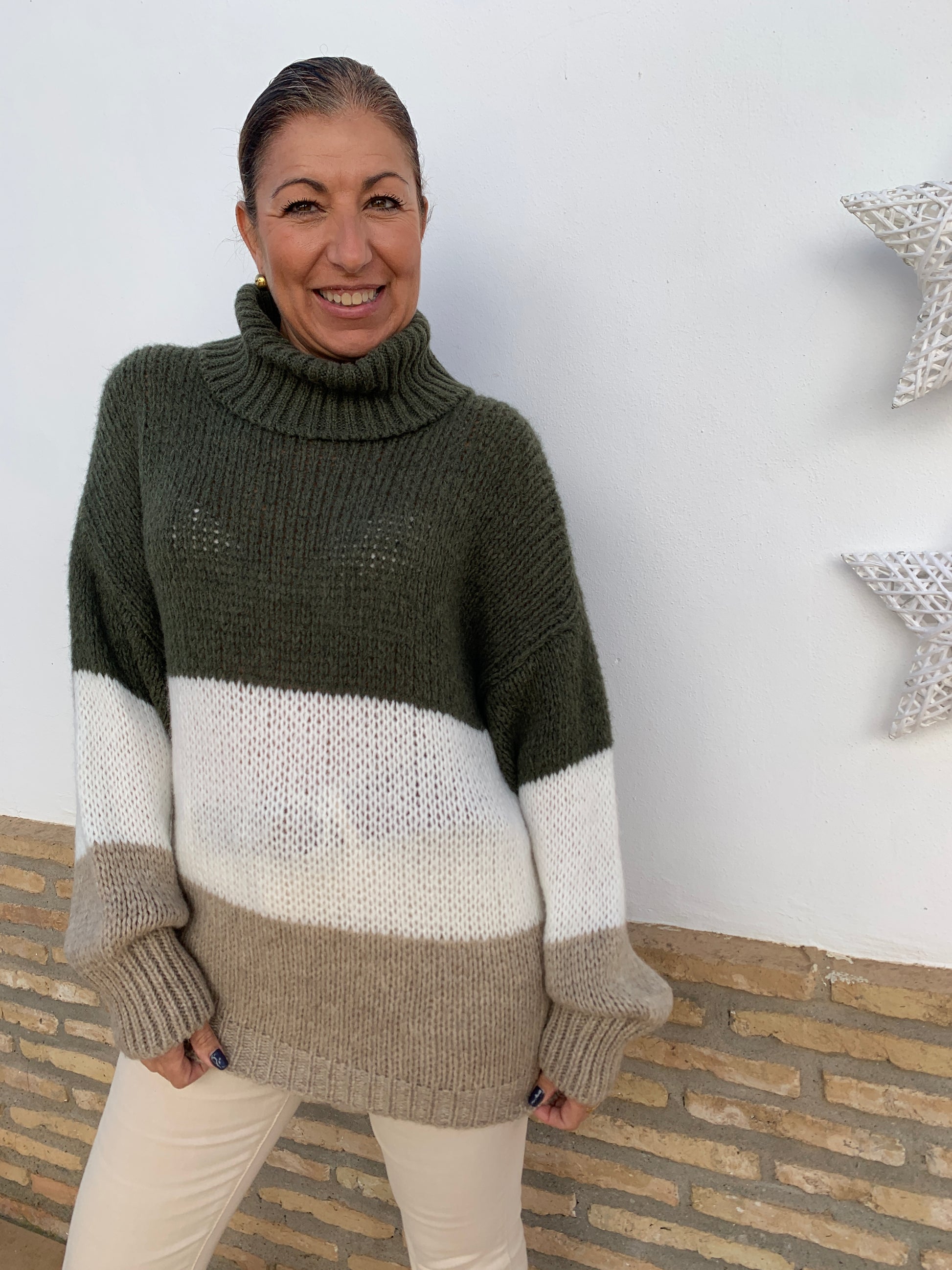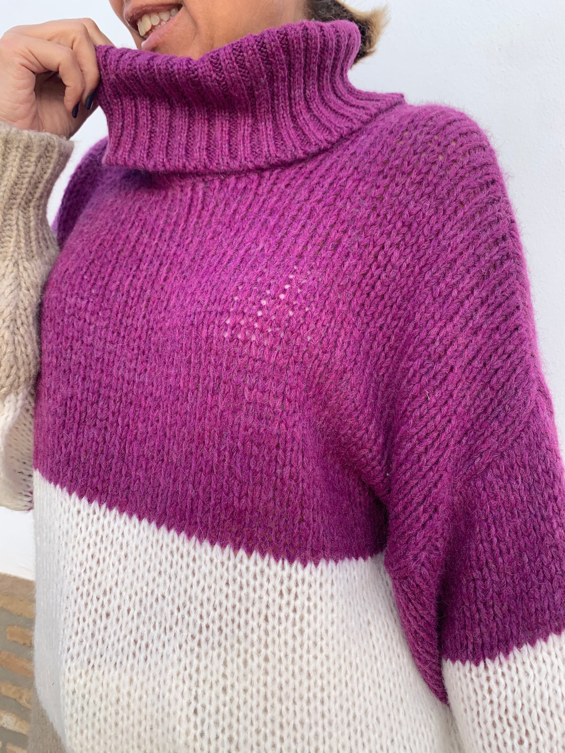 Jersey de punto de punto de rayas con cuello vuelto, manga larga y puño ajustado. Este jersey de mujer está disponible en naranja, morado, azul pavo y verde cacería.