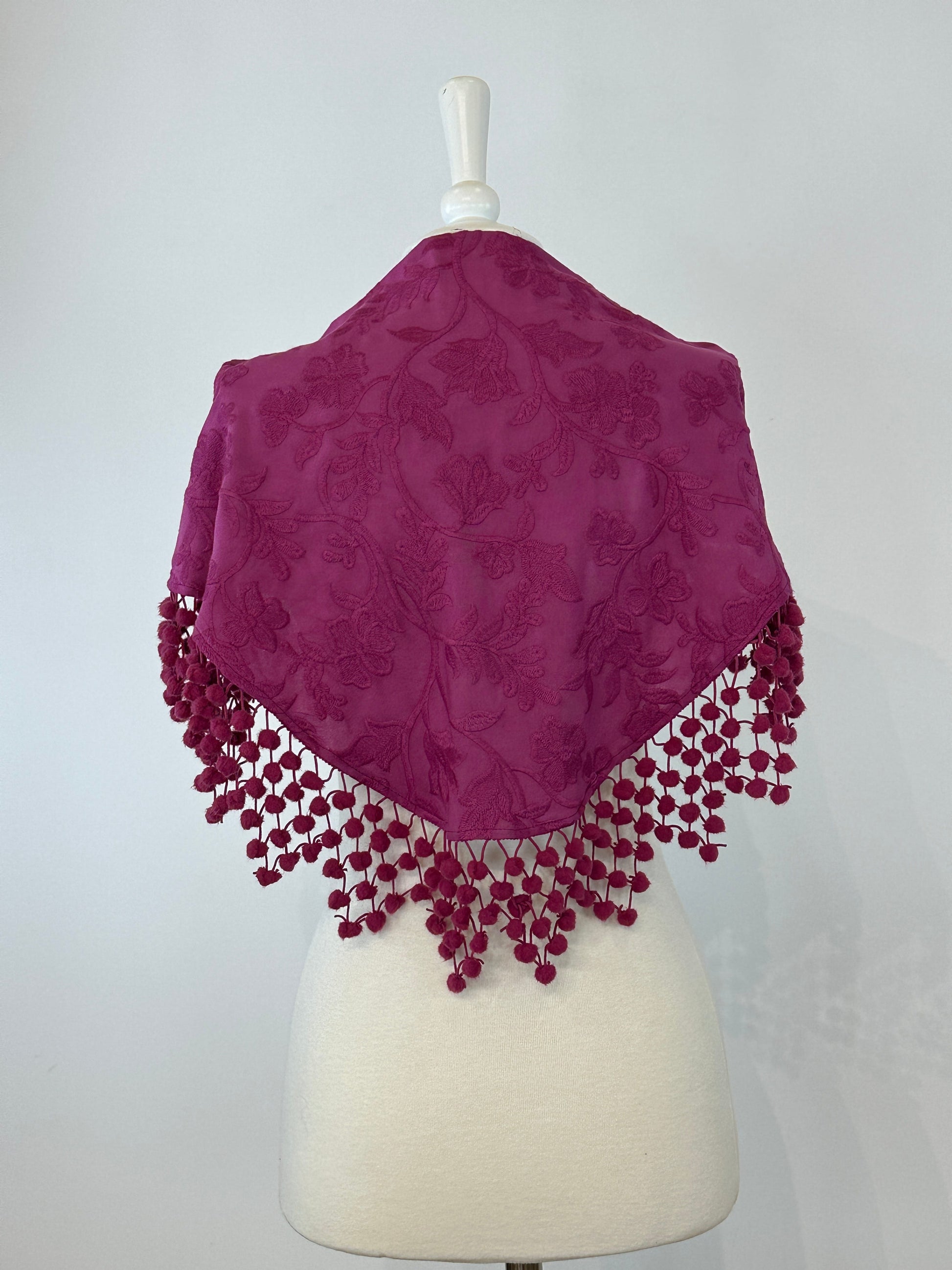 El mantoncillo de flamenca bordado con flores y madroños en forma de pico.