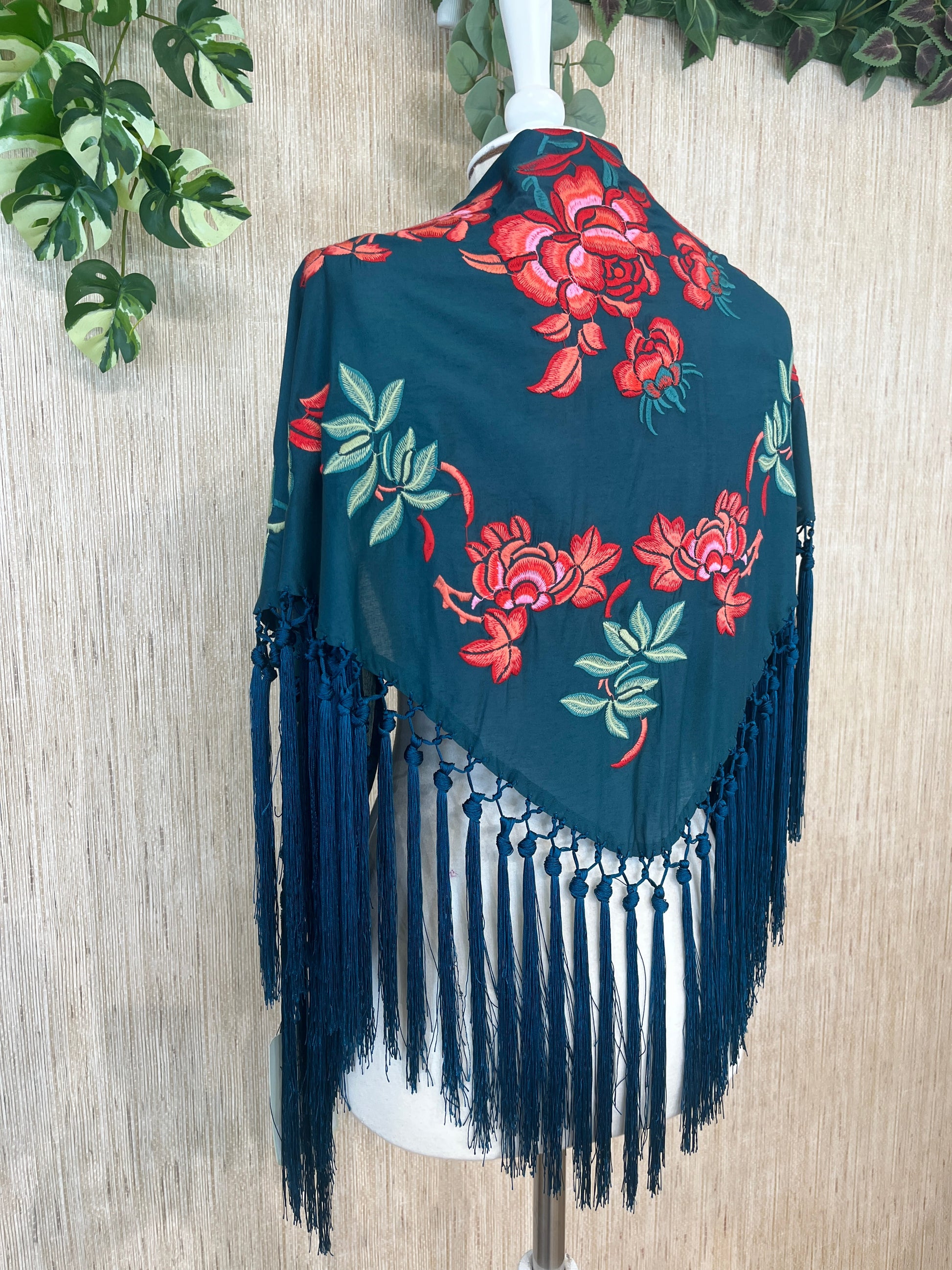 Mantoncillo estampado con flores bordadas de colores y flecos.