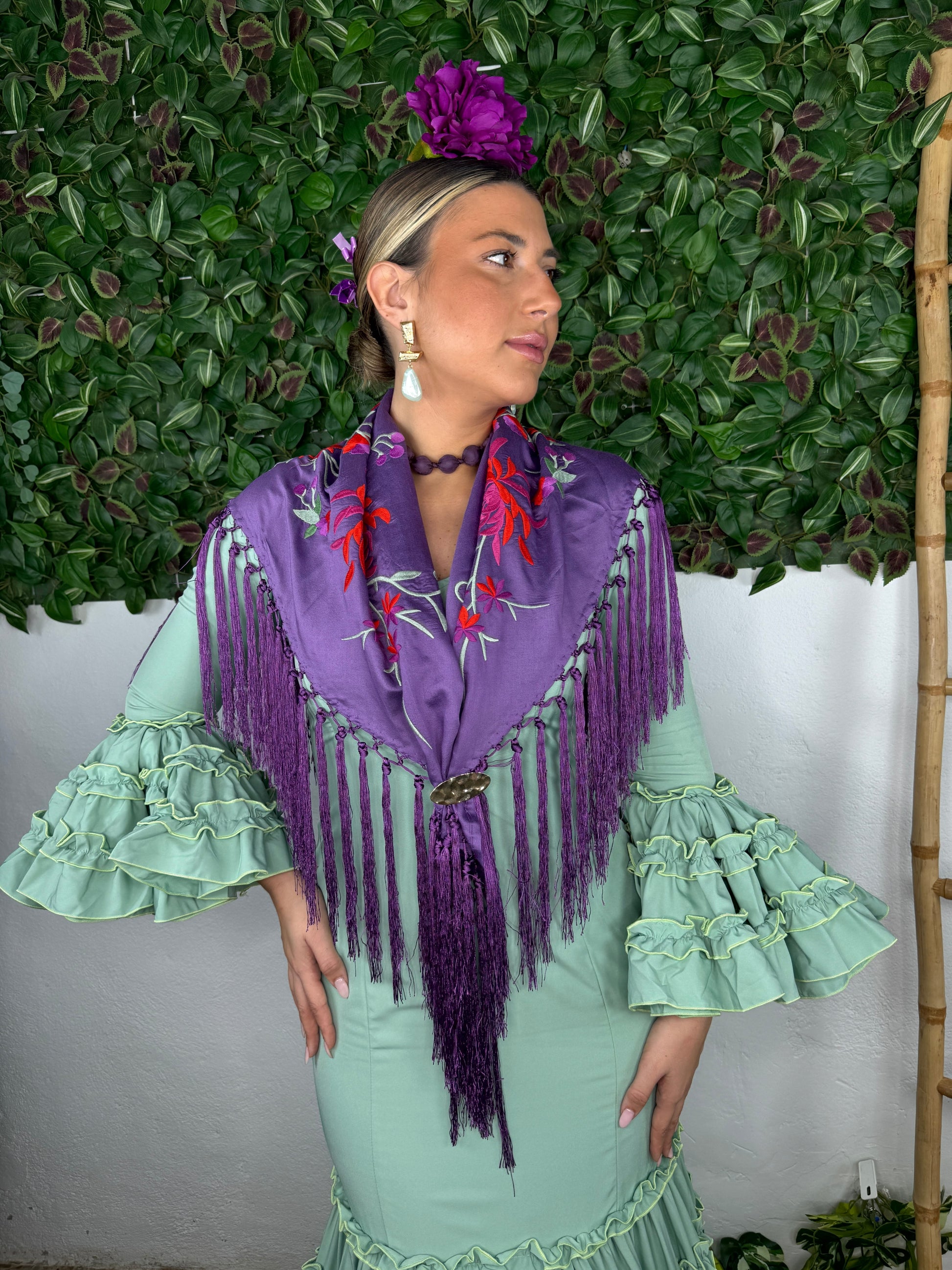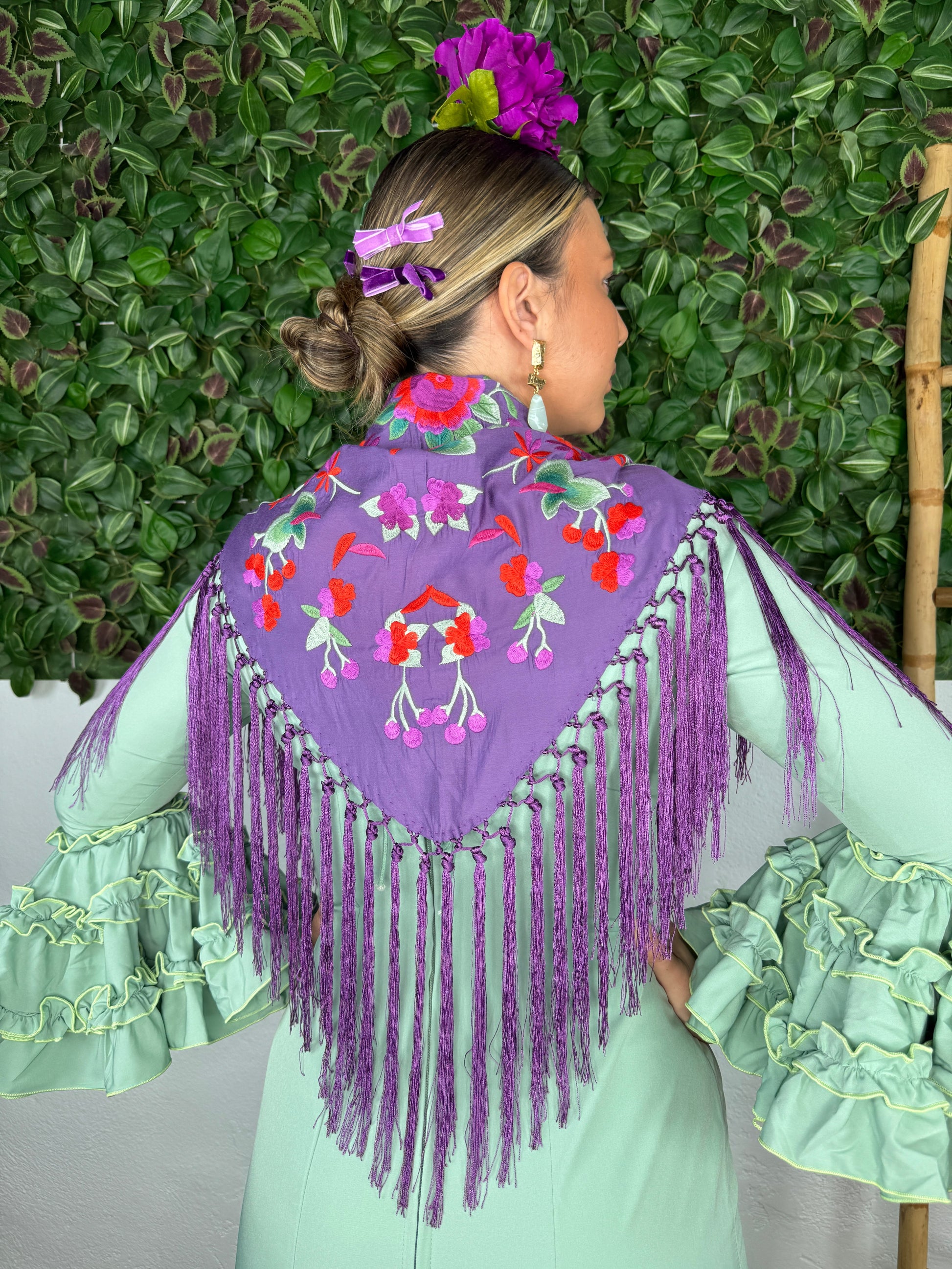 Mantoncillo estampado con flores bordadas de colores y flecos.