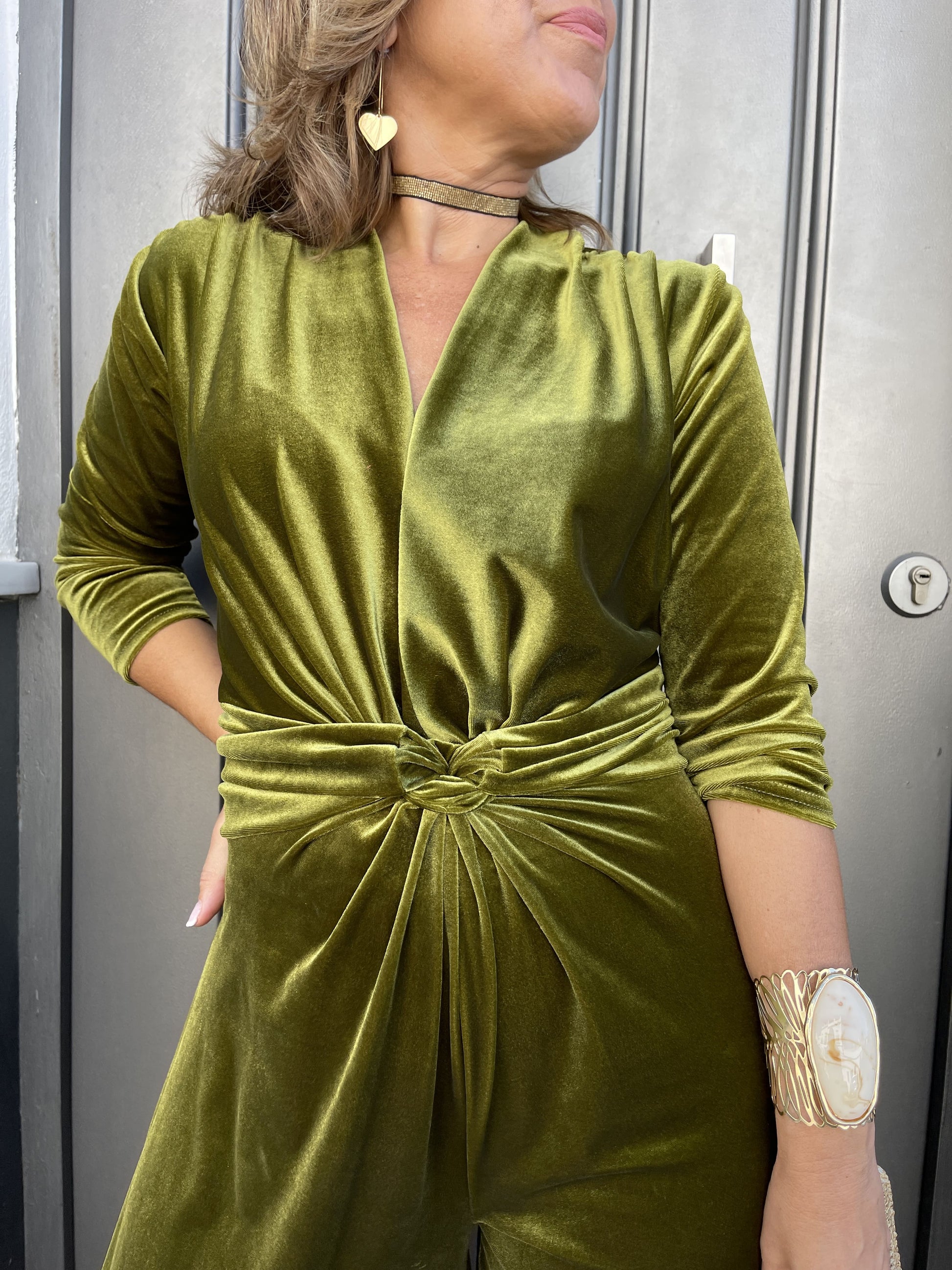 Mono de mujer de terciopelo con escote de pico, manga larga y nudo delantero.