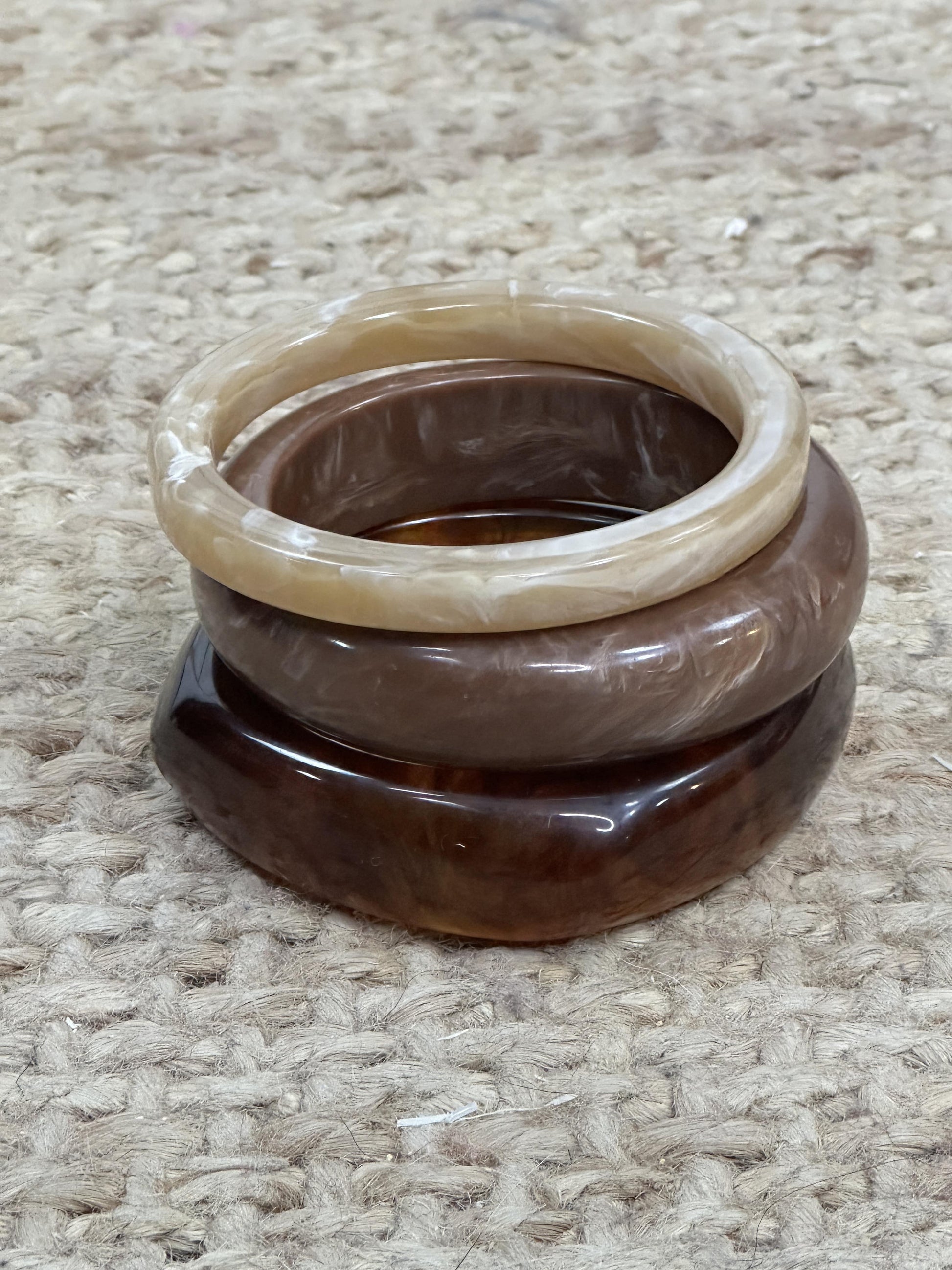 Pack de 3 pulseras de resina con diferentes formas.
