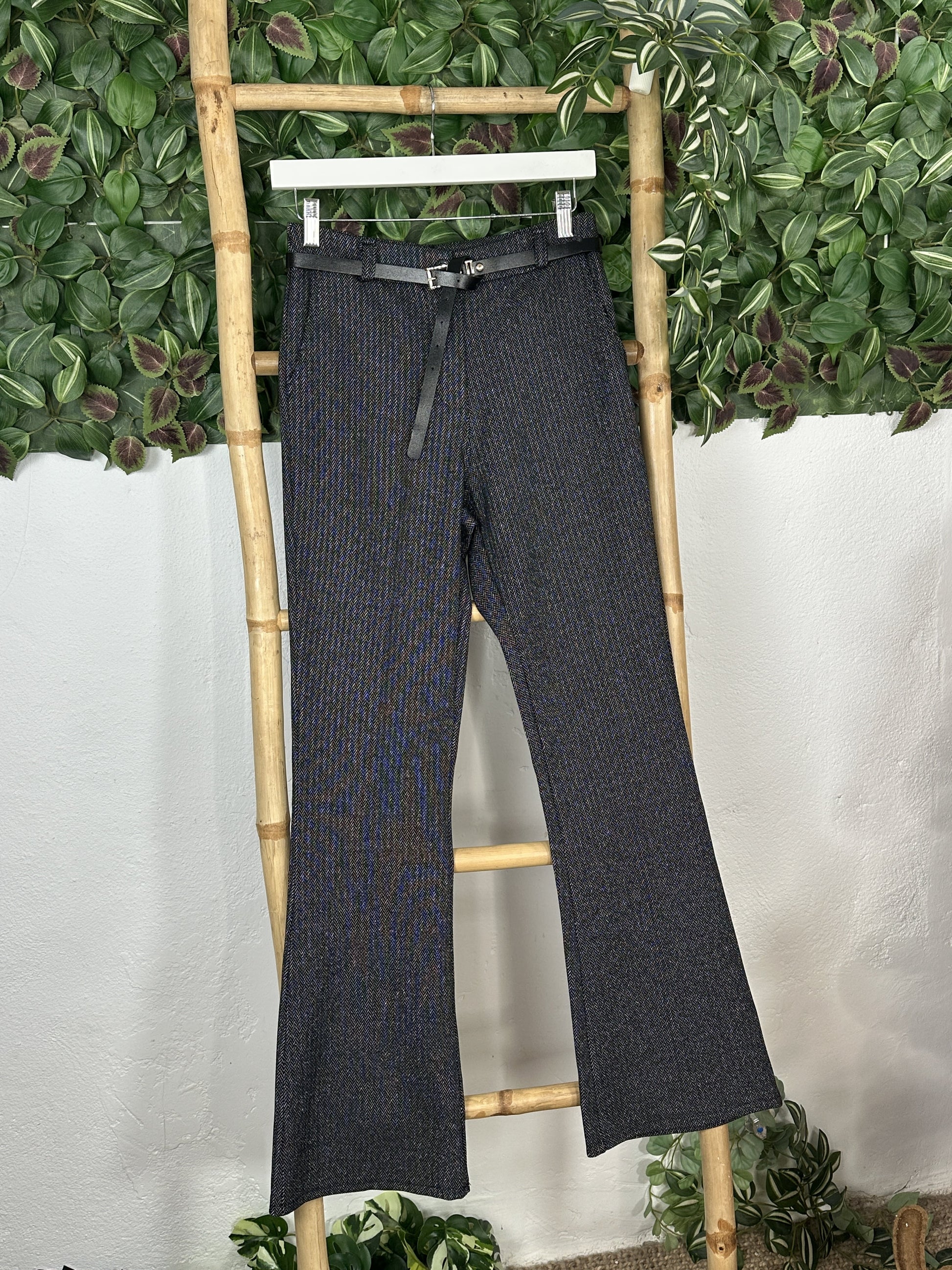Pantalón de campana con estampado de hilo de brillo plateado en forma de espiga.