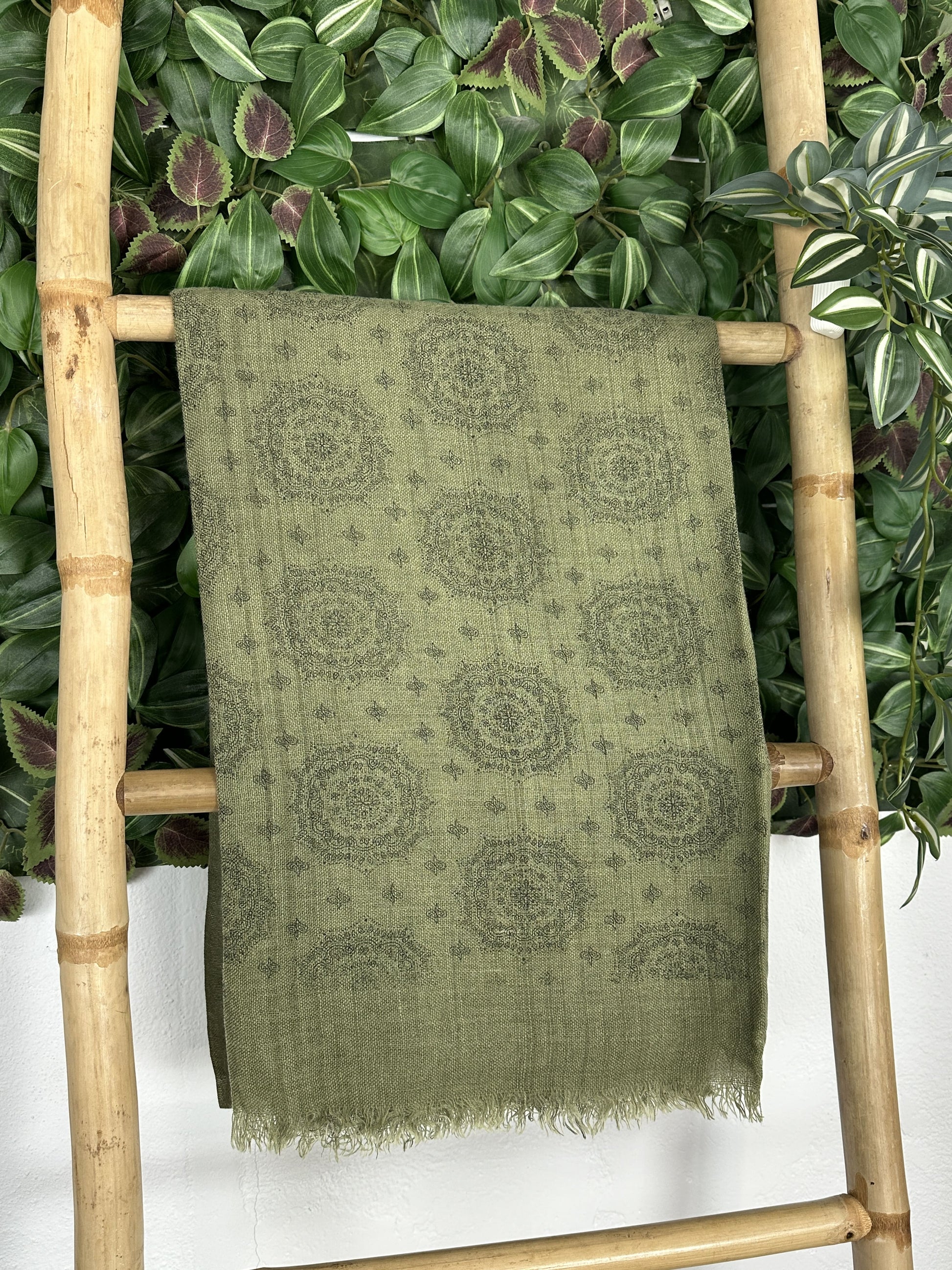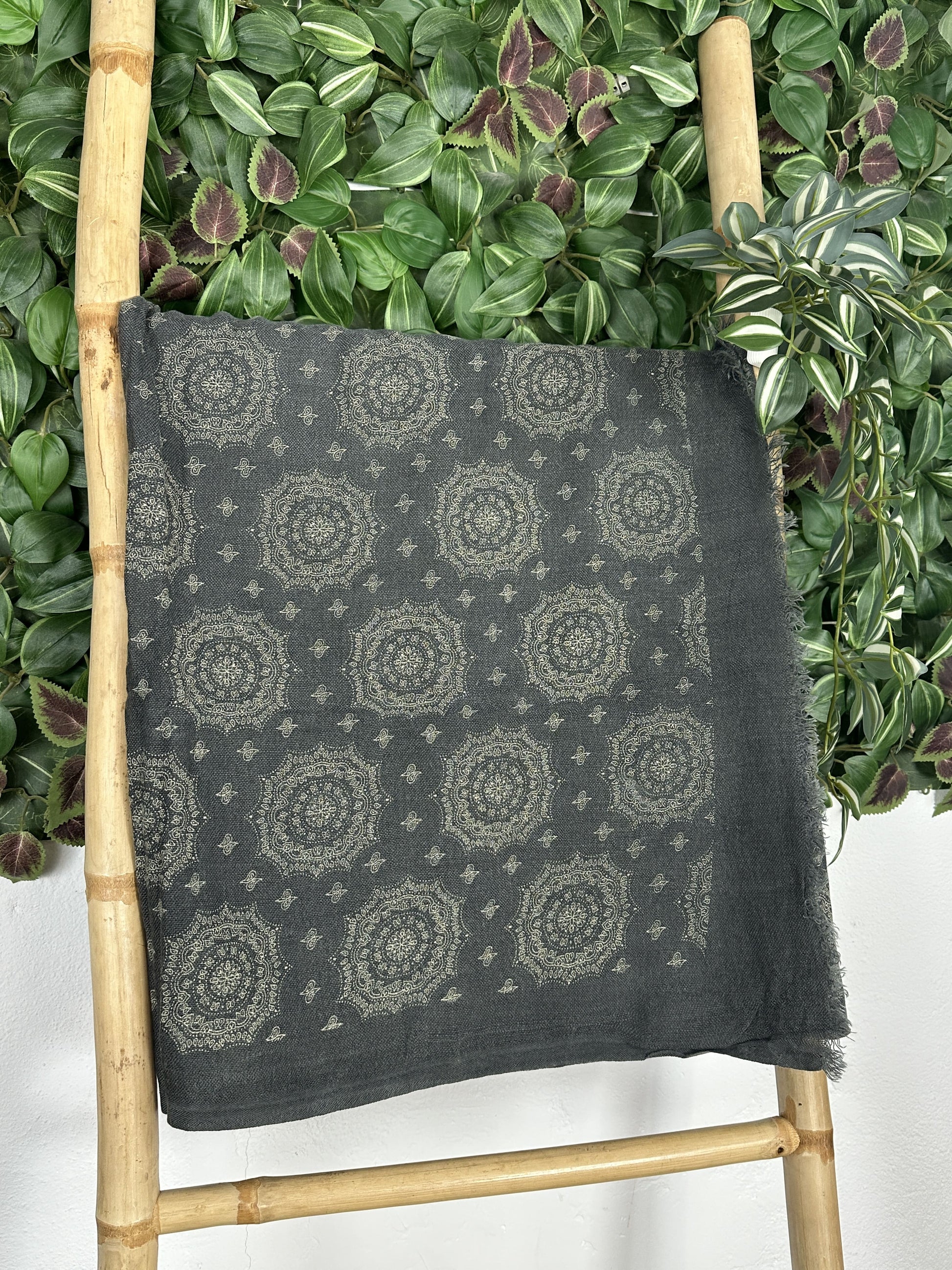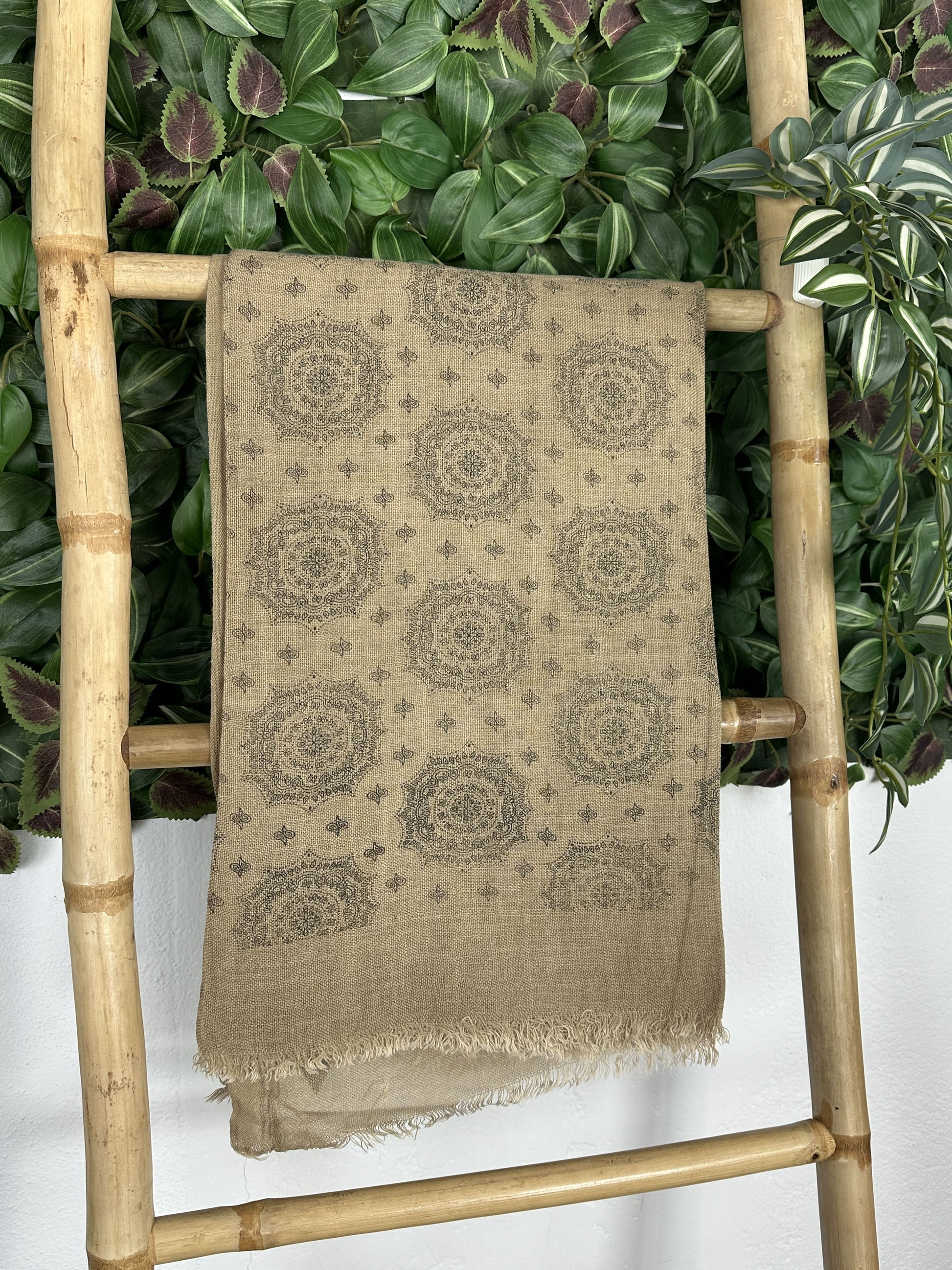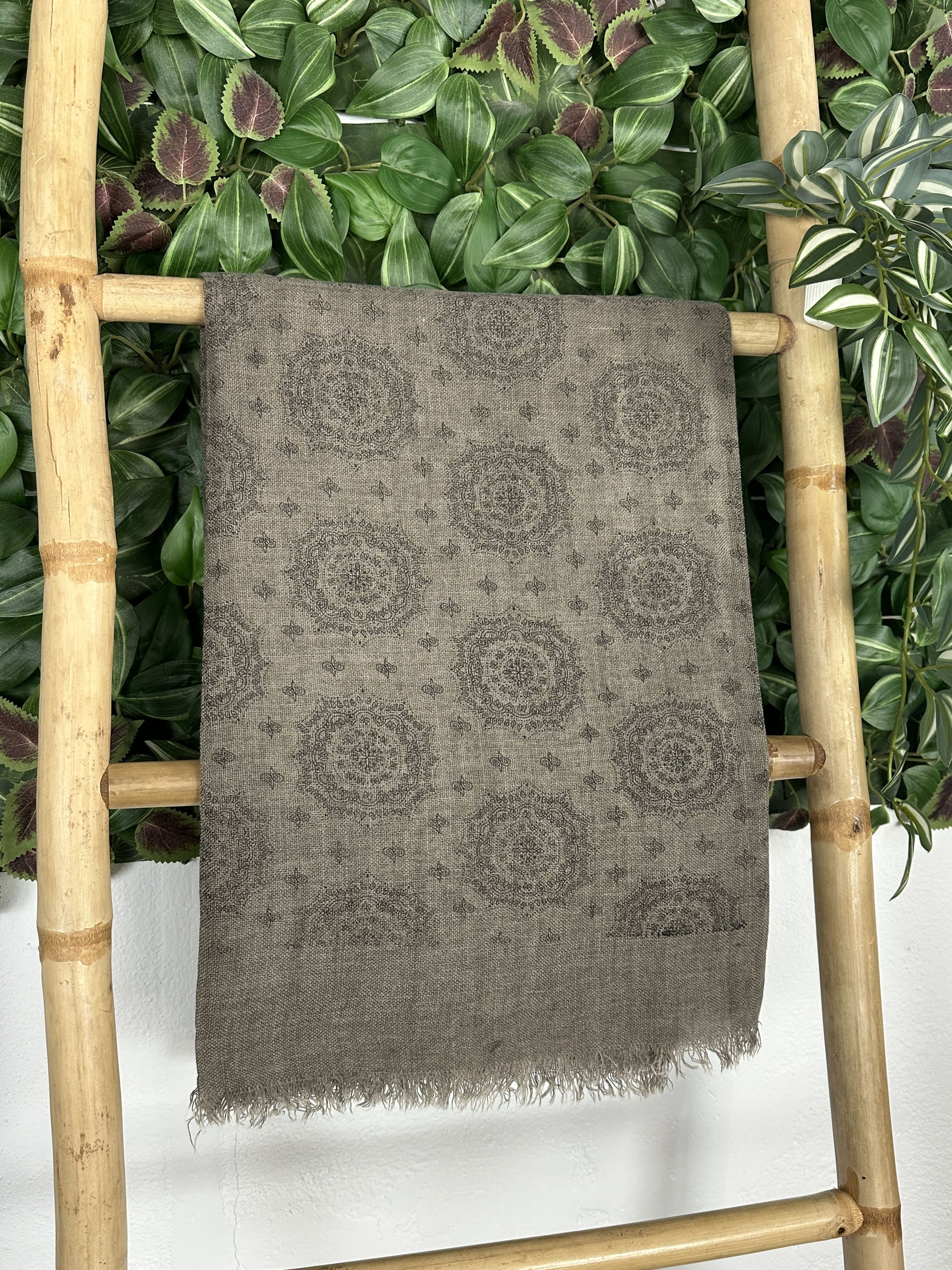 Pañuelo con estampado étnico con el borde desflecado.