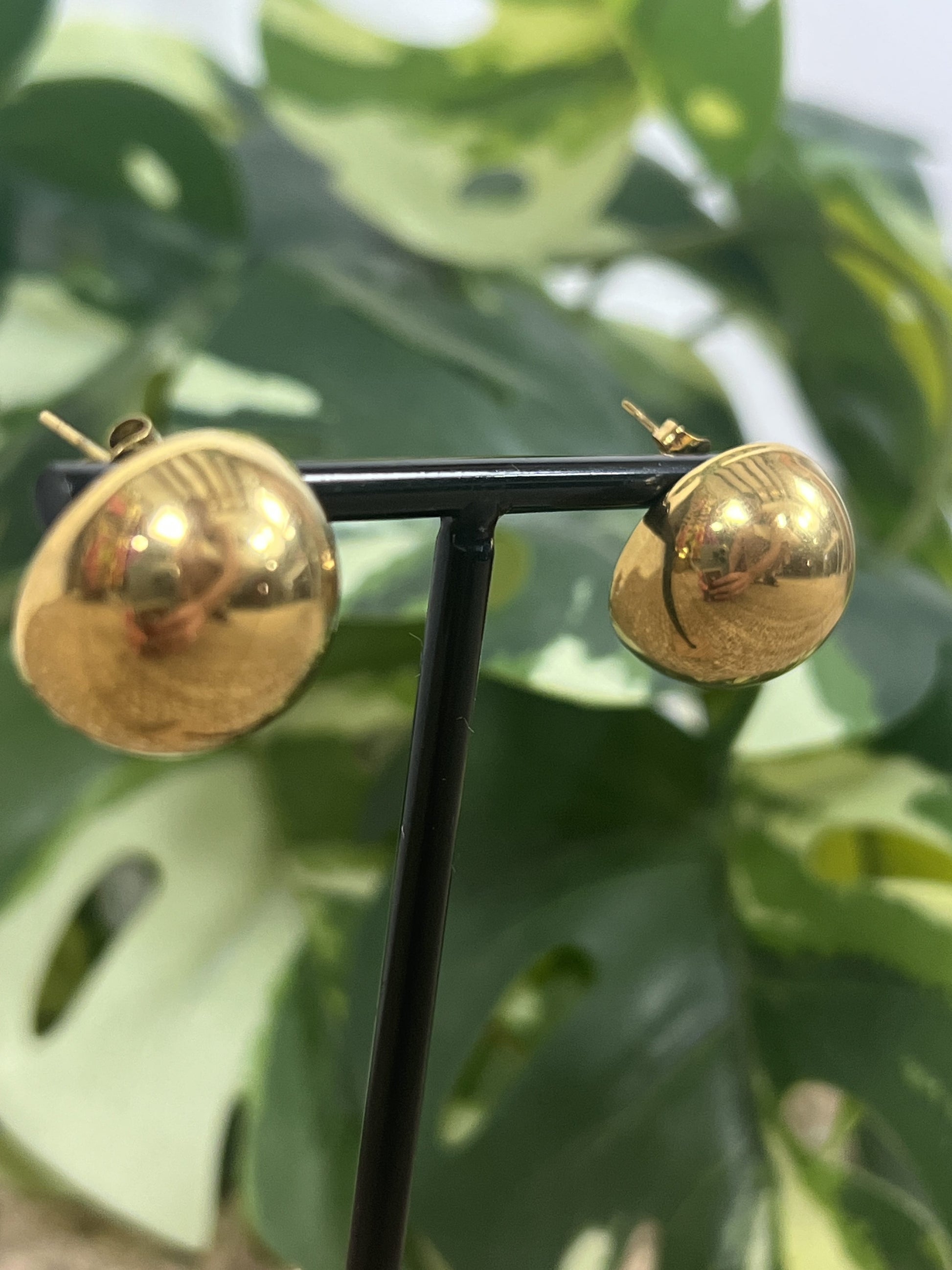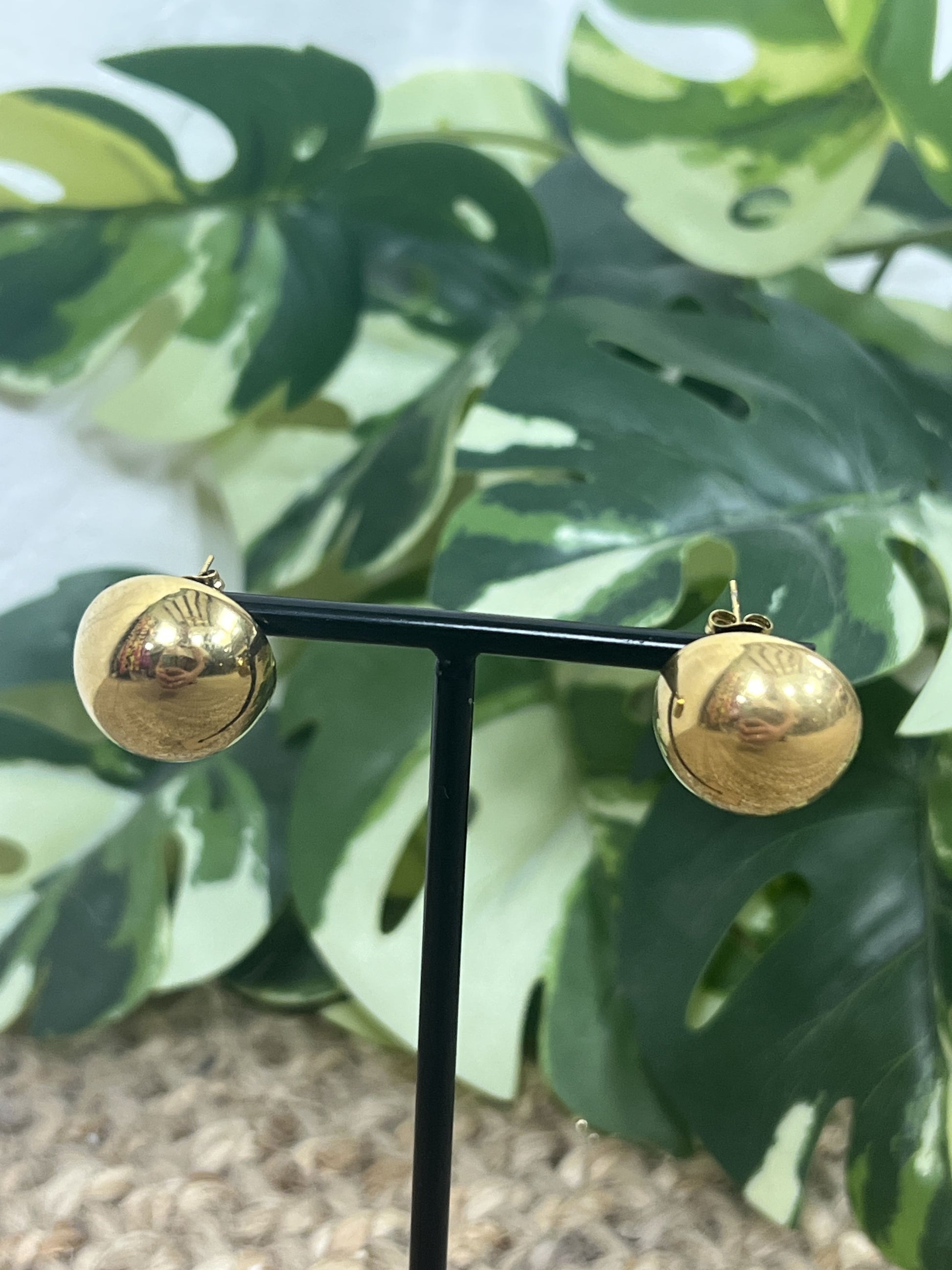 Pendiente de acero en forma de bola pegado a la oreja en color dorado.