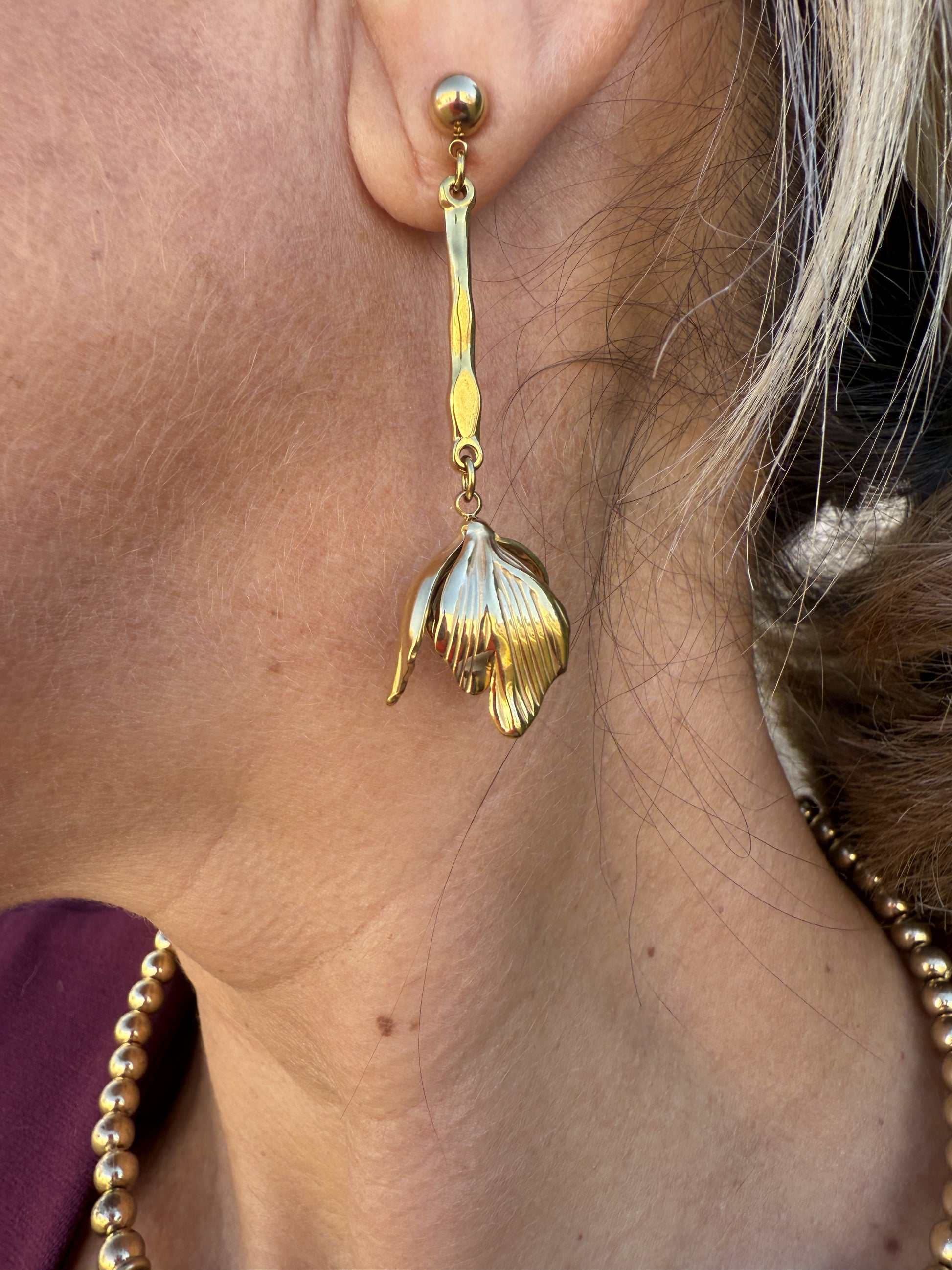 Pendiente de acero semi largo terminado en flor de color dorado.