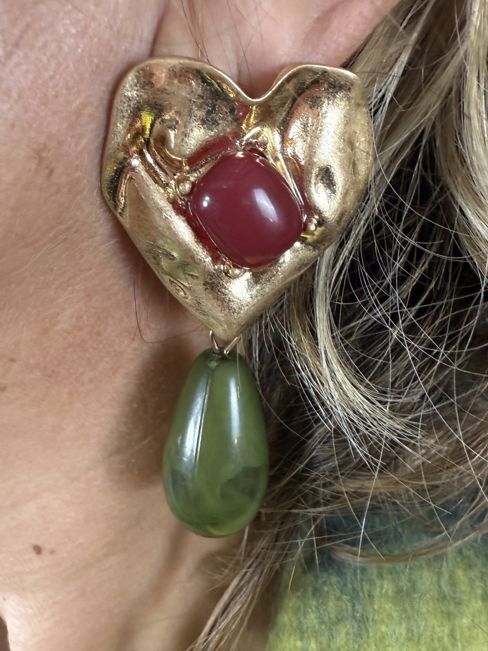 Pendiente en forma de corazón con piedra roja y coral en verde.