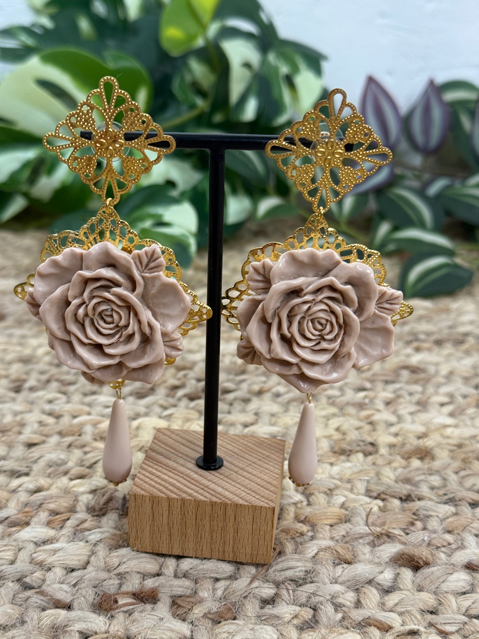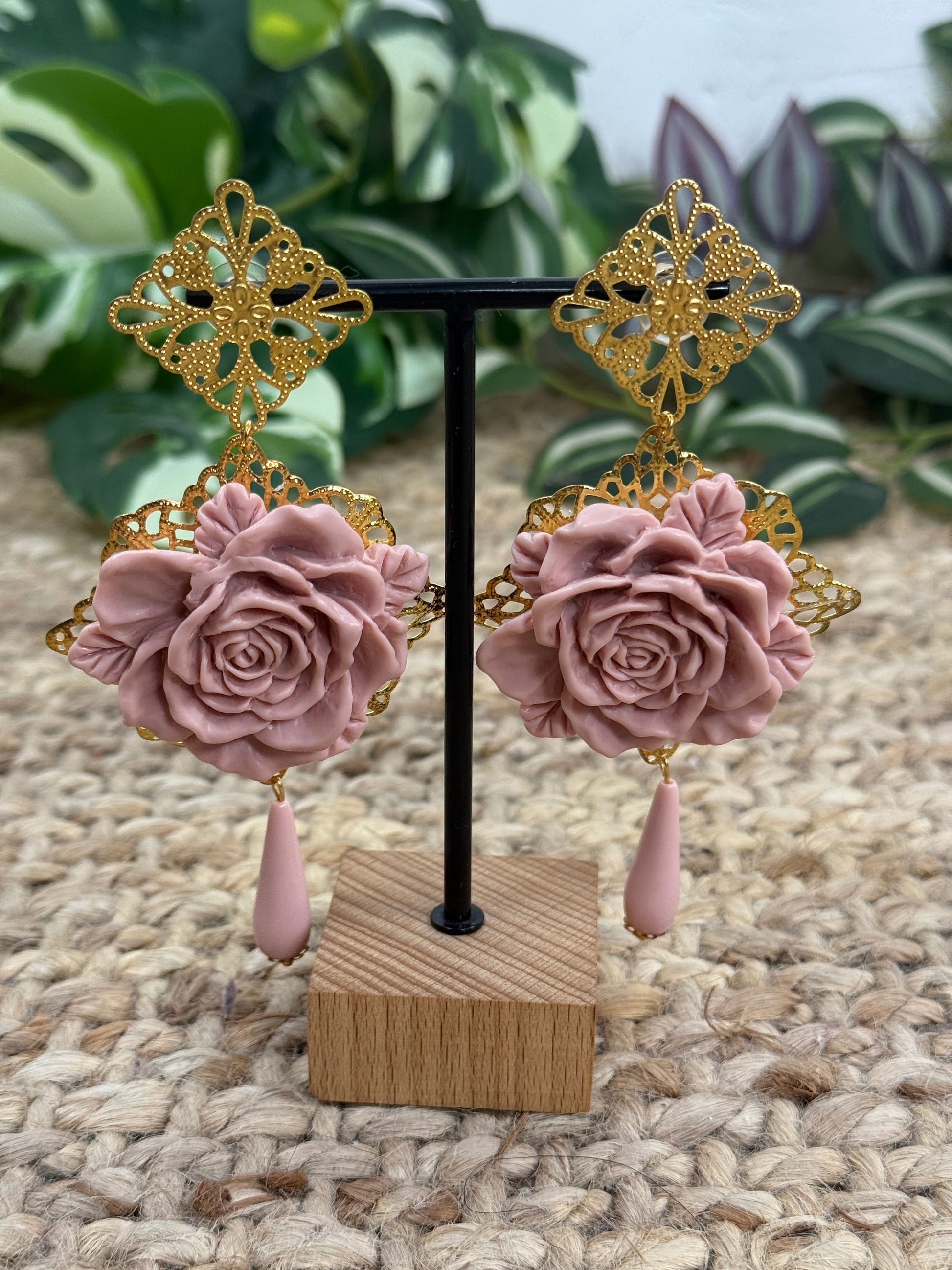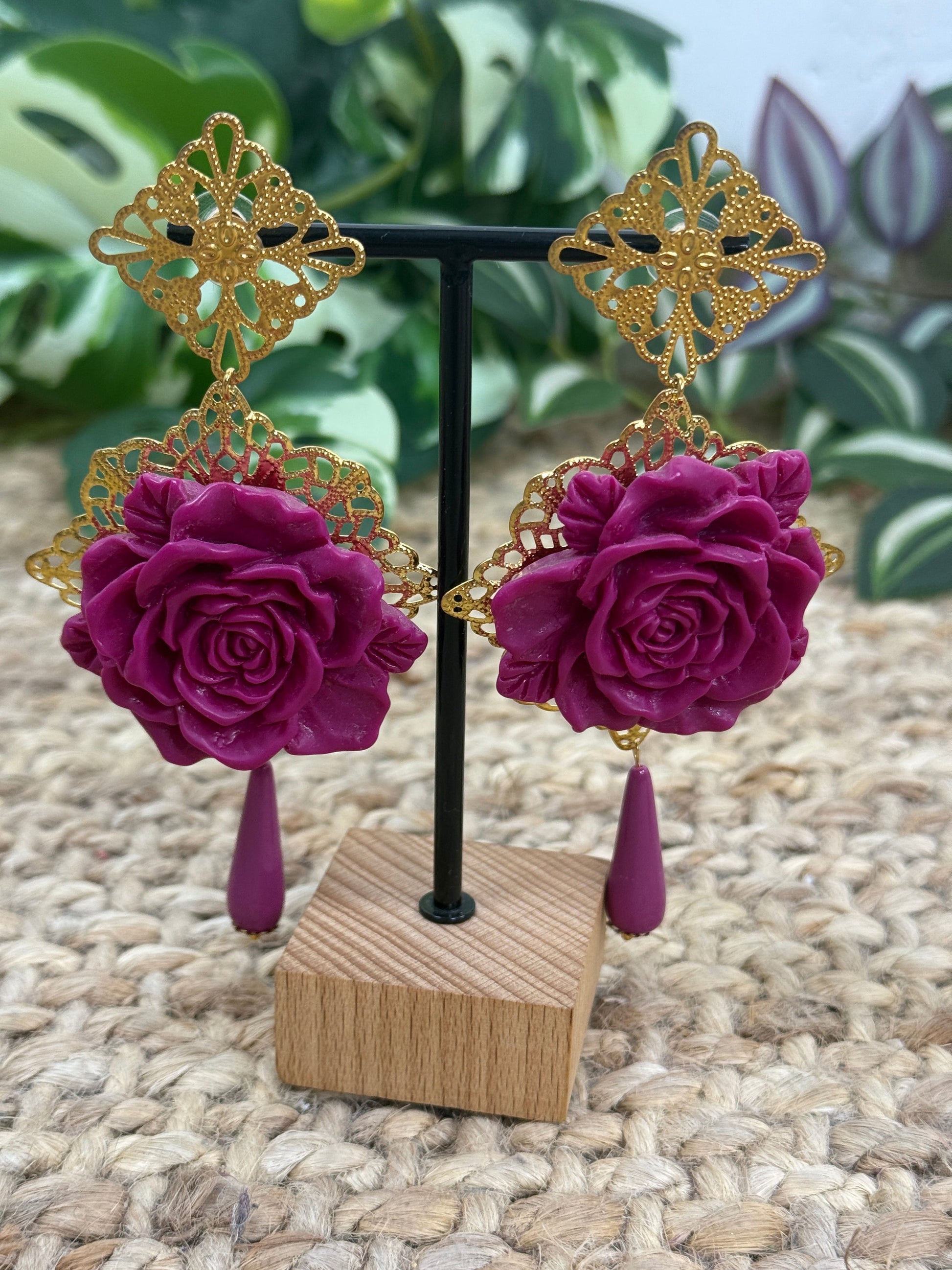 Pendiente de flamenca compuesto por una flor grande y coral del mismo color que la flor.