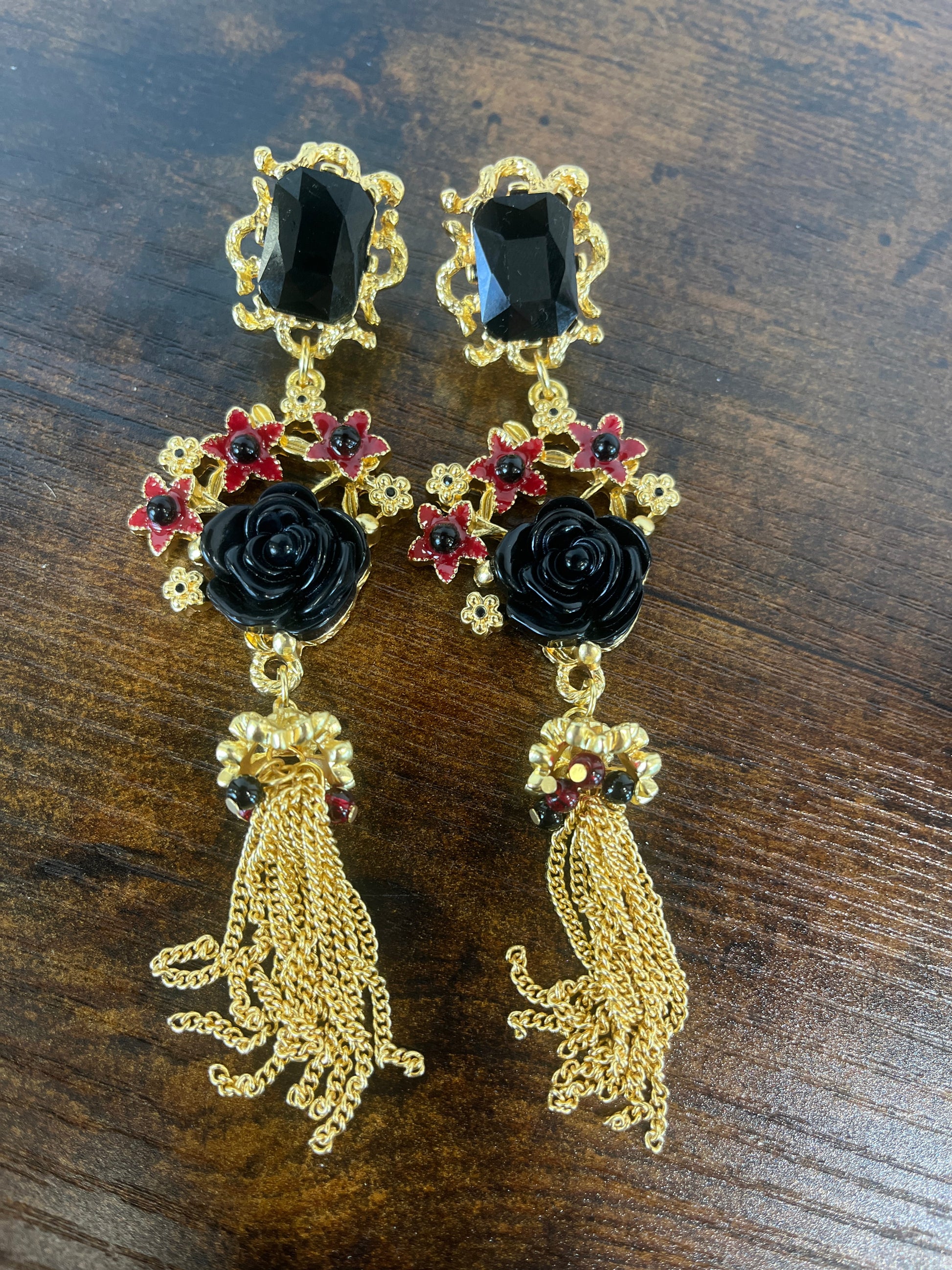 Pendientes largos con flores , cristales y borlas doradas.