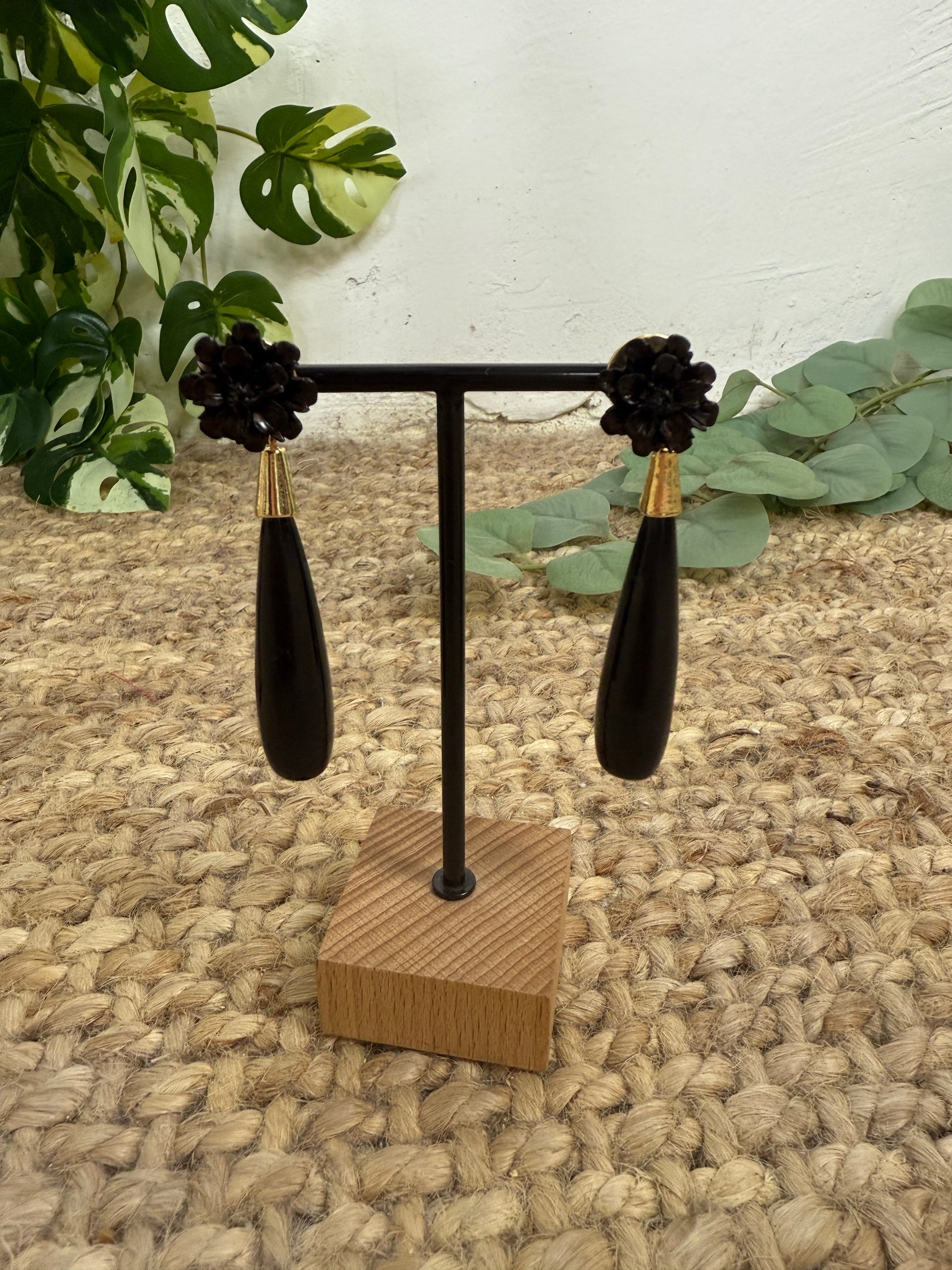 Pendiente largo en forma de lágrima negra con una flor en la parte superior.