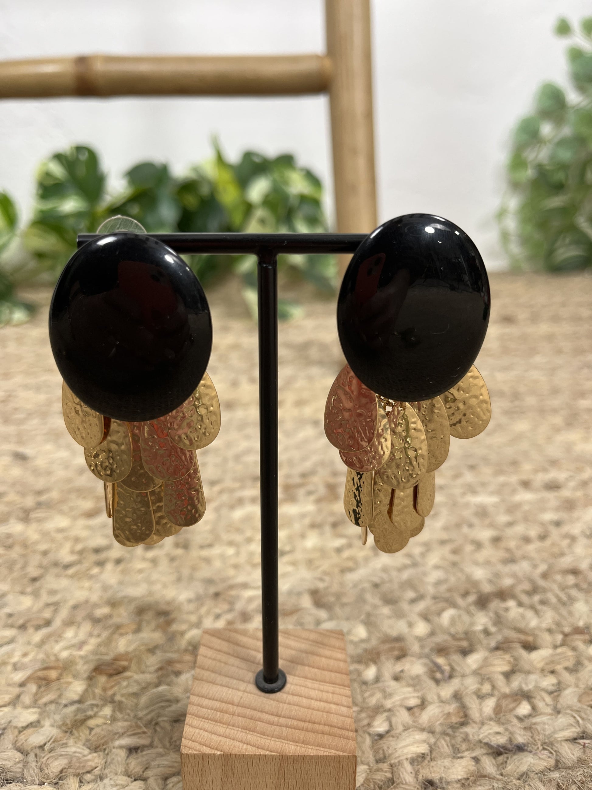 Pendiente con flecos anchos dorados colgando.