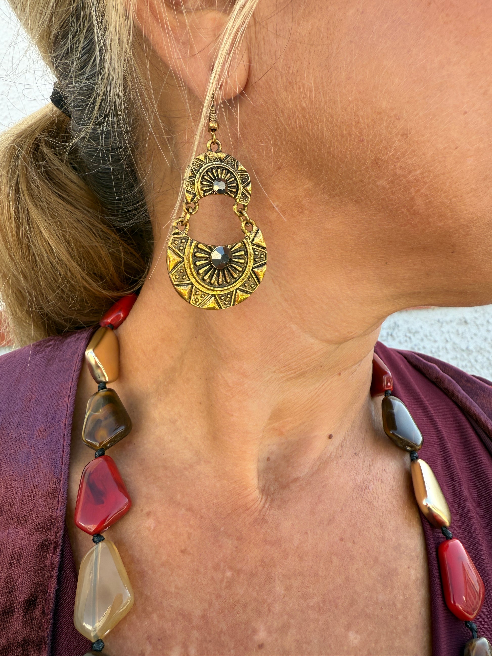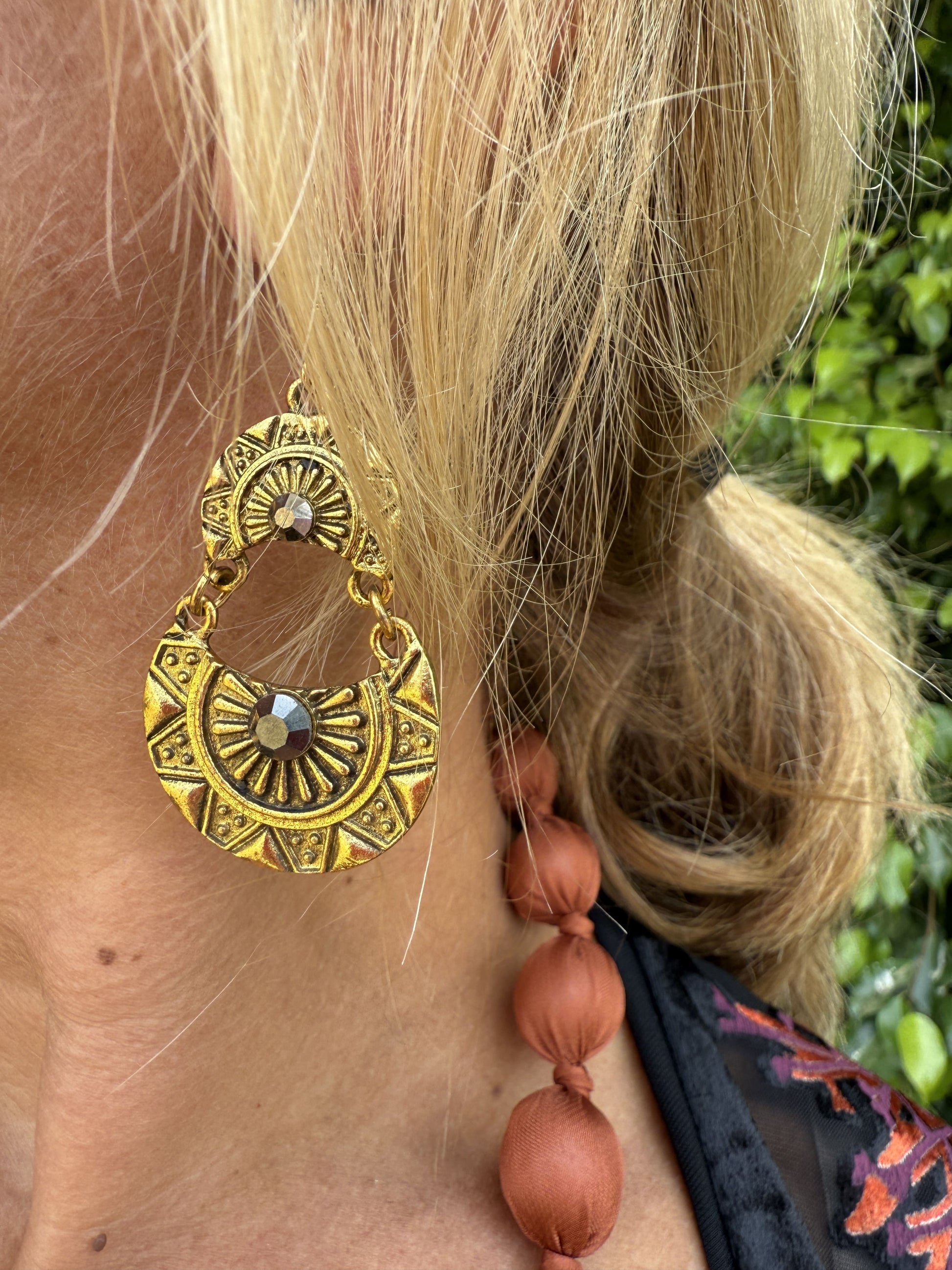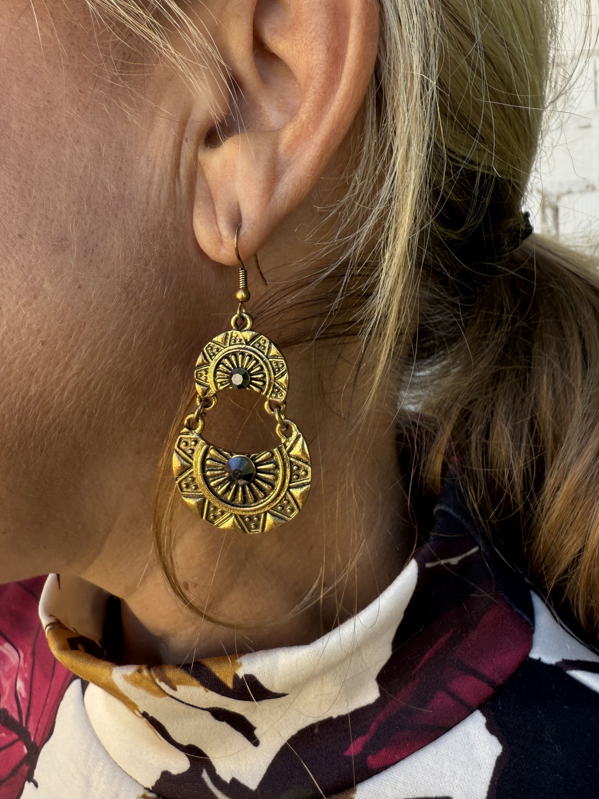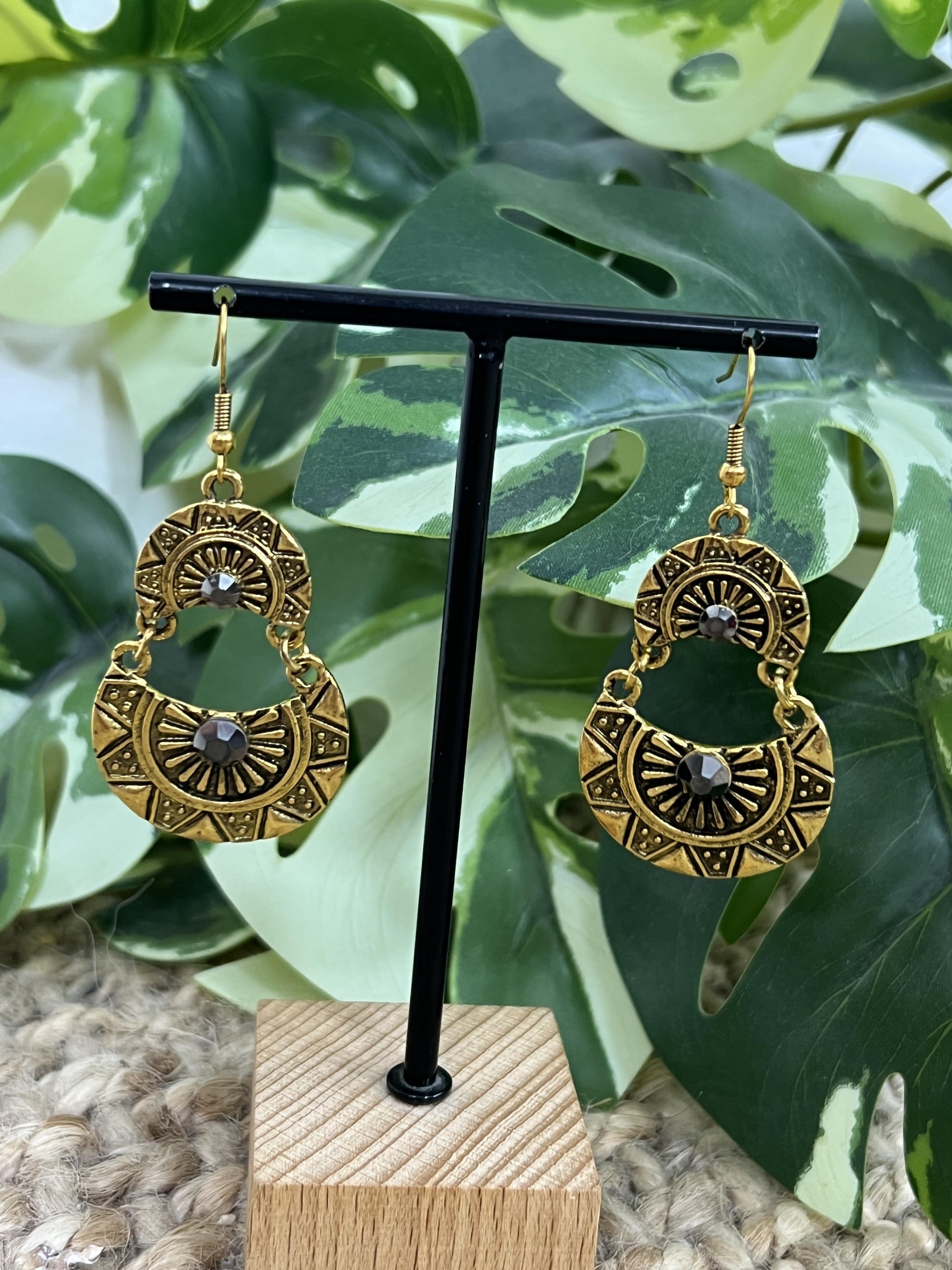 Pendiente de mujer tipo boho con dos medias lunas y brillo de cristal tipo circonita en color negro.
