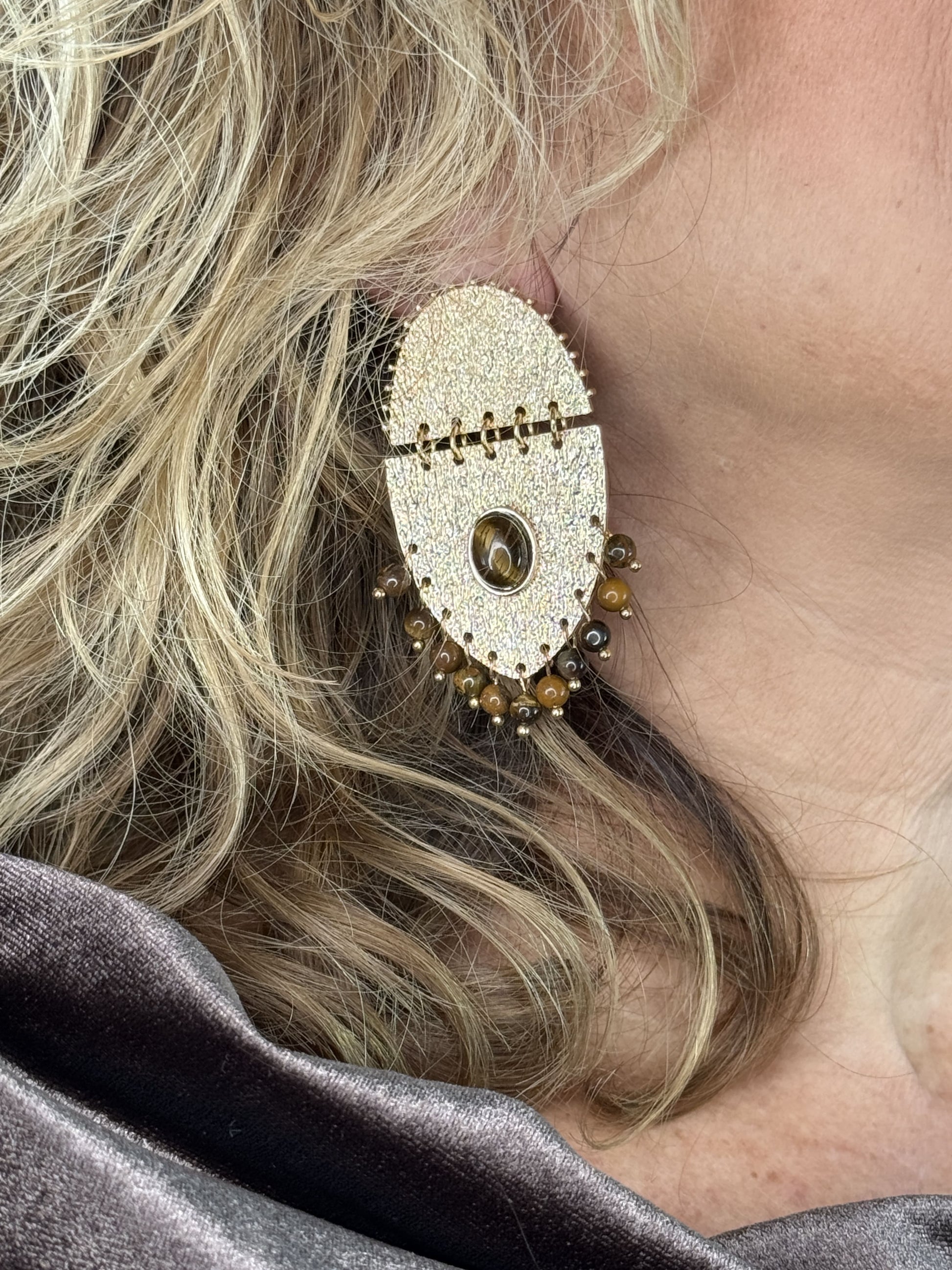 Tiene varias piedrecitas pequeñas colgando y una grande en el centro.