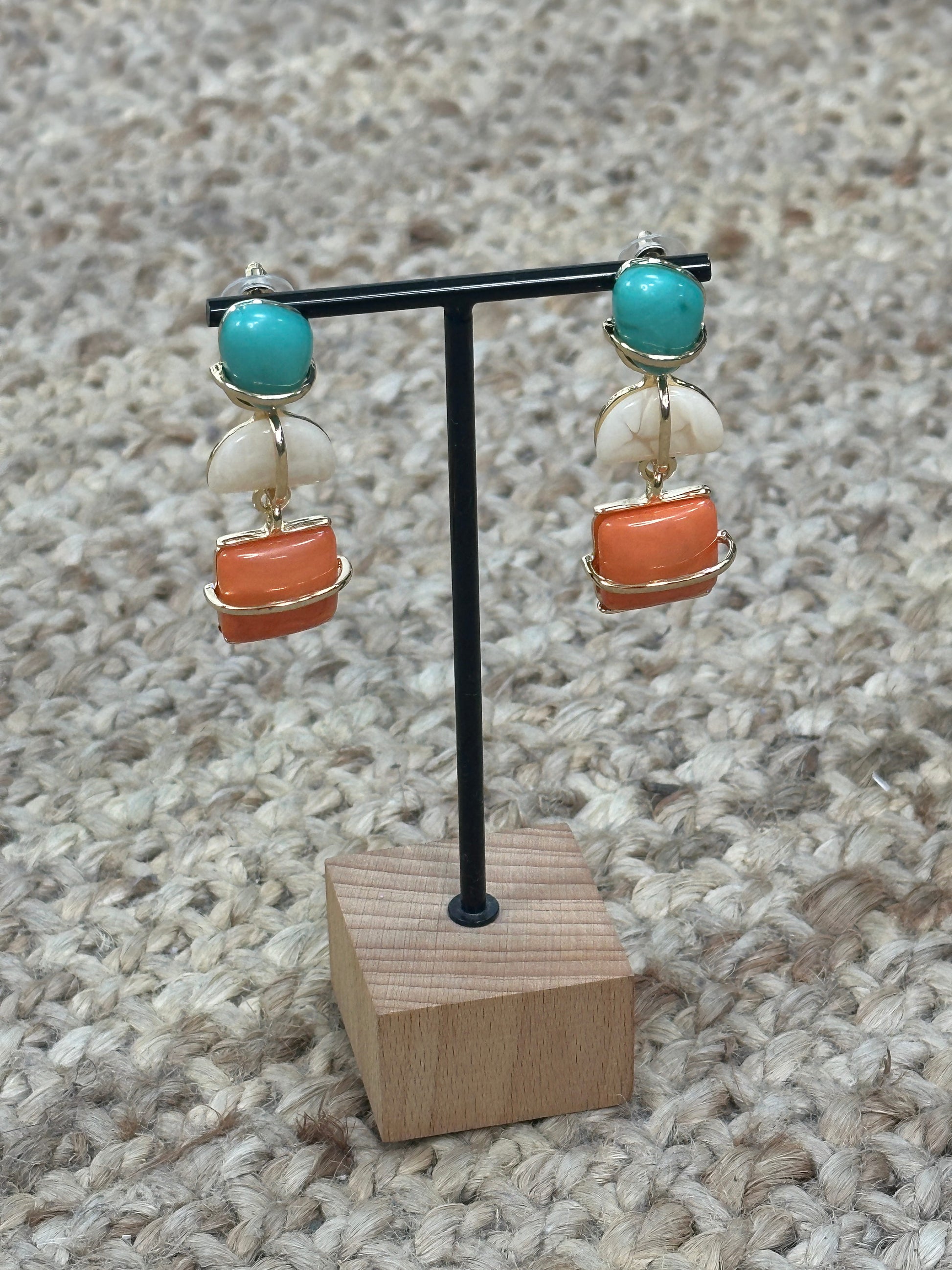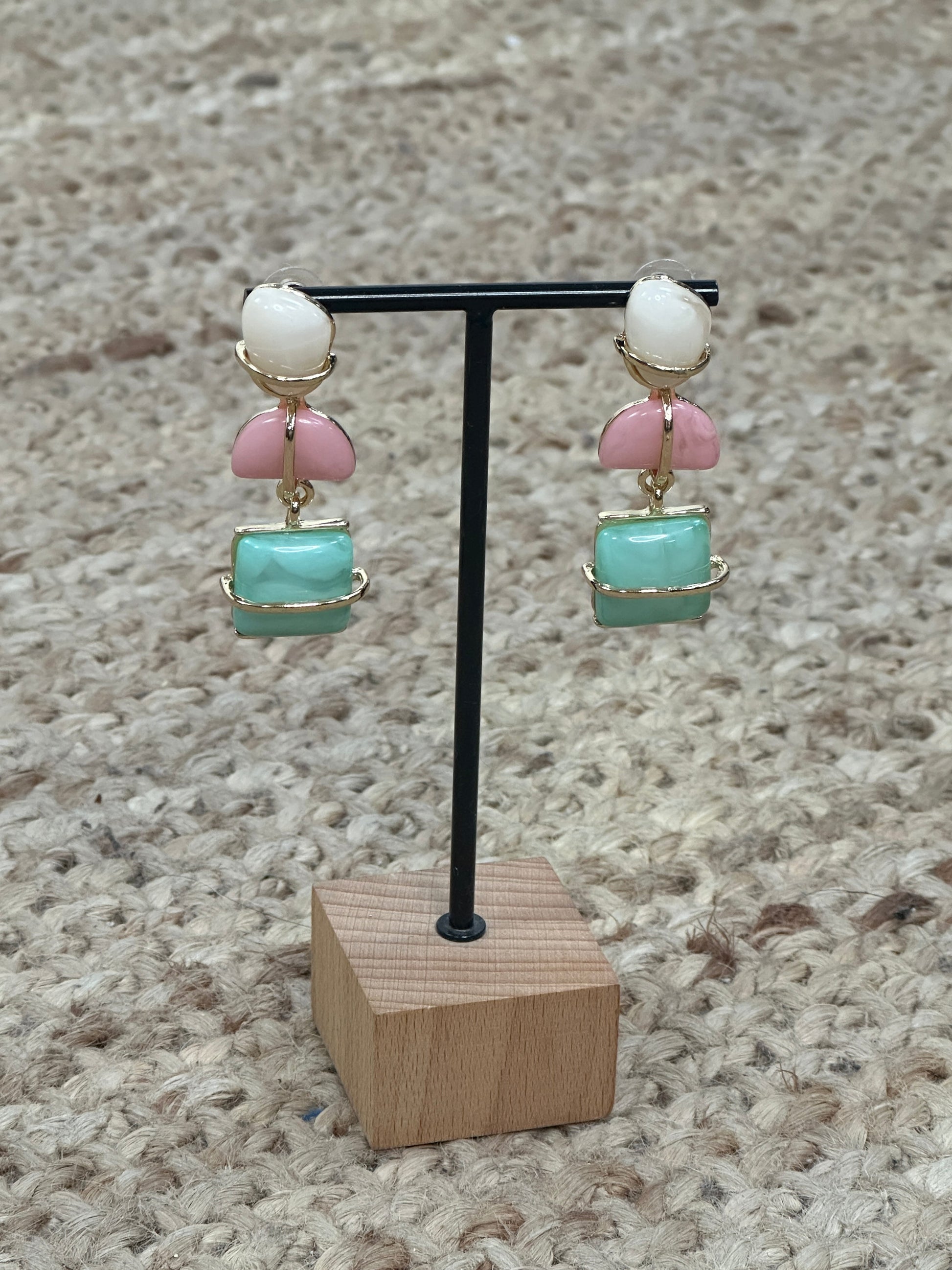 Pendiente largo con piedras de colores de resina engarzadas.