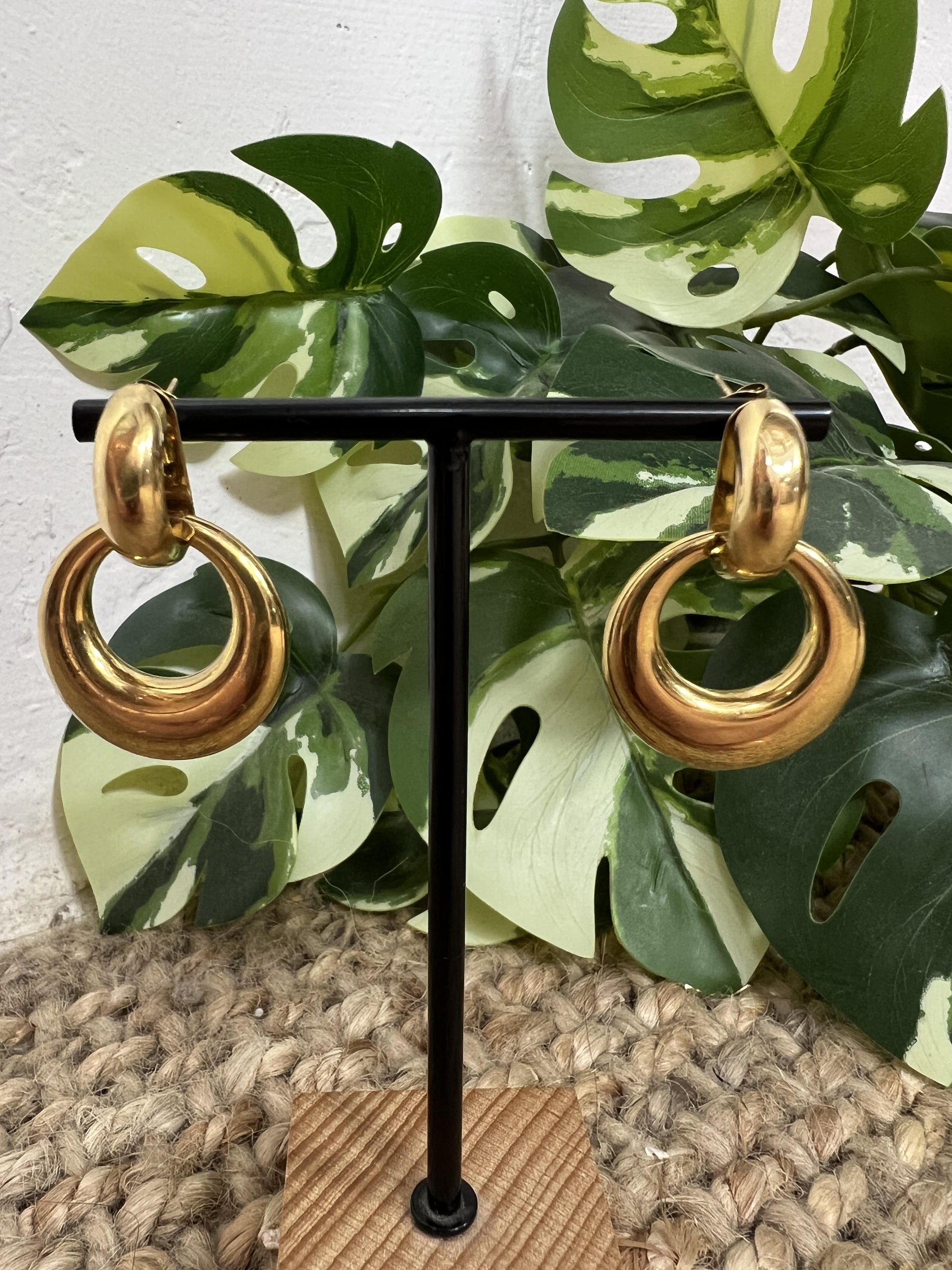 Pendiente de mujer con media luna y circulo colgante en color dorado.