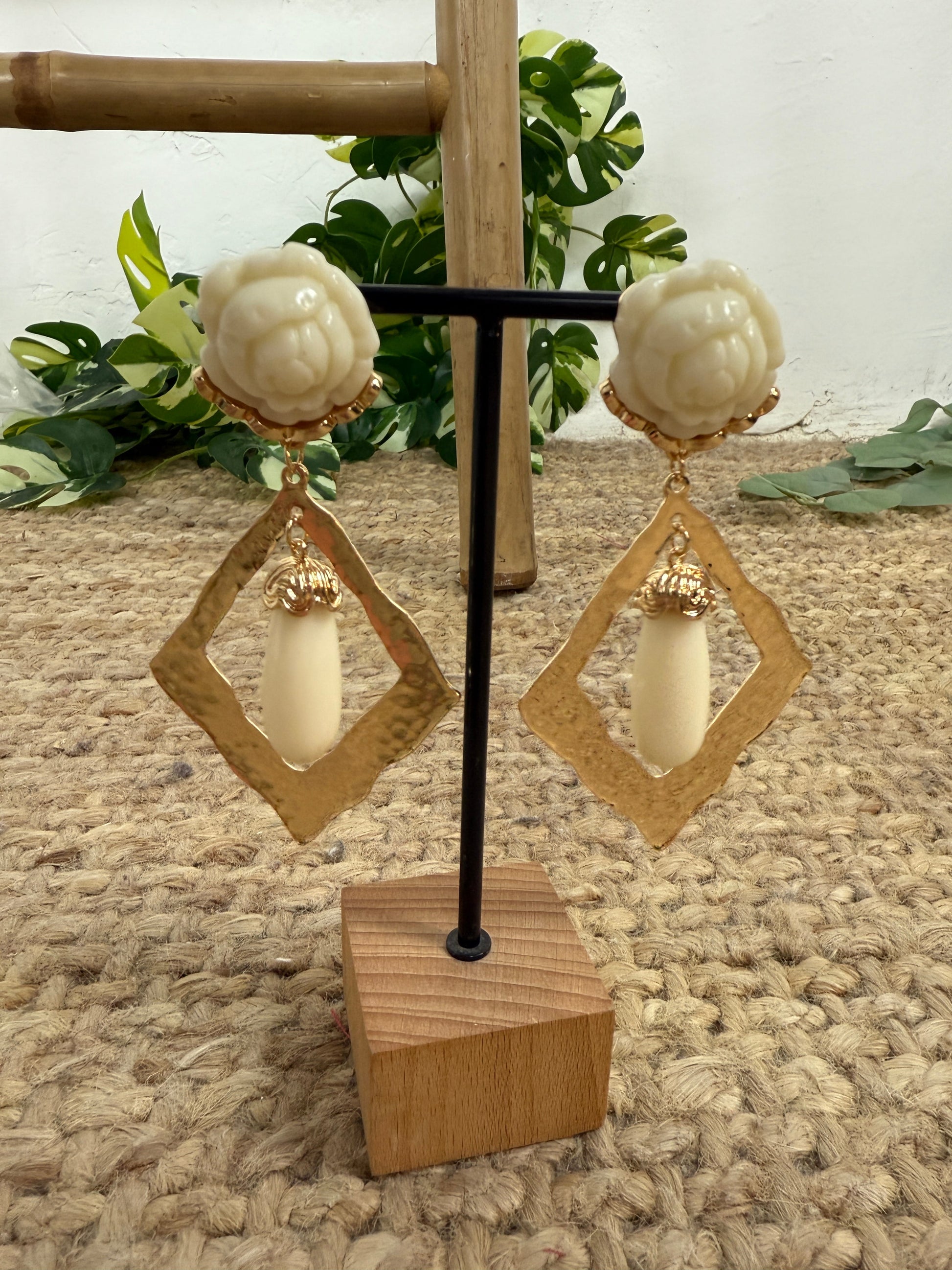 Pendiente largo con diseño floral en tono marfil , combinados con estructura geométrica irregular chapado en oro.