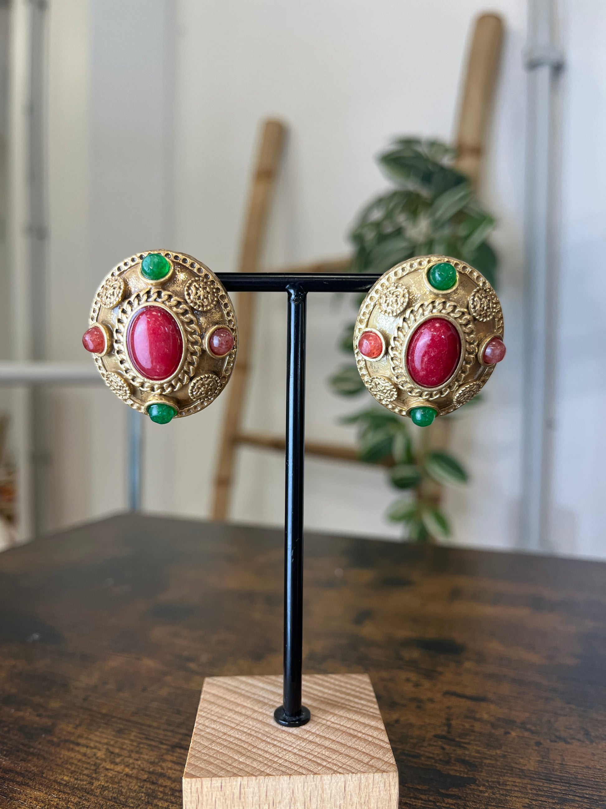 Pendiente de mujer ideal para flamenca de forma ovalada con piedras de colores y el resto del pendiente color dorado.