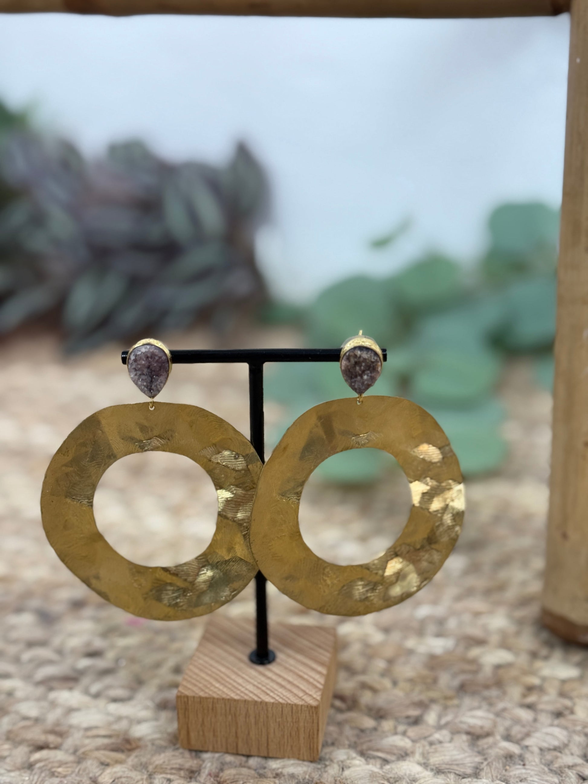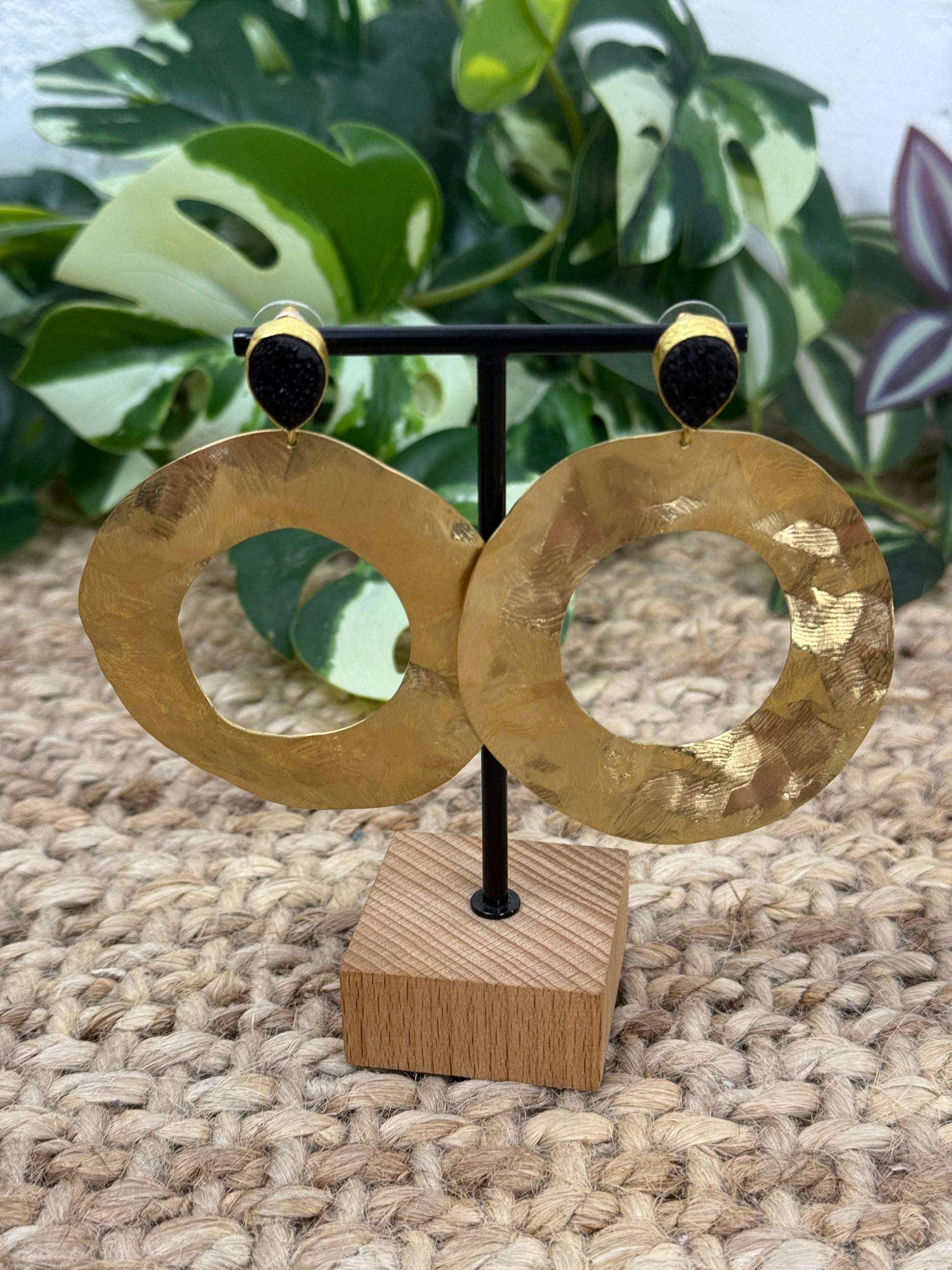 Pendiente de mujer con piedras pequeñas de varios colores y redondel grande dorado.
