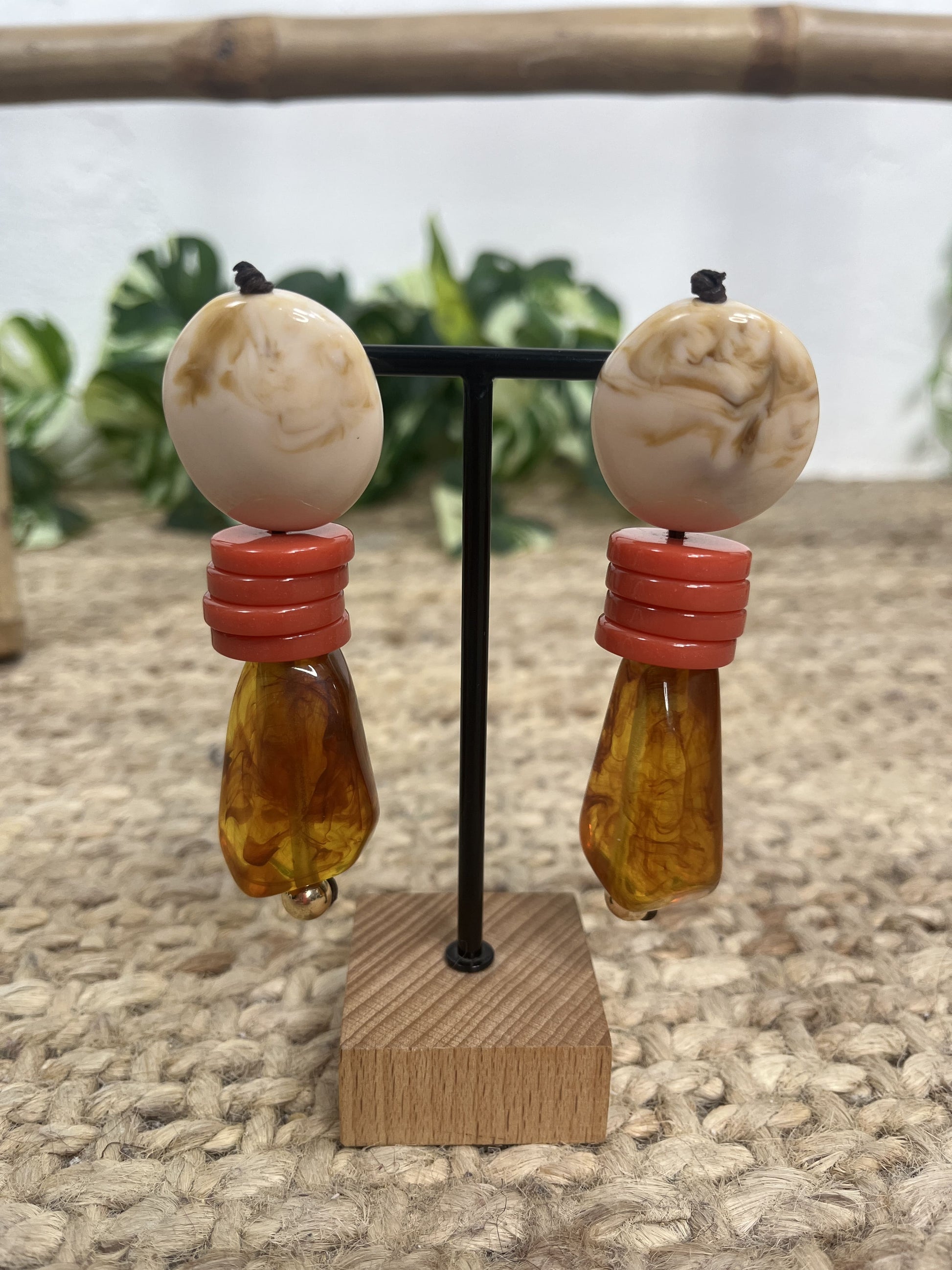 Pendiente compuesto de piedras y tres abalorios redondos en el centro.