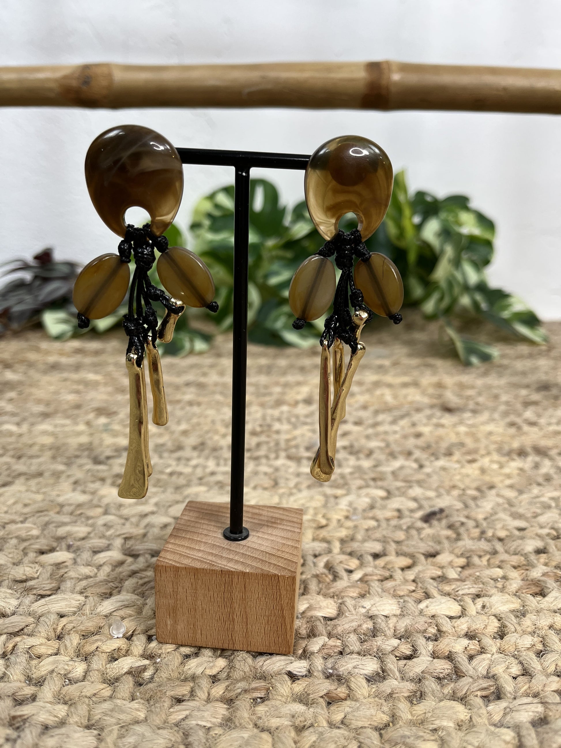 Pendiente de mujer compuesto de piedras con cuerda y abalorio dorado.