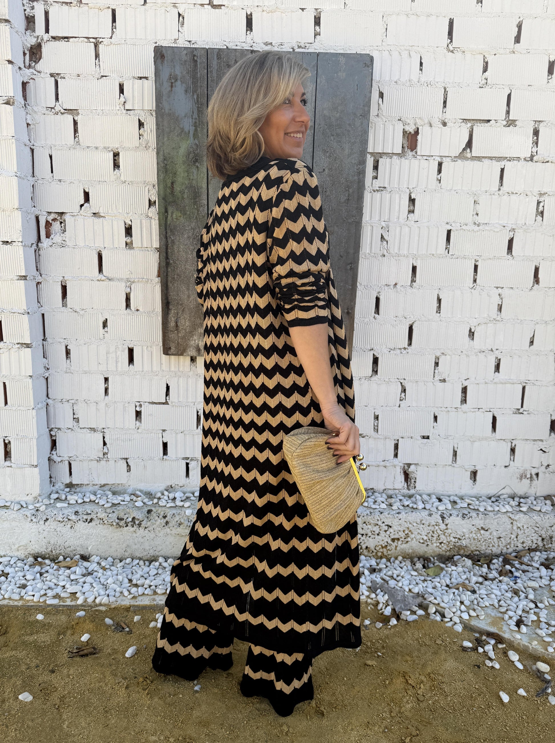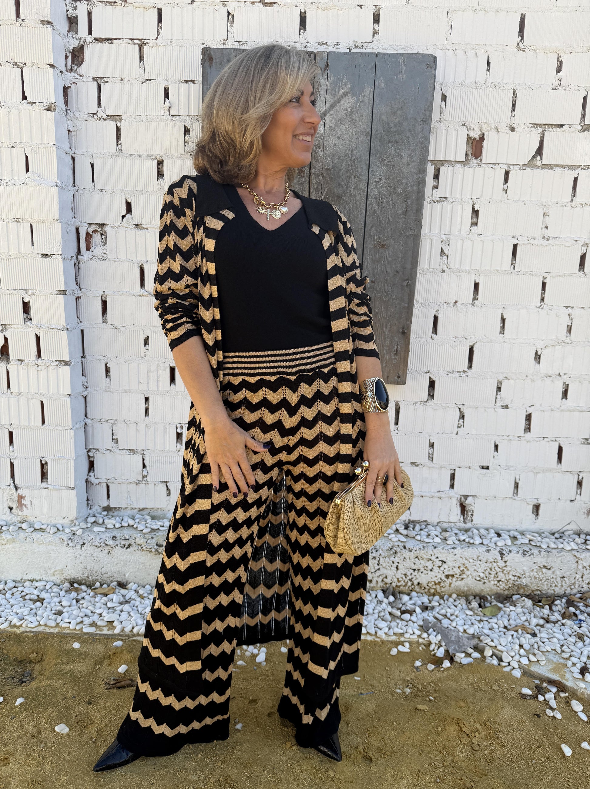 Rebeca larga de punto calada bicolor en forma de zigzag con brillo.