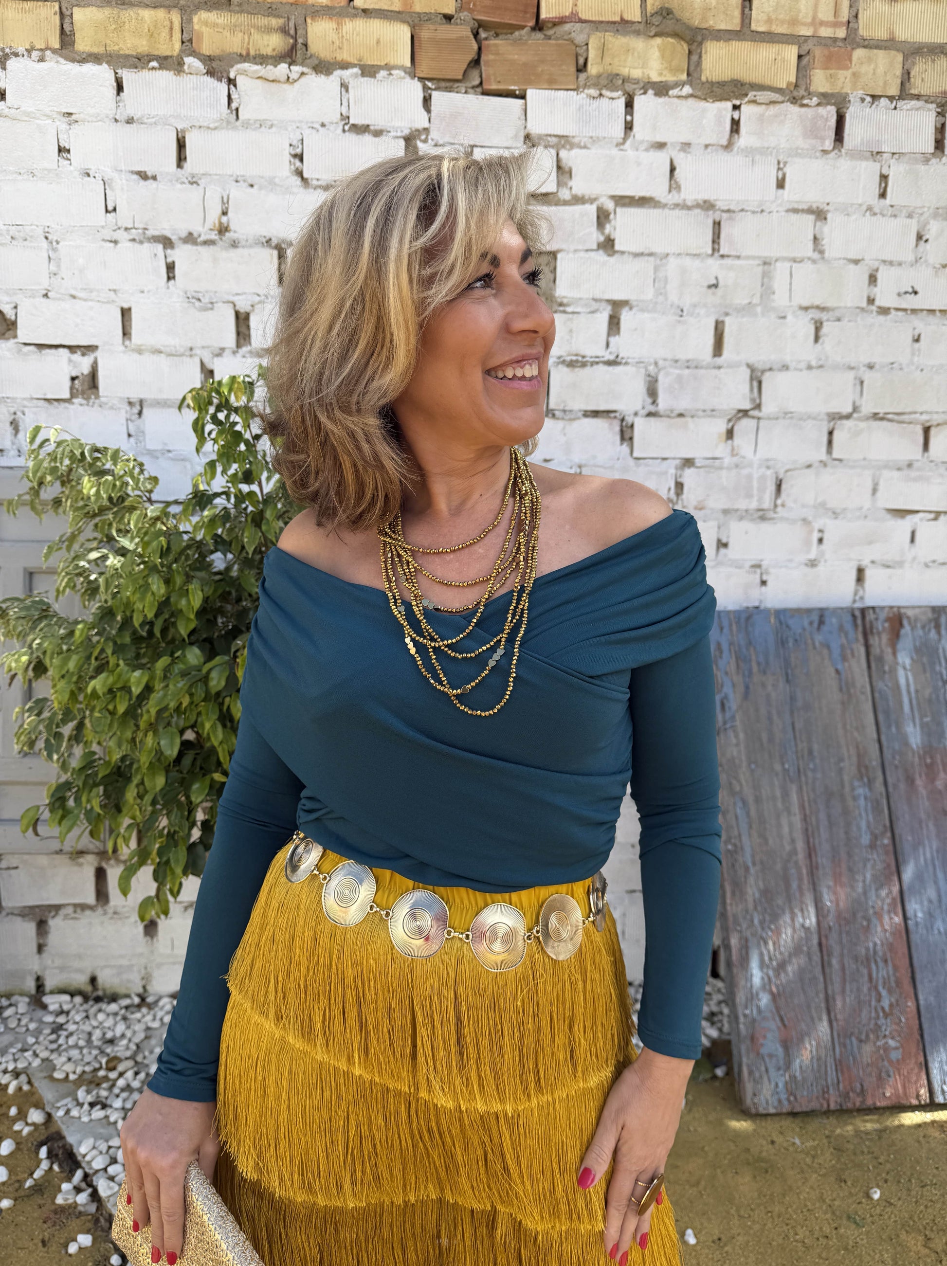 Escote doble posición. Puedes ponerlo en forma de pico o bardot (palabra de honor).