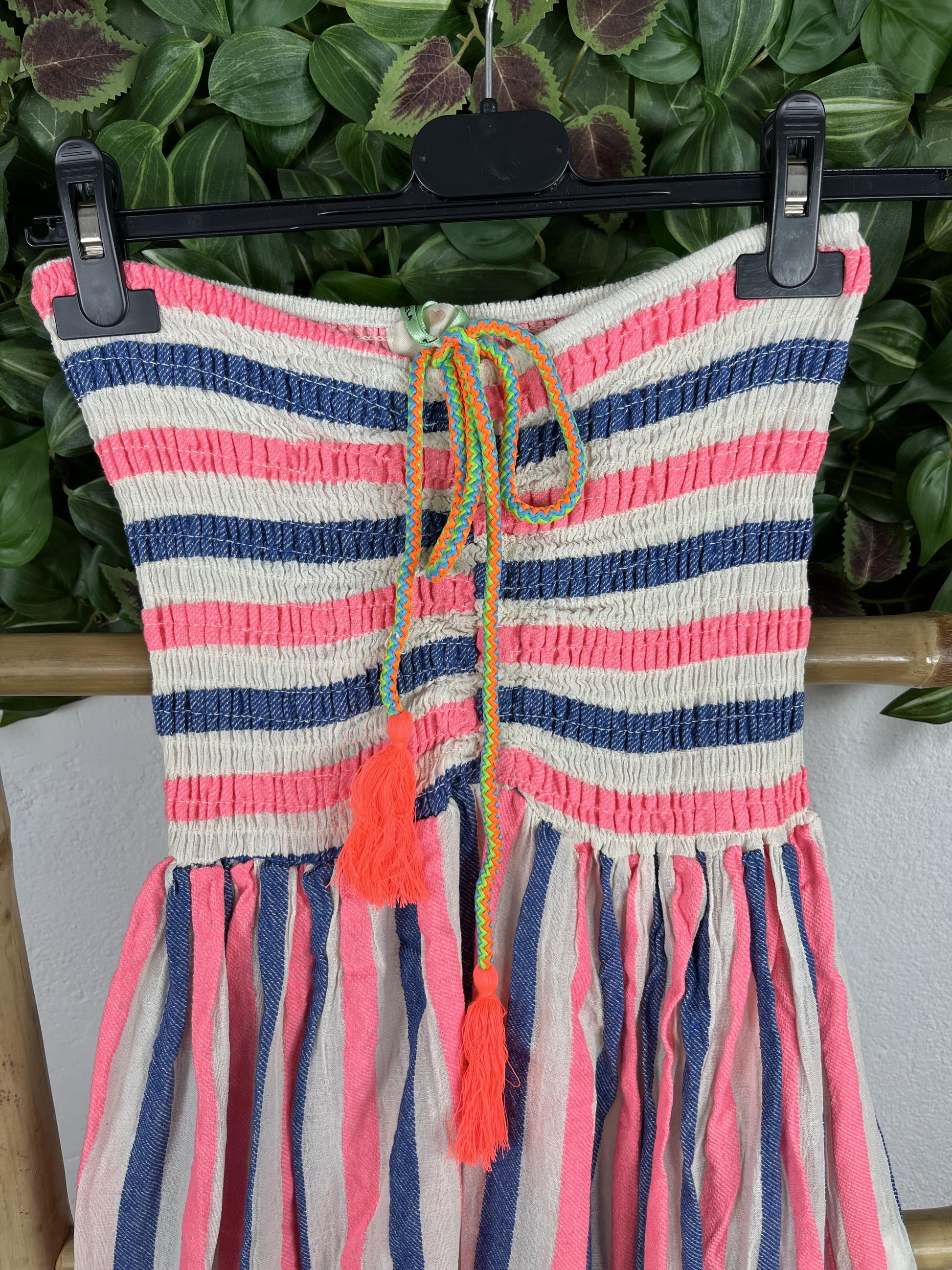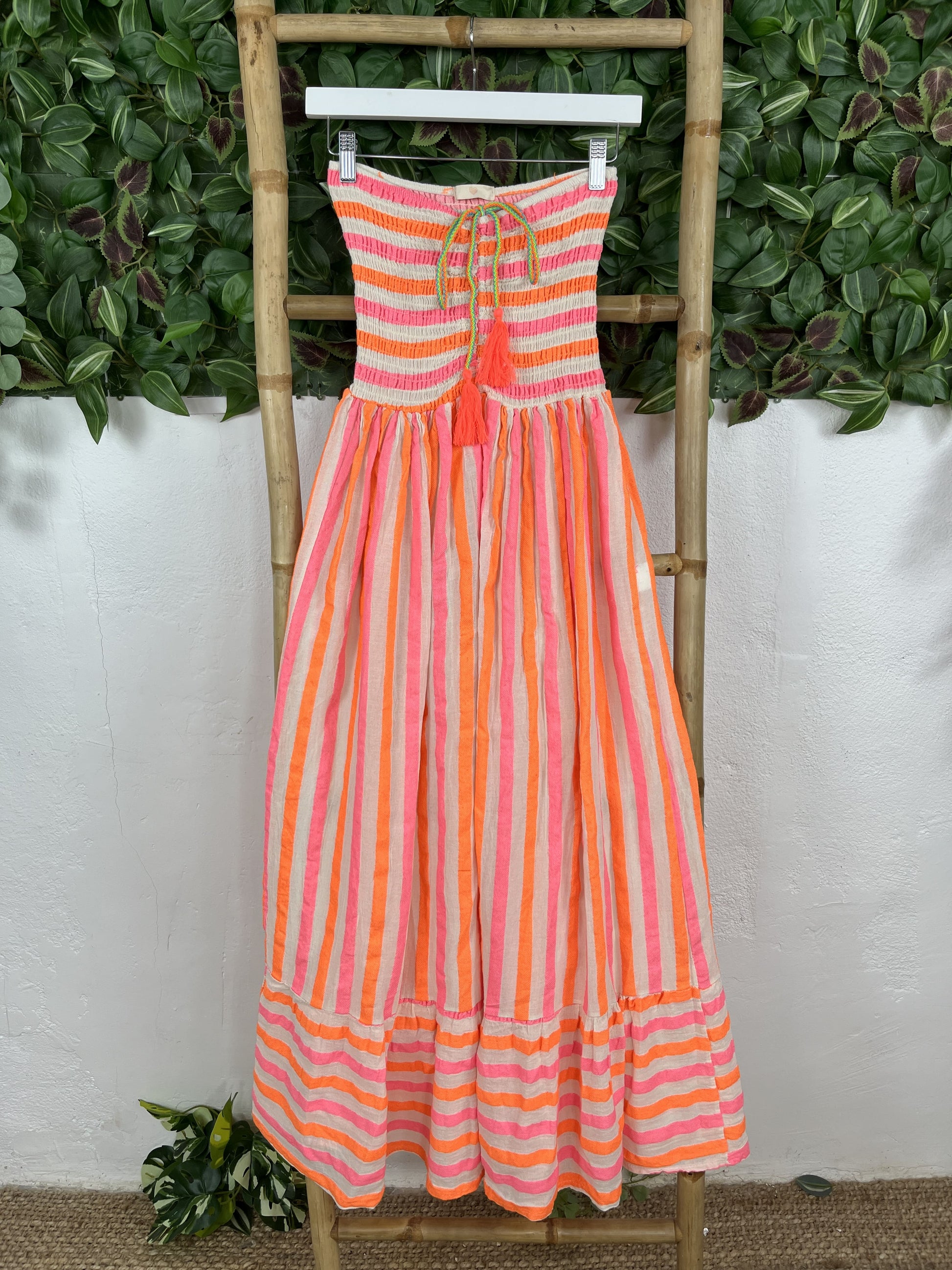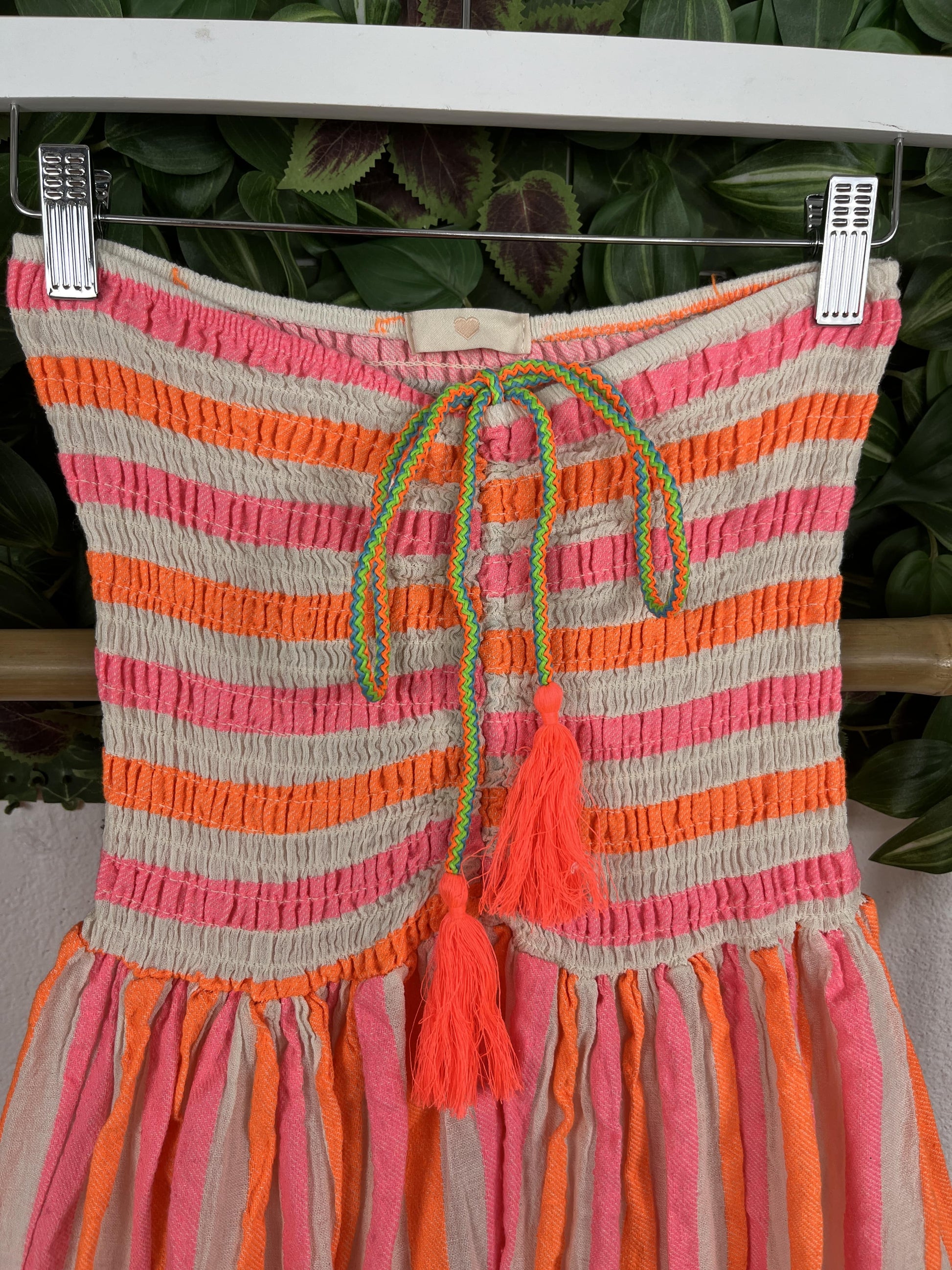 El estampado es de rayas naranja, rosa y blanco.