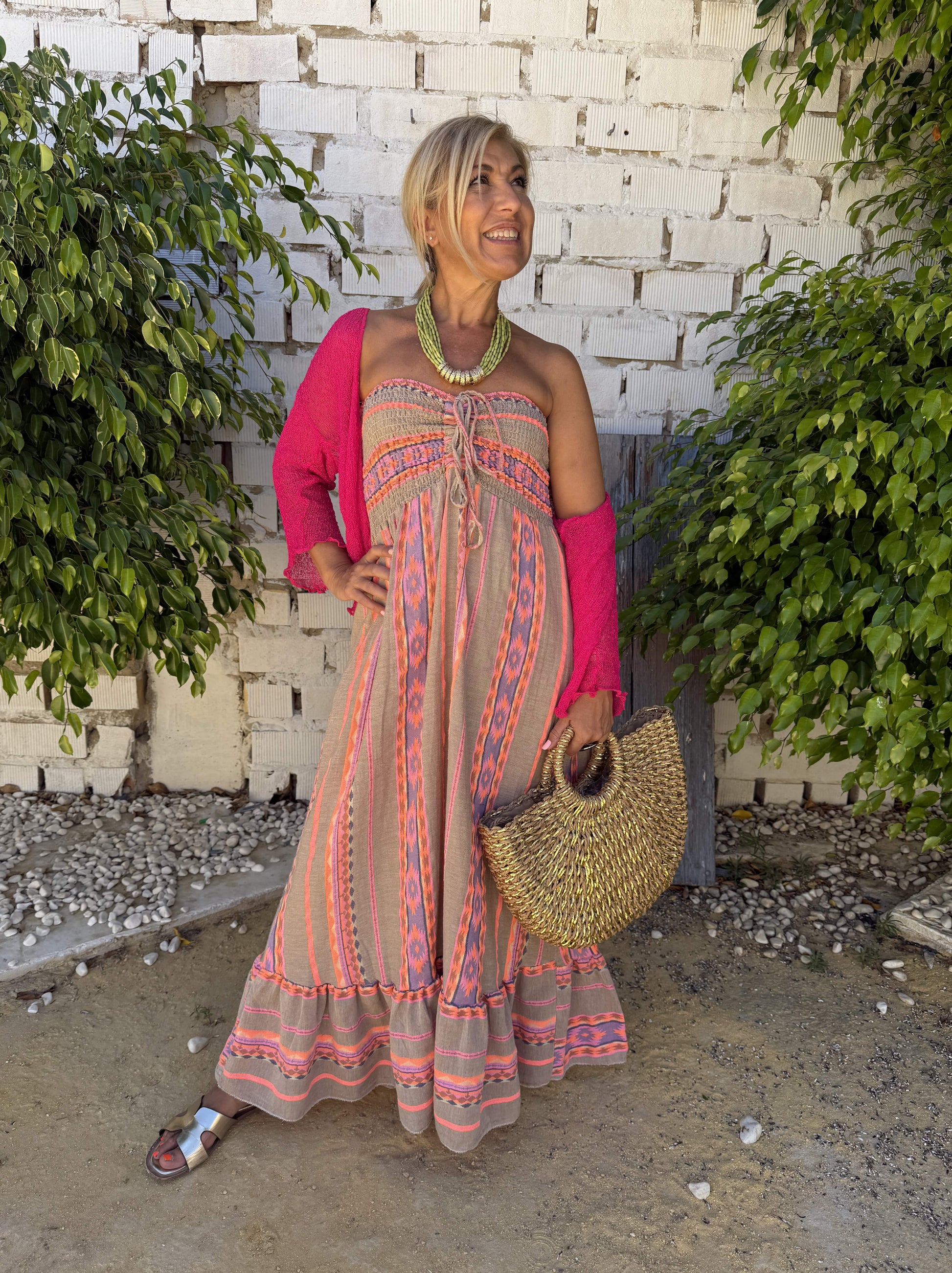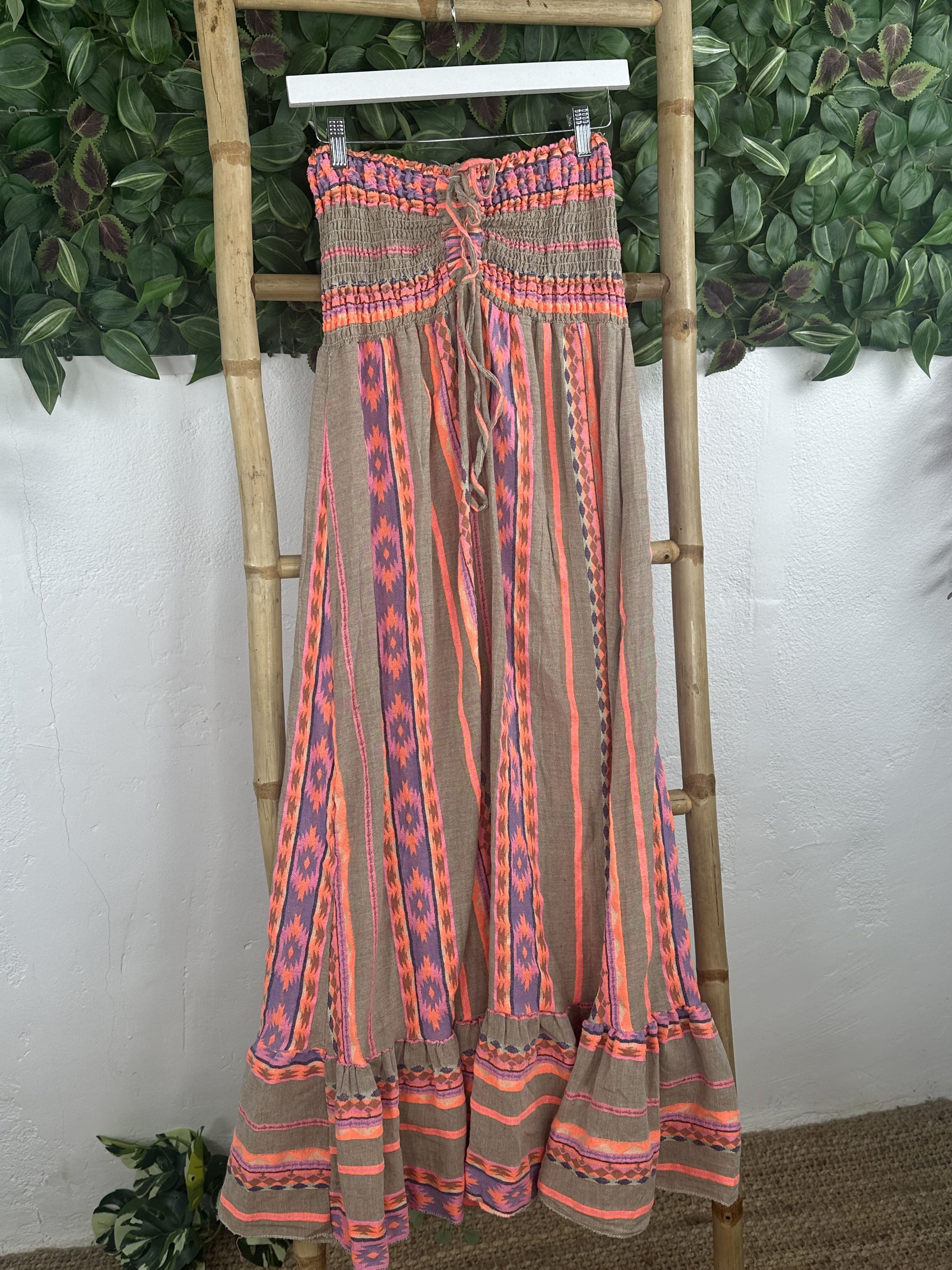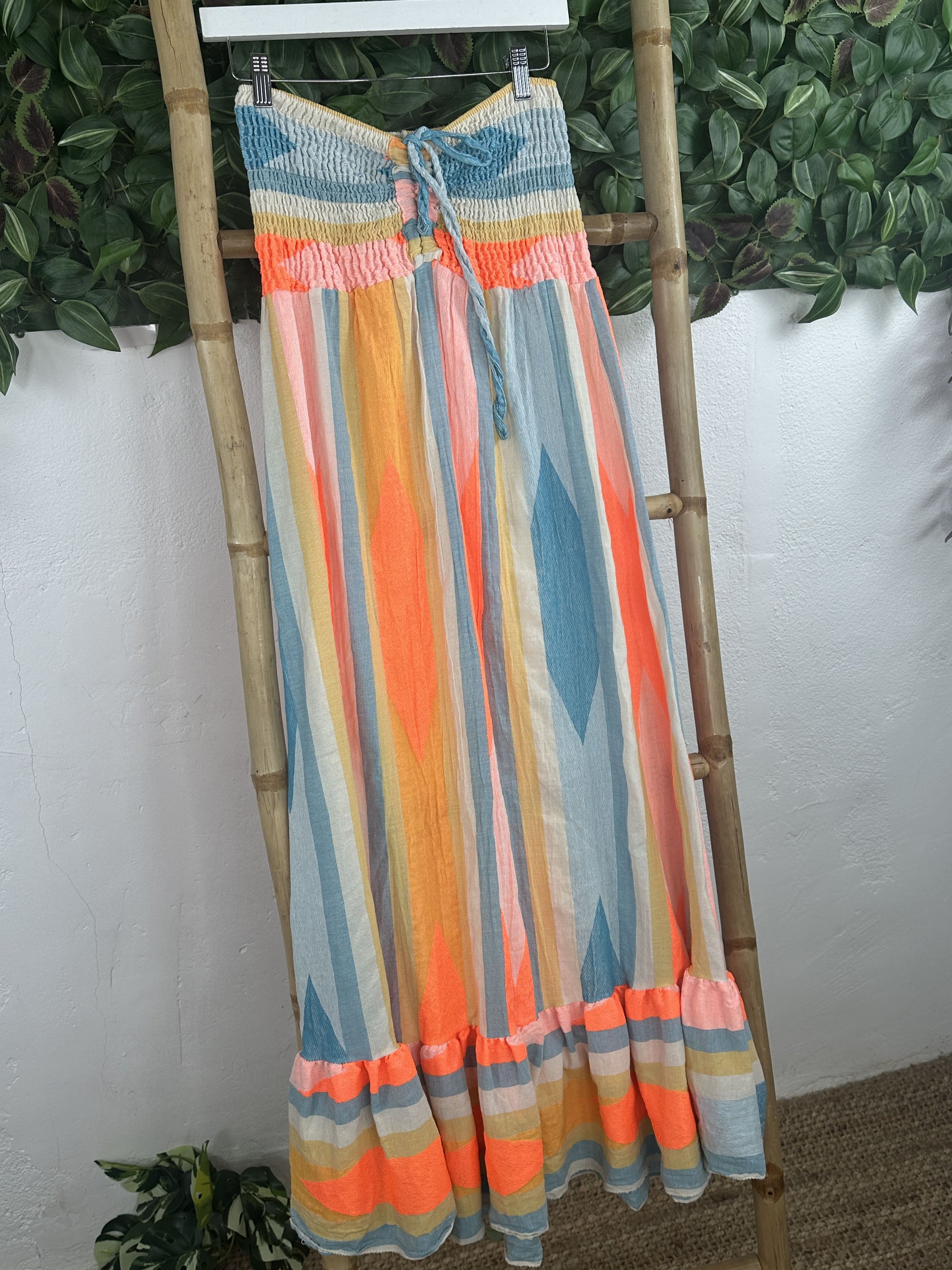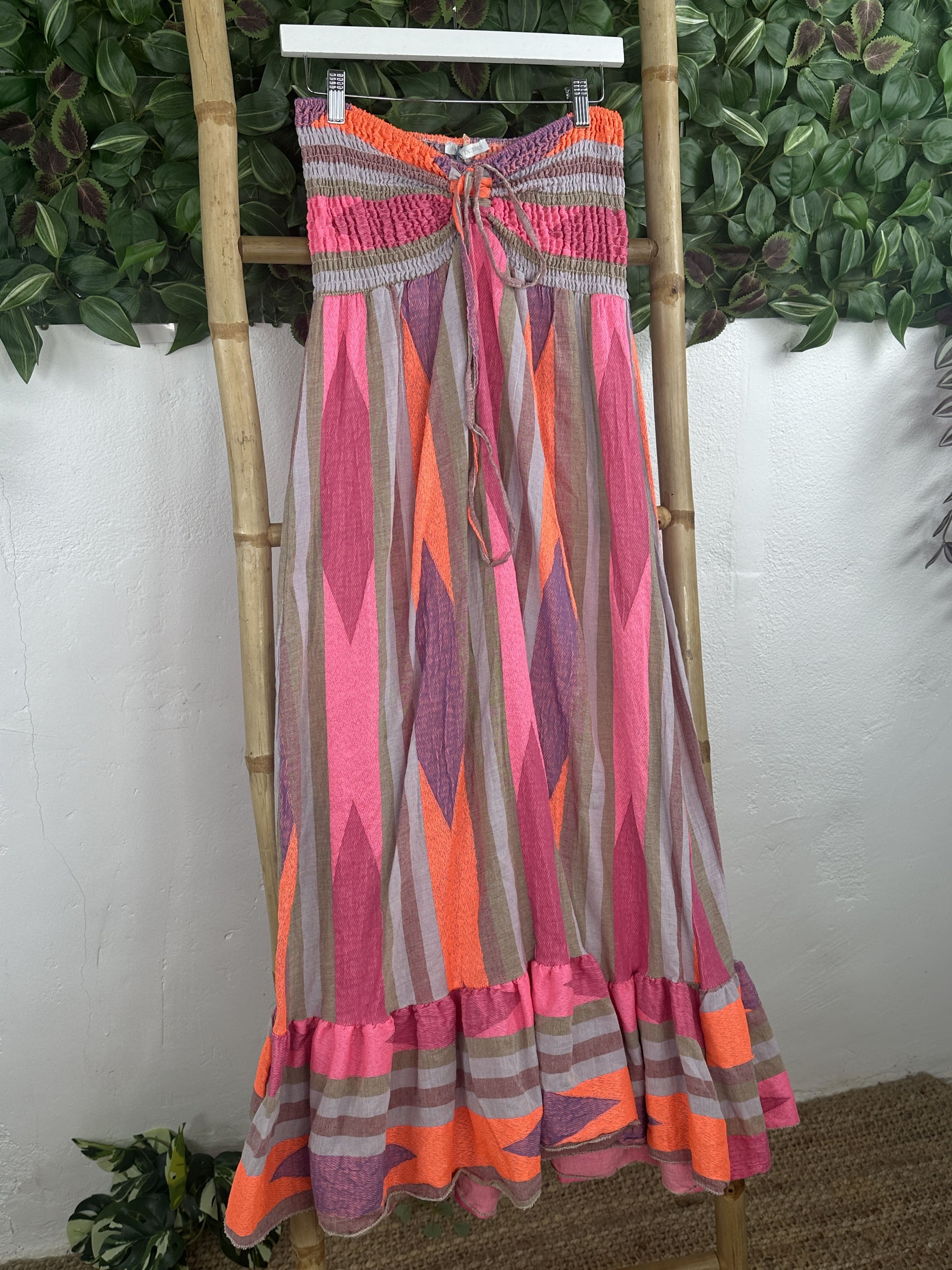 El estampado es de rayas naranja, rosa y blanco.