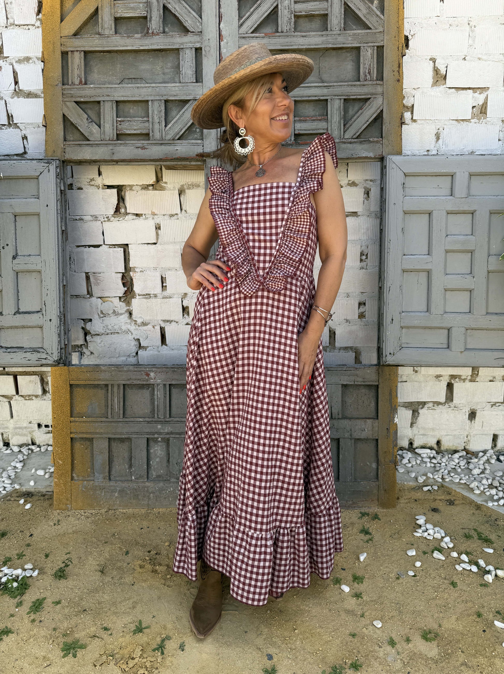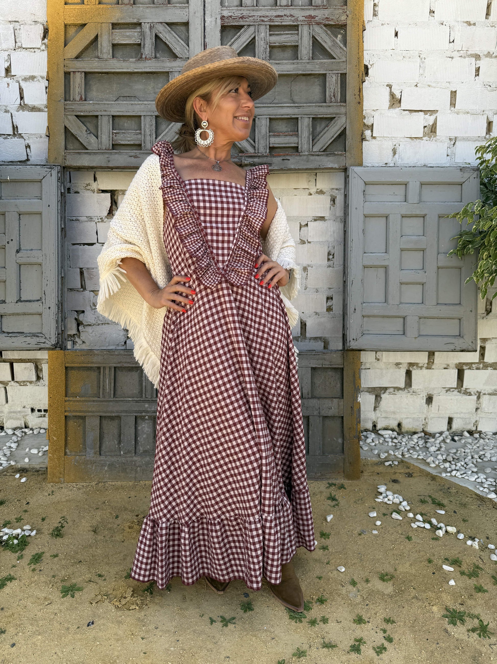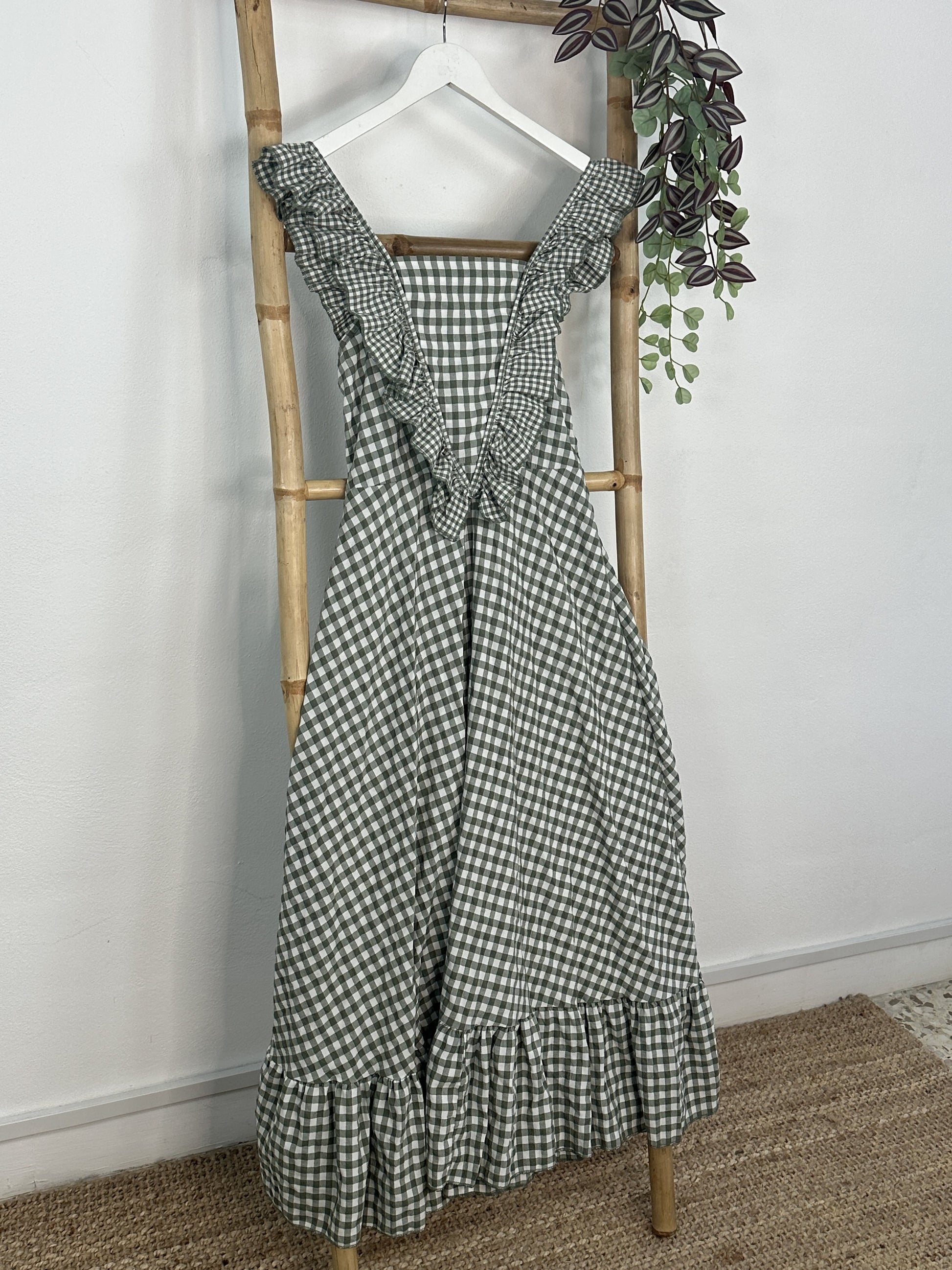 Bata rociera larga de tirantas con estampado de cuadros vichy verde francés y blanco.