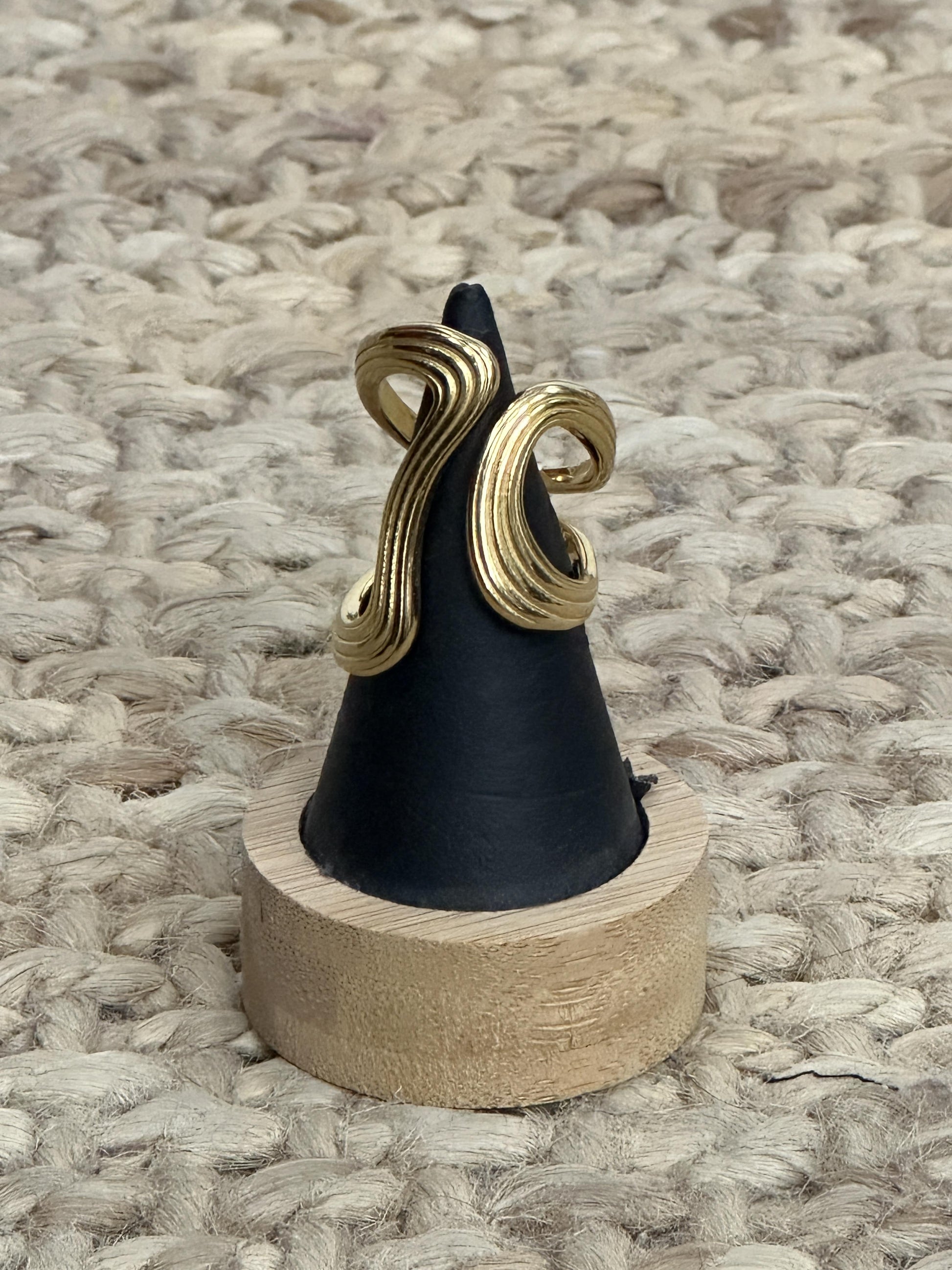 Anillo con apertura superior y forma irregular con relieve de rayas.