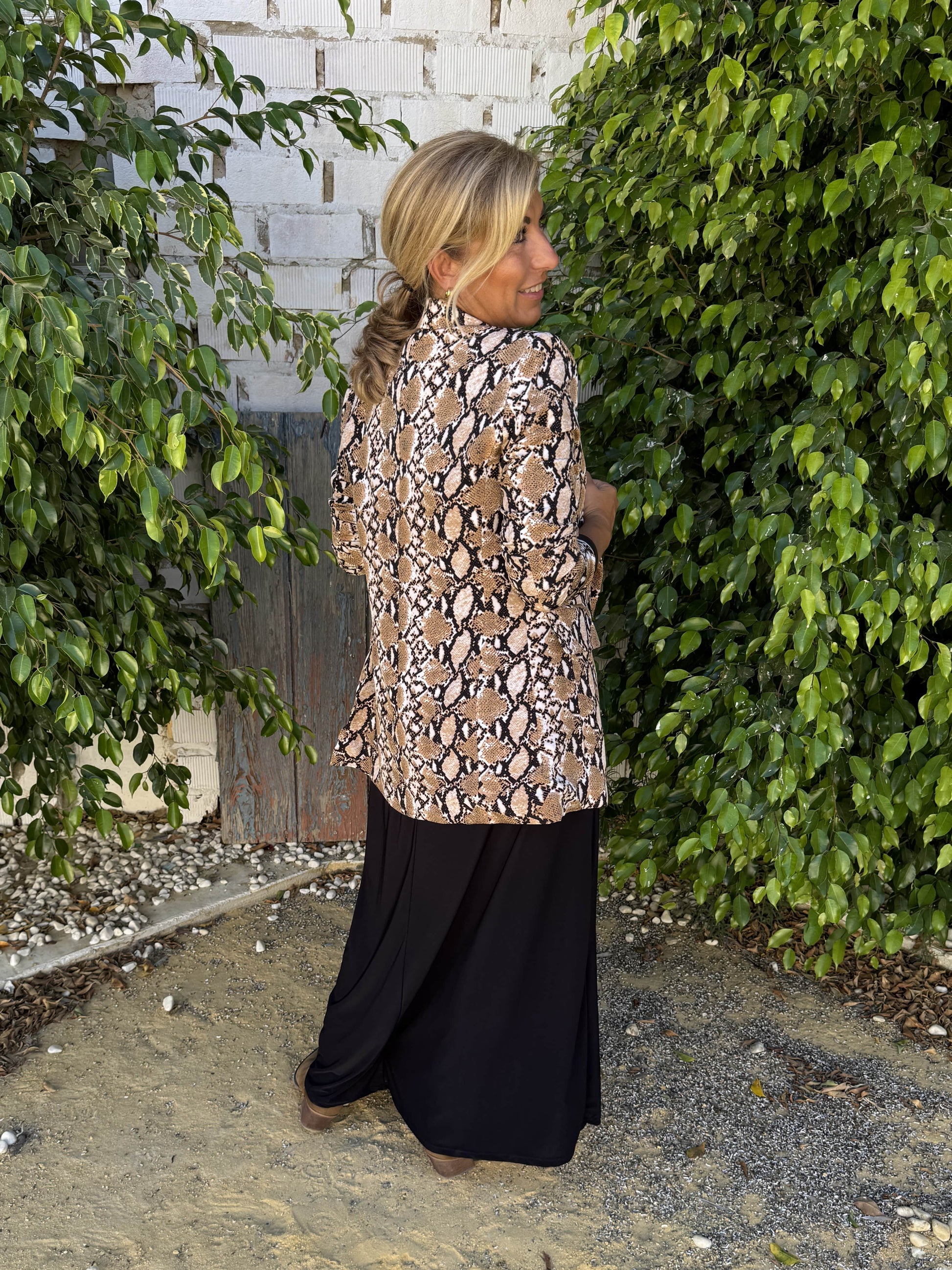 Jaqueta americana feminina estampada com estampa de cobra animal em camelo branco e preto.
