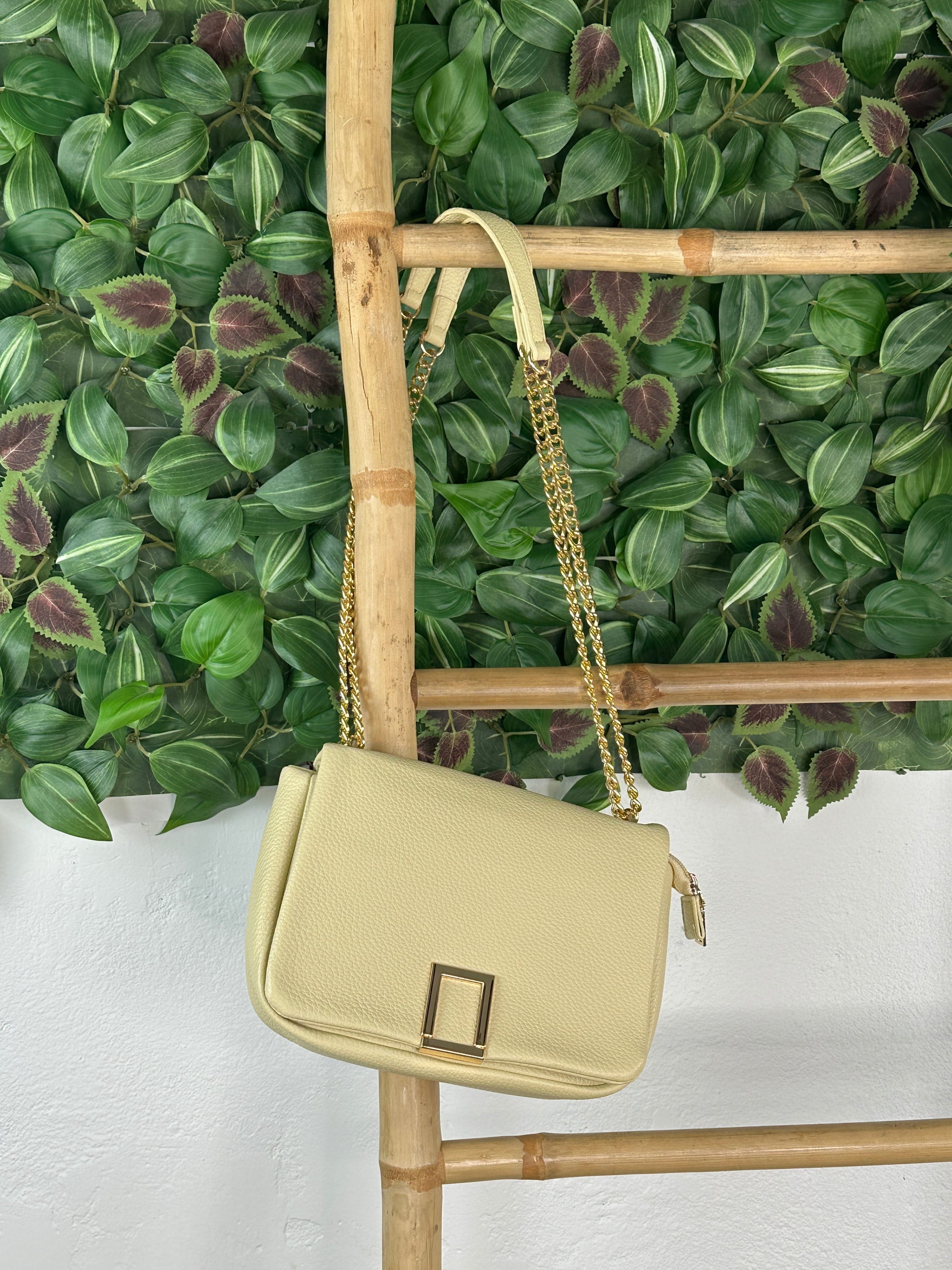 Cadena dorada con almohadilla del mismo tejido del bolso para poder colgarlo de bandolera.