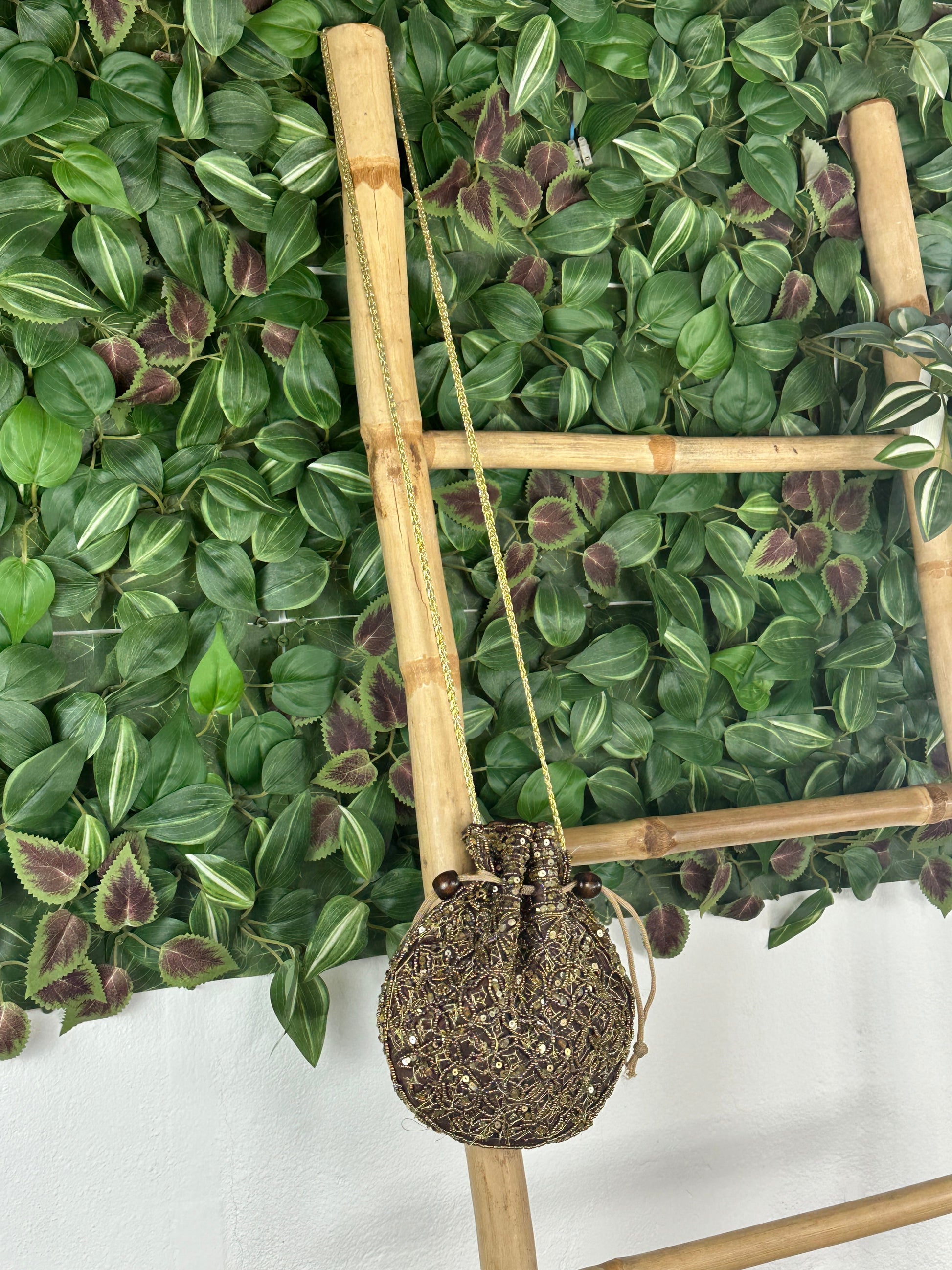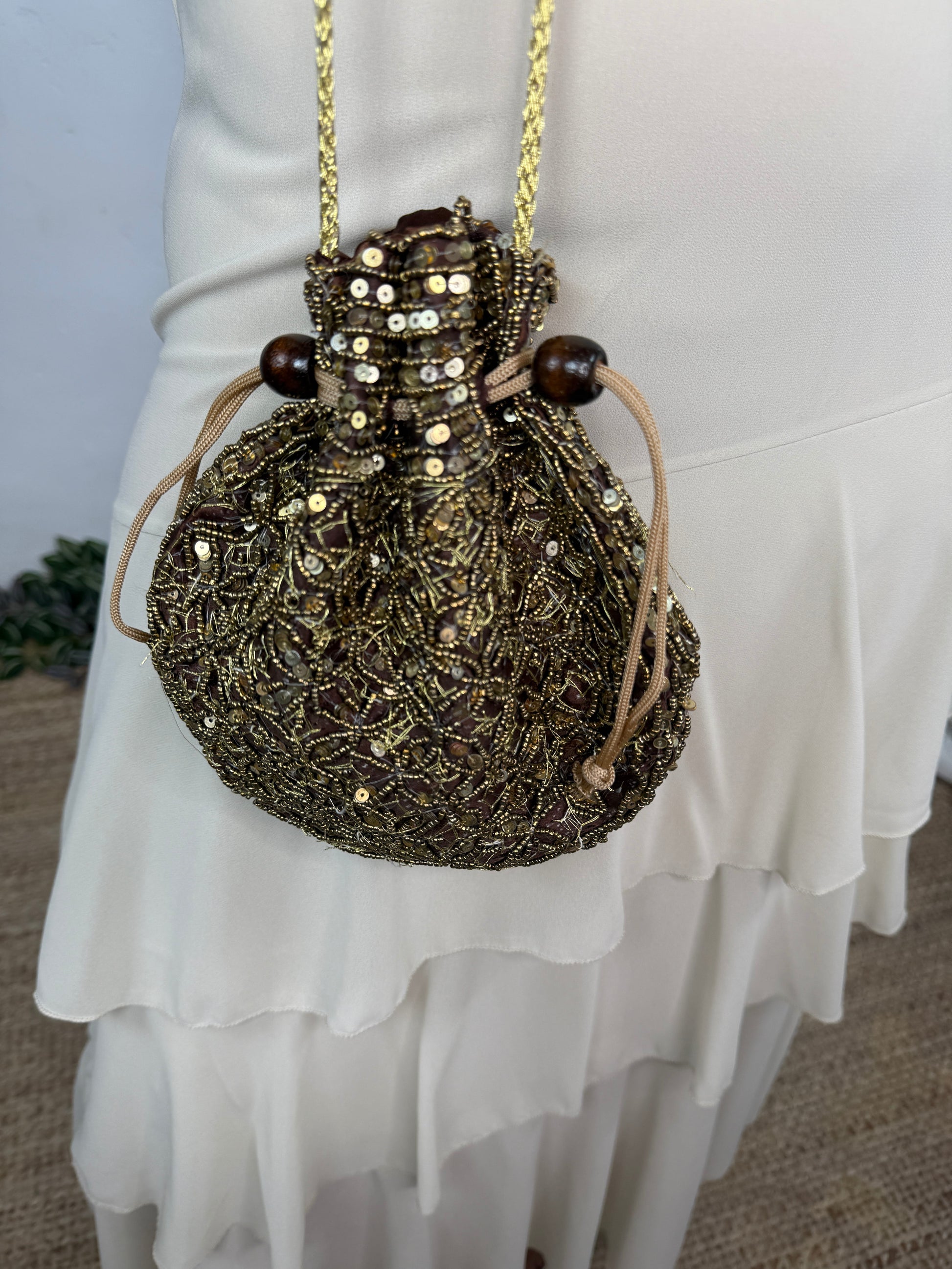 Disponible en color marrón con abalorios dorados.