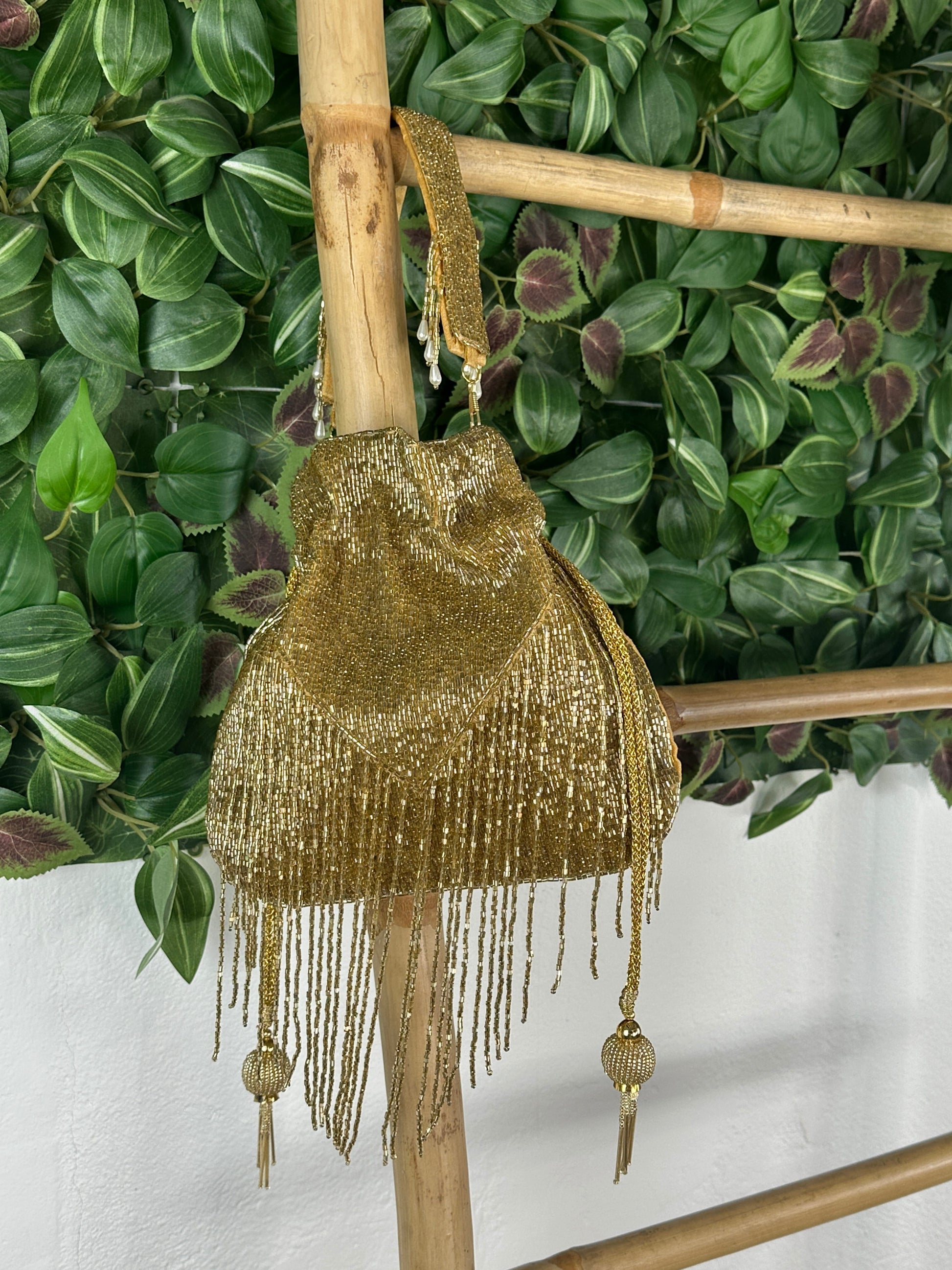 Bombonera bordada con abalorios y asa de mano.