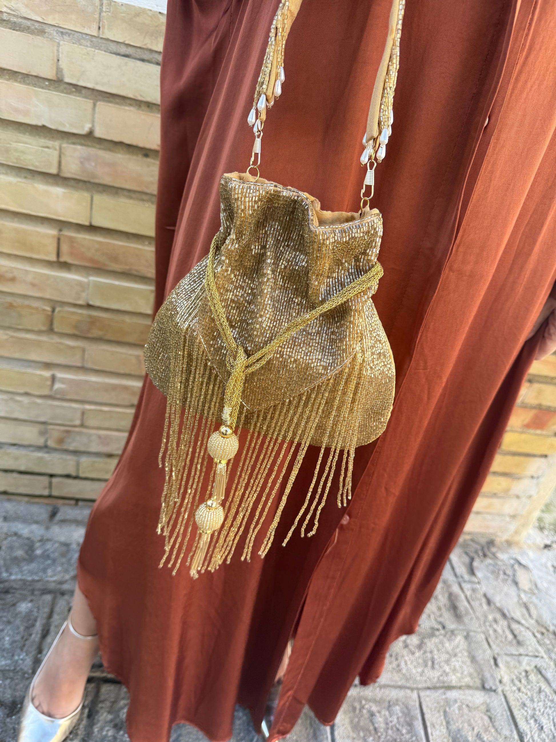Dibujo delantero en forma de triángulo con flecos de abalorios.