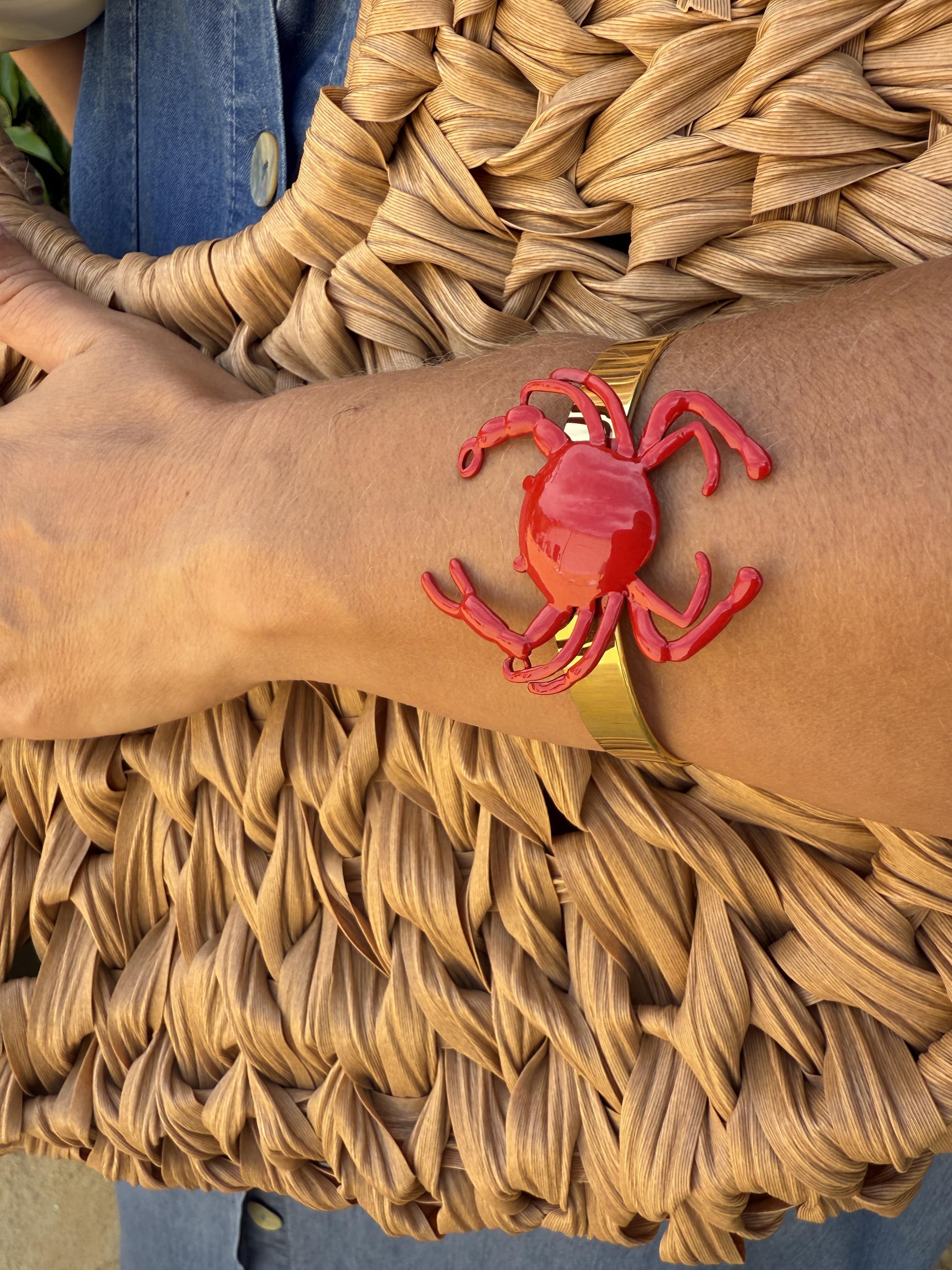 Brazalete de acero dorado con abalorio en forma de cangrejo.