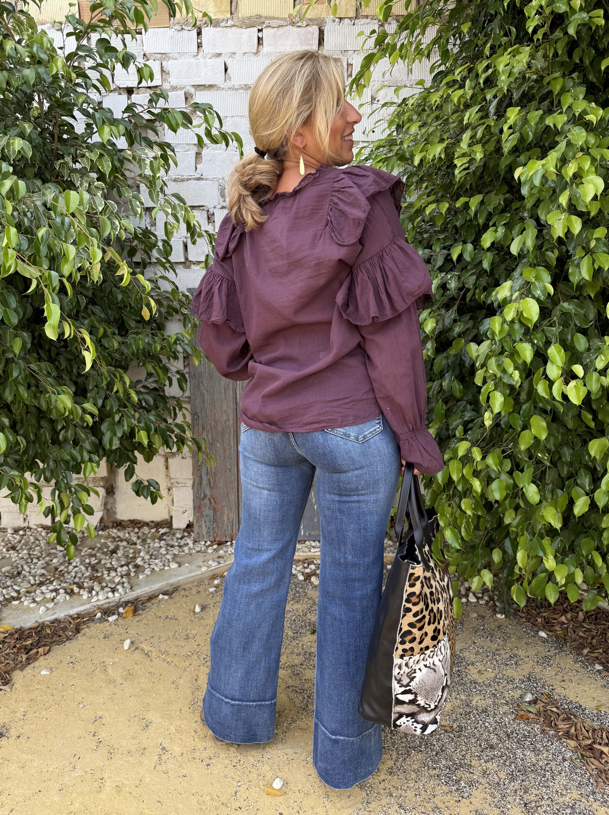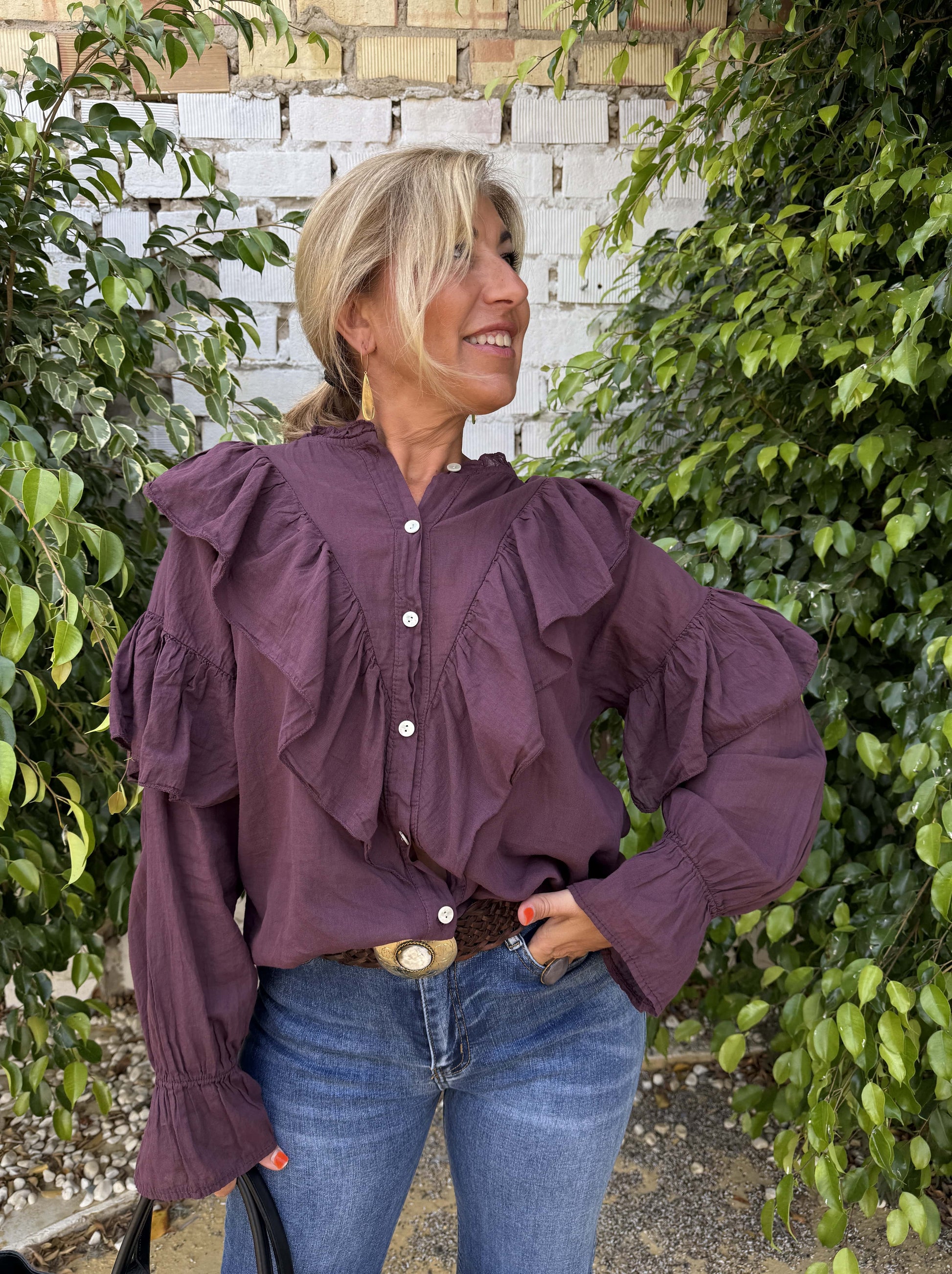 Camisa de algodón con volantes en forma de pico en parte delantera.