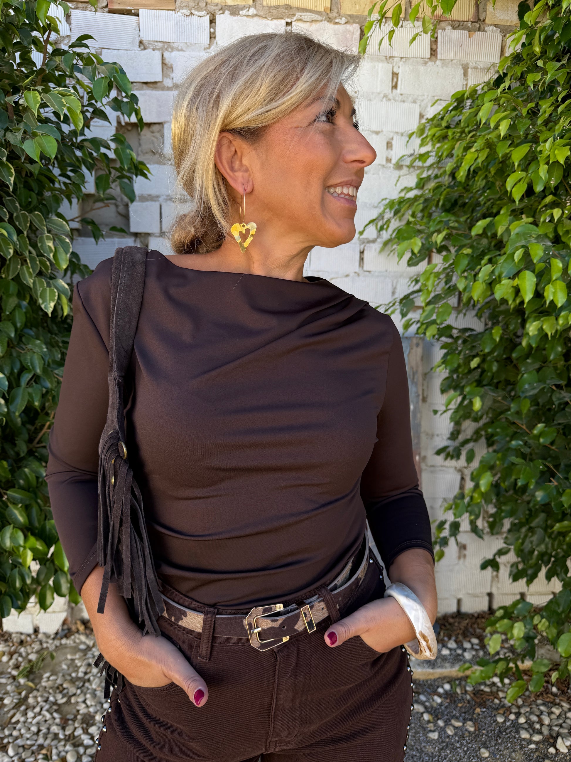 Top básico de mujer con frunce en el hombro y en la cintura.
