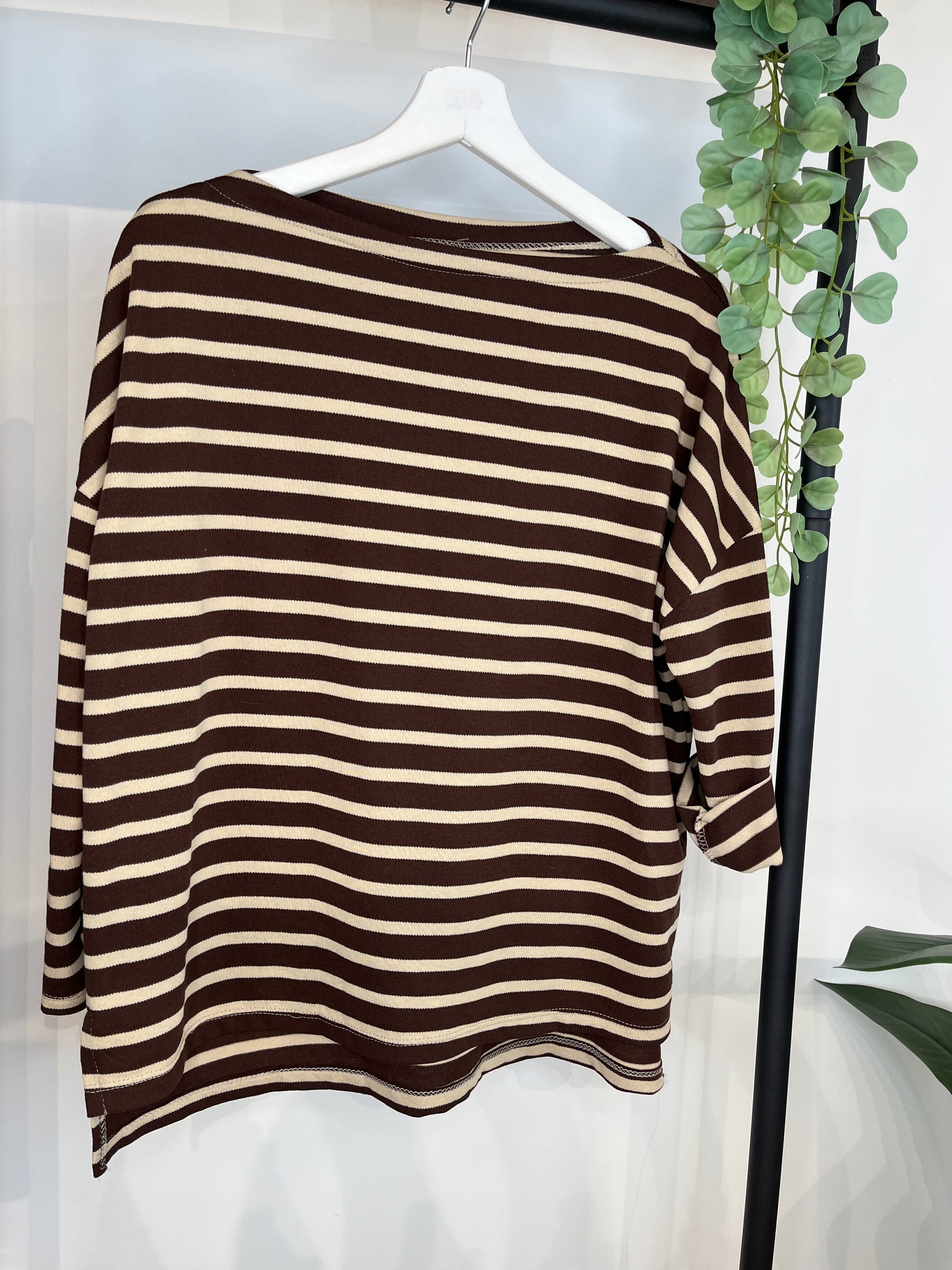 Descubre la elegancia atemporal de esta camiseta de rayas con cuello barco y manga larga. El contraste entre el marrón cálido y el burdeos profundo crea un look sofisticado perfecto para cualquier ocasión. Su corte clásico y versátil se adapta a tu estilo personal, mientras que la comodidad de la tela garantiza que la llevarás una y otra vez. Una prenda imprescindible que combina tendencia y practicidad en una sola pieza.